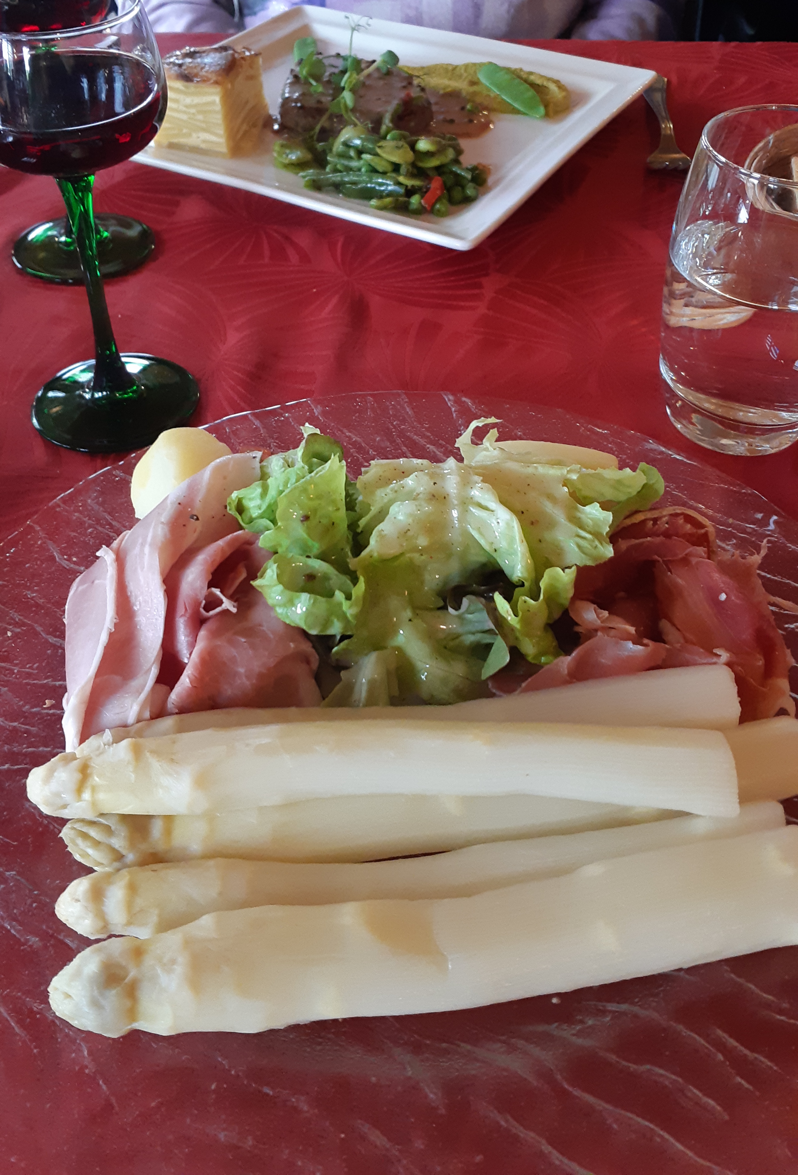 En entrée nous avons dégusté foie gras, terrine, St Jacques et thon snacks, le tout arrosé d'un arrangement Viognier / Chardonnay excellent. Le plat de résistance était un veau en sauce à la crème et aux champignons très agréable