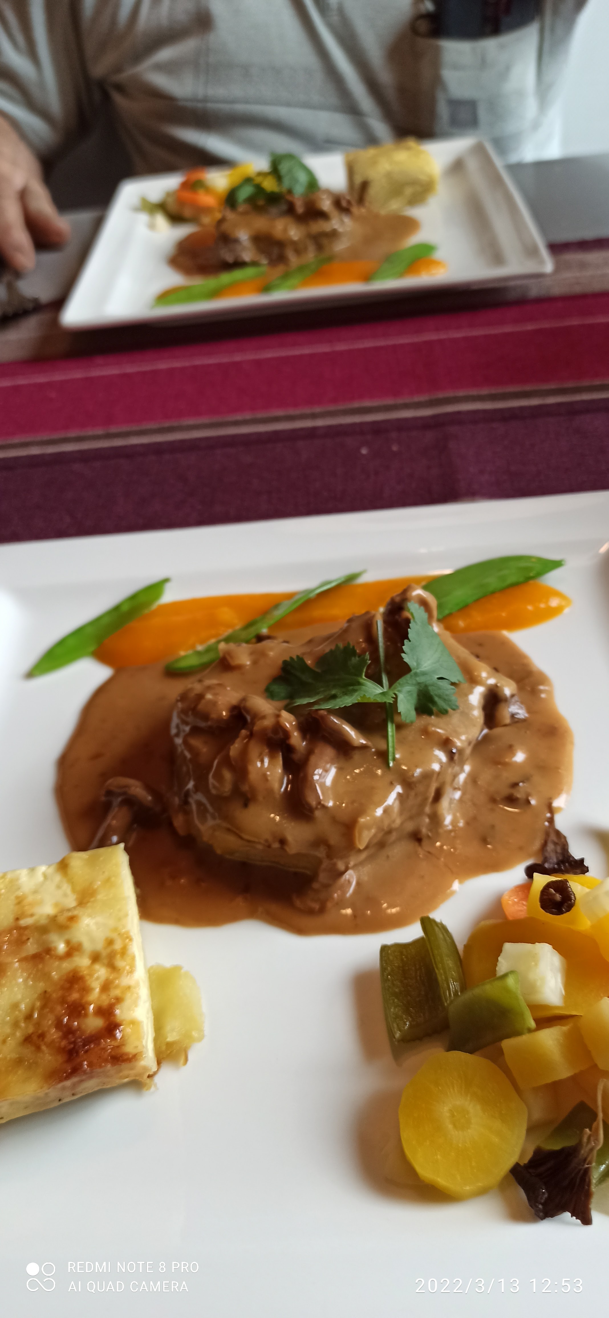Très bon mais petites potions. Plat avec gratin dauphinois mais sur l'assiette, il y avait des frites.