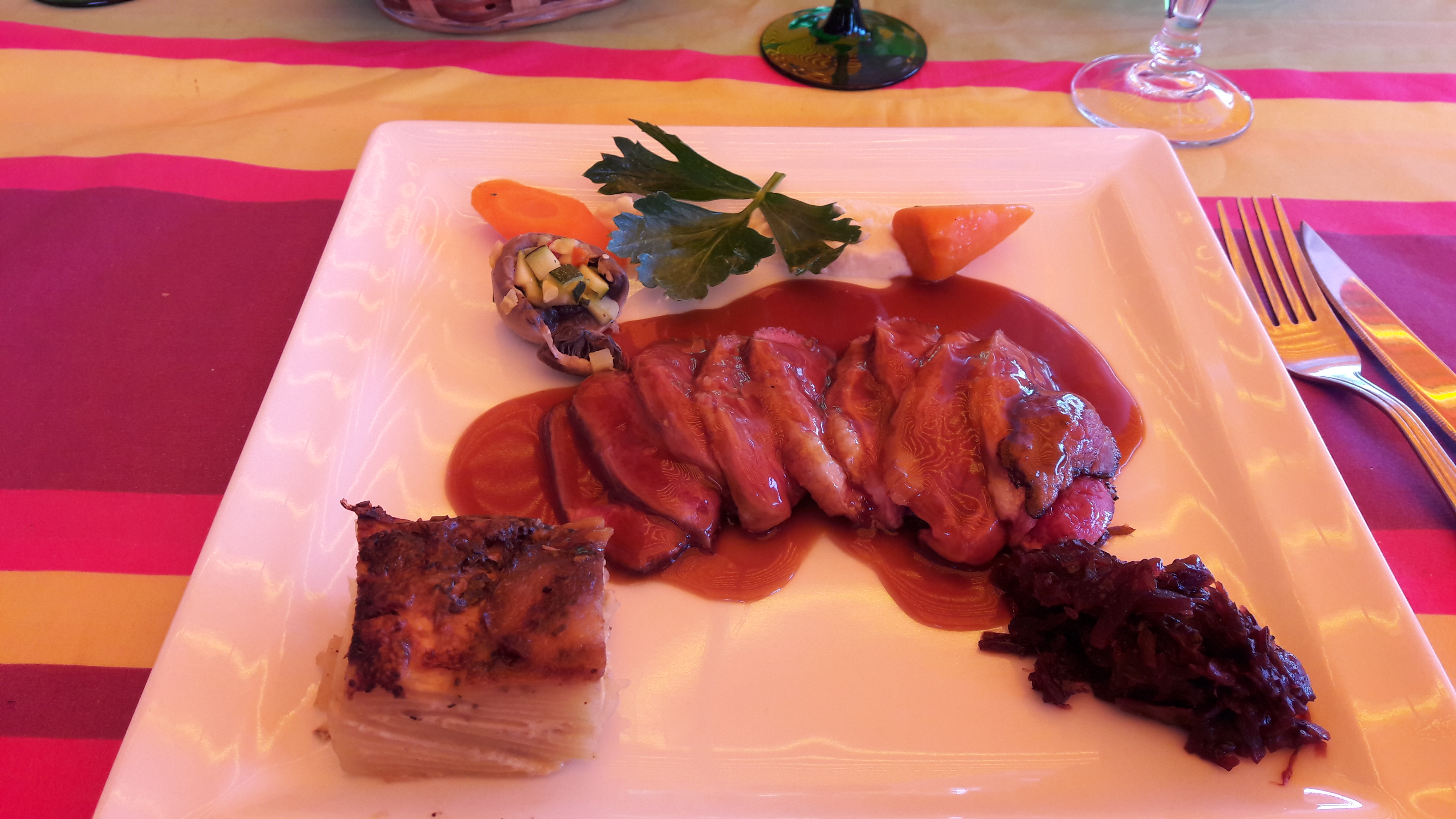 De passage dans cette jolie ville en revenant du marché de Noël, nous cherchions un restaurant sans trop de chichi et ben. .. Une très très belle surprise, nous nous sommes régaler !!!. De l amuse bouche au plat principal un vrai délice. Même le vin était très bon. Nous avons passé un agréable moment chez vous. Dommage que nous soyons si loin, car nous serions très certainement revenu goûter les autres mets de la carte qui oarressent délicieux aussi. L agneau....une merveille, tant au goût, qu à la tendresse du morceau. Les légumes croquants ont apporter de la fraîcheur au plat! Une réussite. Normal que le restaurant , malgré son emplacement assez cachés est assez fréquenté.
