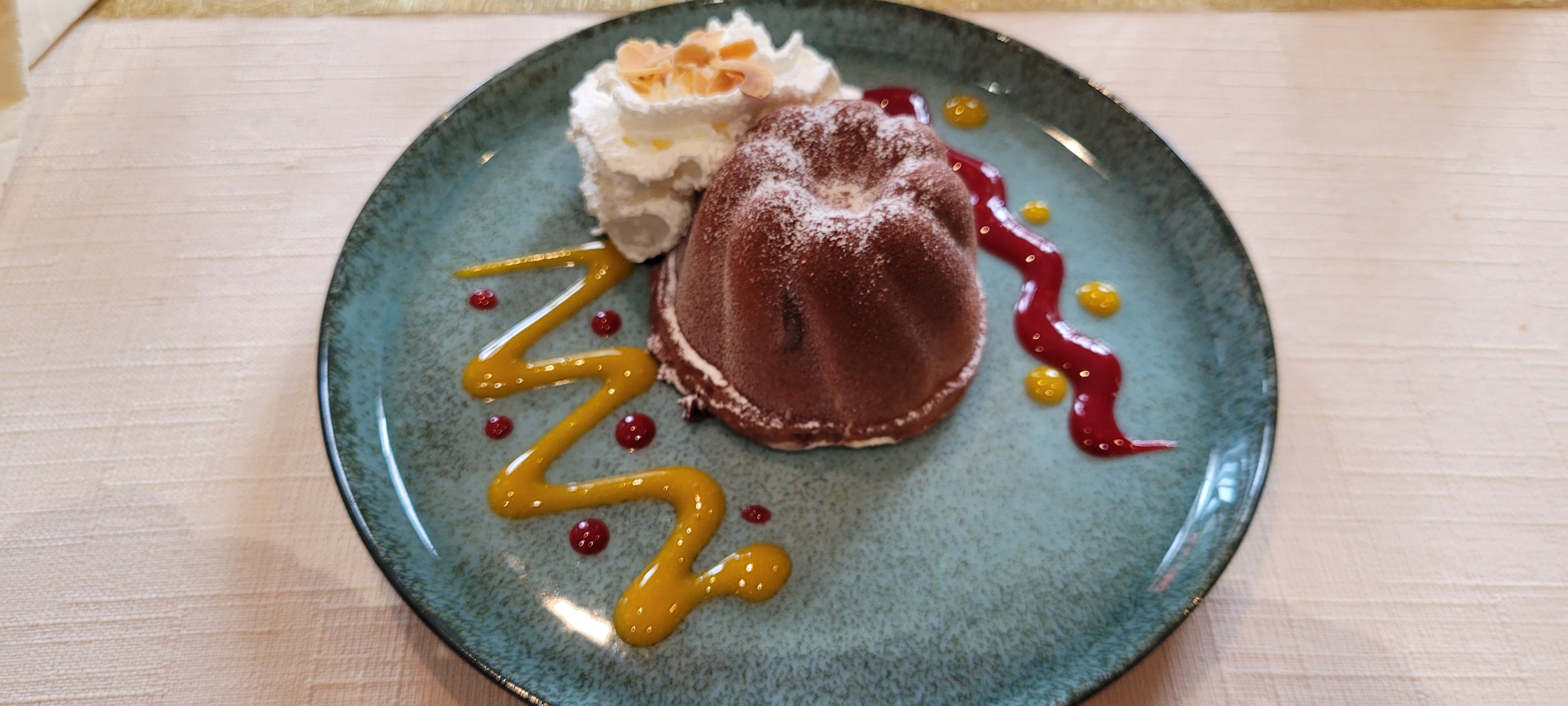 A cause du coronavirus, on n'a pas pu goûter aux plats du restaurant. Mais on a passé une nuit dans l'hôtel. La salle de bain était jolie et propre rien à dire mais la chambre quand même un peu de déco ne ferait pas de mal. Peinture triste et grise. Franchement on a pas aimé la chambre mais elle était quand même propre.