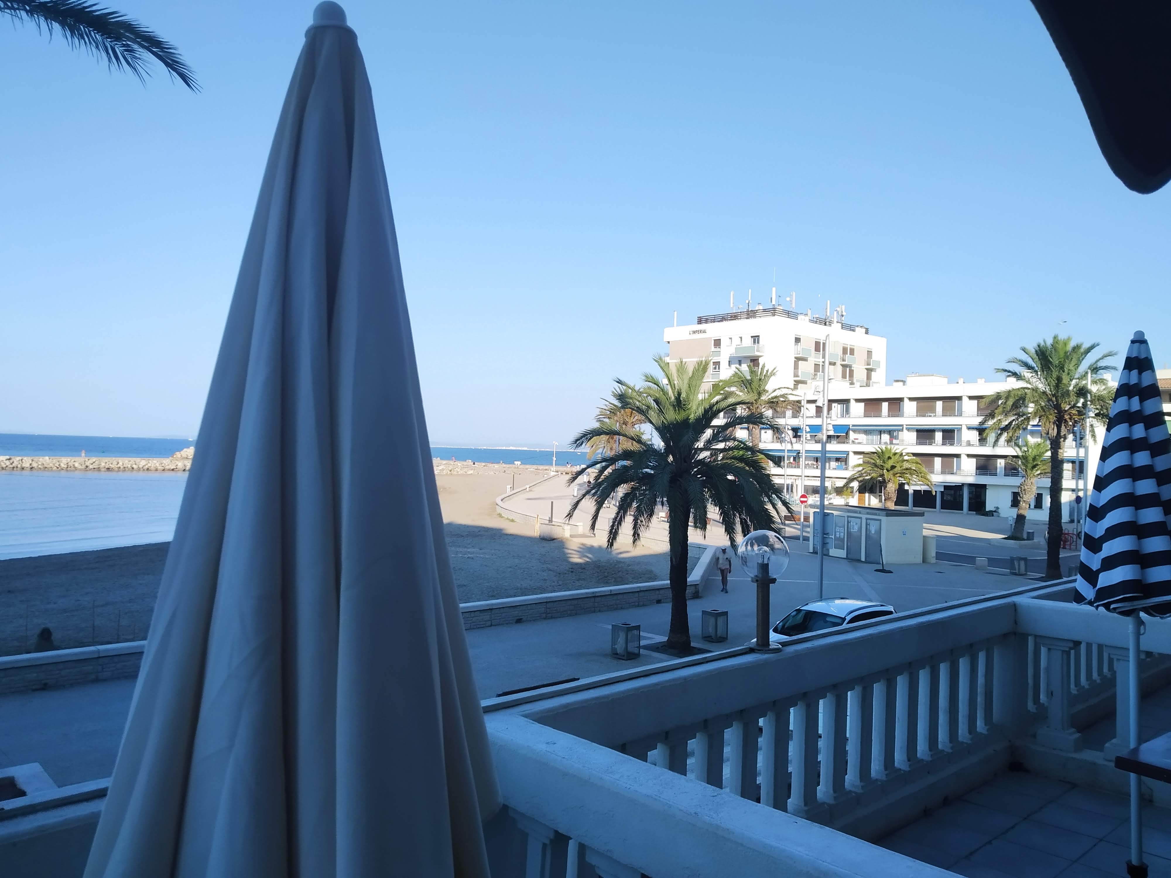 La terrasse de cet hôtel - restaurant a la vue directe sur la plage et la mer au Grau du roi. On y mange très bien, servi par un personnel très pro et gentil.