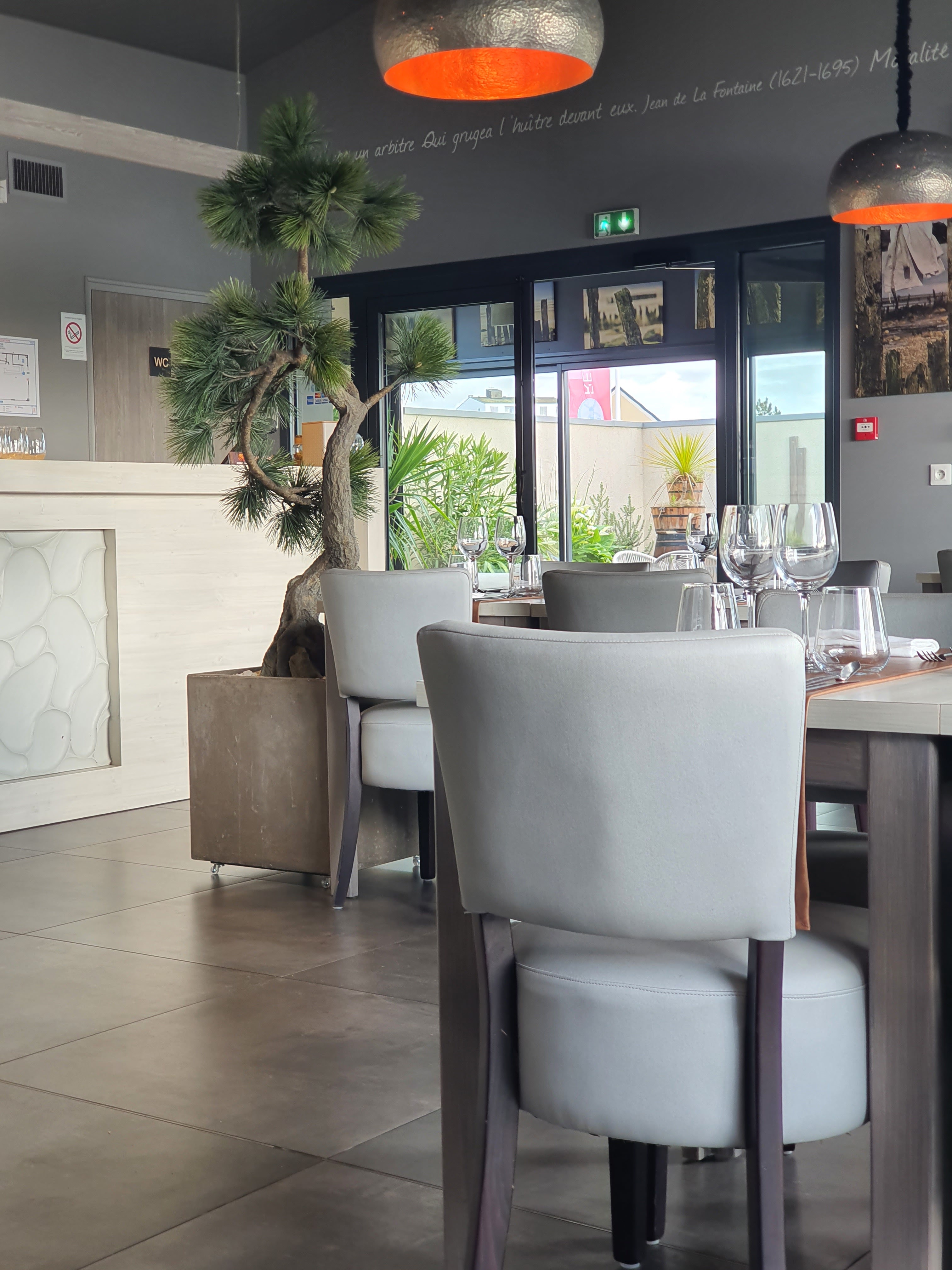 Très belle ambiance au bord du parc à huîtres... Le cadre contemporain est très sympathique même si la météo n'était guère engageante en ce dimanche de mars. La tablée familiale a été très bien accueillie par une équipe souriante et professionnelle. Les attentions ont été nombreuses tout au long du repas. La carte est variée et inventive ; elle fait - on s'en doute et ce serait dommage en ces lieux - la part belle aux produits de la mer. Pour moi qui ne goûte guère le poisson, mes choix se sont portés sur le foie gras mi-cuit en entrée (mention particulière pour la compotée d'oignons et le condiment à base de piquillos) et le bœuf au jus sombre. Tout est bien réalisé, les goûts sont justes et la présentation soignée. Le dessert du jour - biscuit Mathilde - finira de combler nos palais. Très bien accompagné jusqu'au café, l'ensemble des convives a apprécié le repas et s'est juré de revenir goûter le charme de la terrasse en été.