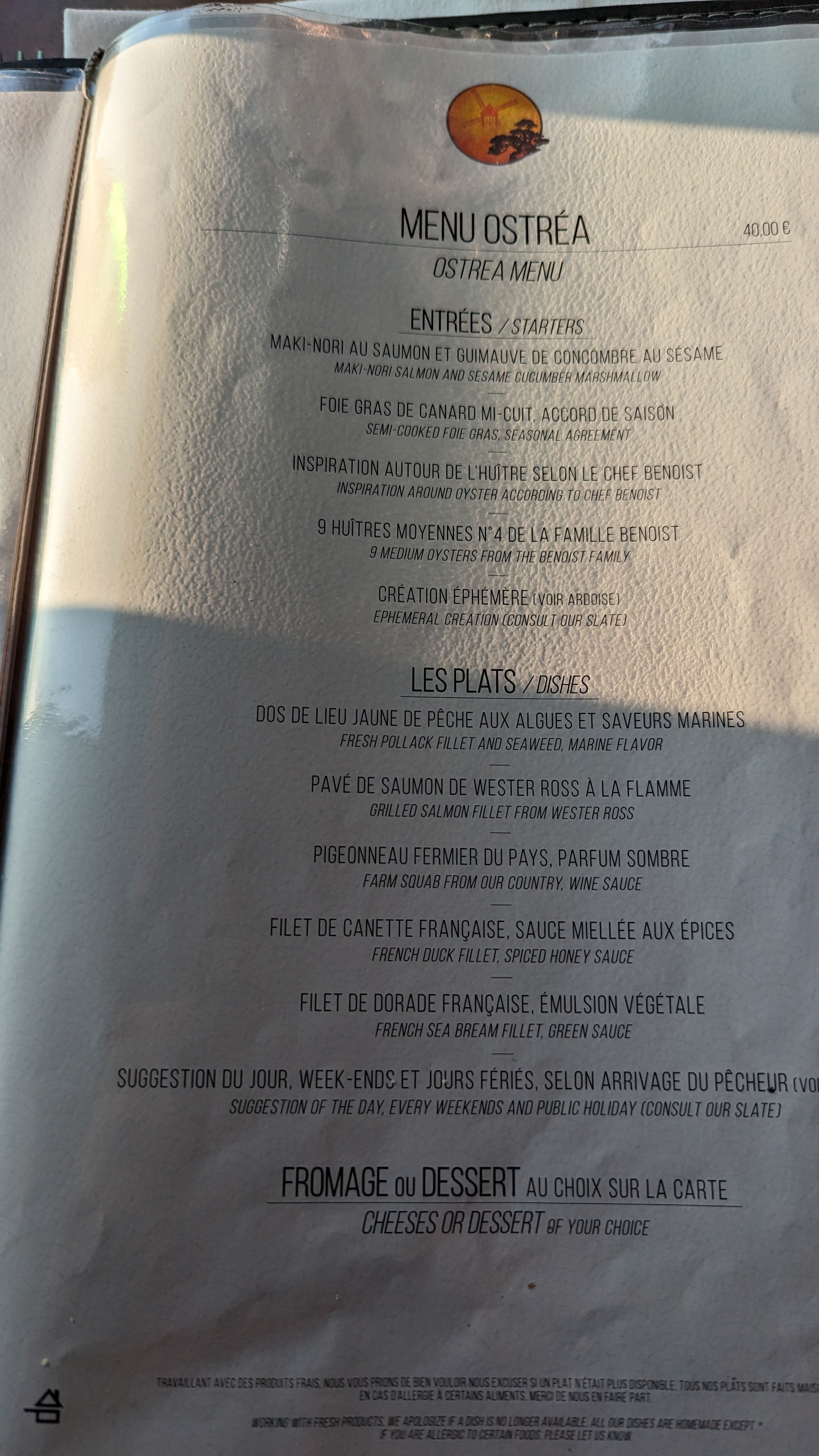 Je viens depuis l'ouverture, le prix du menu ostrea a régulièrement augmenté, ce qui est normal (27,50 au début). Cependant quelle surprise de voir que ce menu est passé à 40 € cet été pour exactement les mêmes prestations. Ça reste un très bon restaurant, mais compte tenu du prix je n'irai plus.