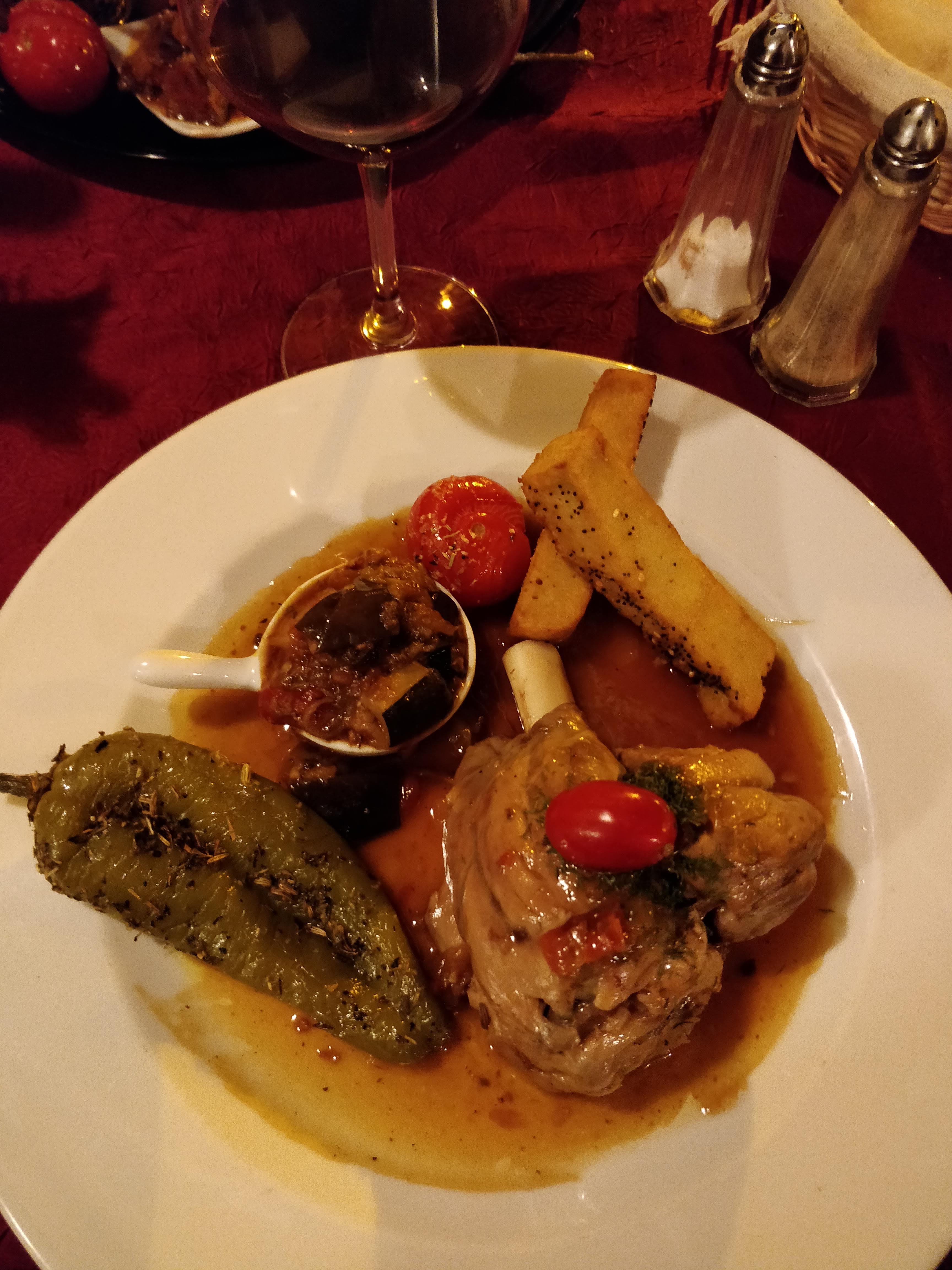 Sur la terrasse, vous pouvez vous asseoir confortablement et - malgré la situation centrale - au calme avec vue sur le centre pittoresque de la ville. Il n'y a qu'un seul menu, mais il offre suffisamment de choix pour chaque plat. Apparemment, le restaurant est principalement visité par des Britanniques - la cuisine est plus adaptée aux goûts britanniques qu'aux goûts allemands ou français. Les portions sont (trop) grandes. La viande est noyée dans des sauces (en fait pas mauvaises en goût) mais très grasses. Le steak grillé (à base de bonne viande) était dans une sauce au vin rouge et à l'oignon qui aurait mieux accompagné un bœuf bourguignon. Le dessert était également puissant et très anglais, mais c'est finalement une question de goût. Le service était sympathique, mais parfois médiocre. Finalement, j'ai voulu boire une poire Williams et on m'a répondu qu'ils ne l'avaient pas - ils n'avaient aucune des autres variétés populaires (Framboise, Calvados, Cognac) ; tu n'as pas d'alcool du tout. Alors que je pensais que c'était impossible, le jeune serveur (compétent ?) est revenu peu de temps après et m'a rapporté qu'il avait découvert une bouteille de Calvados en parcourant la Réserve. Finalement, il a apporté un verre de cognac aux 3/4 plein avec du Calvados (beaucoup trop). Dommage. Dans l'ensemble, le prix était correct - pour 2 menus + apéritif et 1 bouteille de vin, etc. 107 €. Conclusion : prix correct, bon emplacement, portions énormes, mais plus pour les gourmands que les gourmets.
