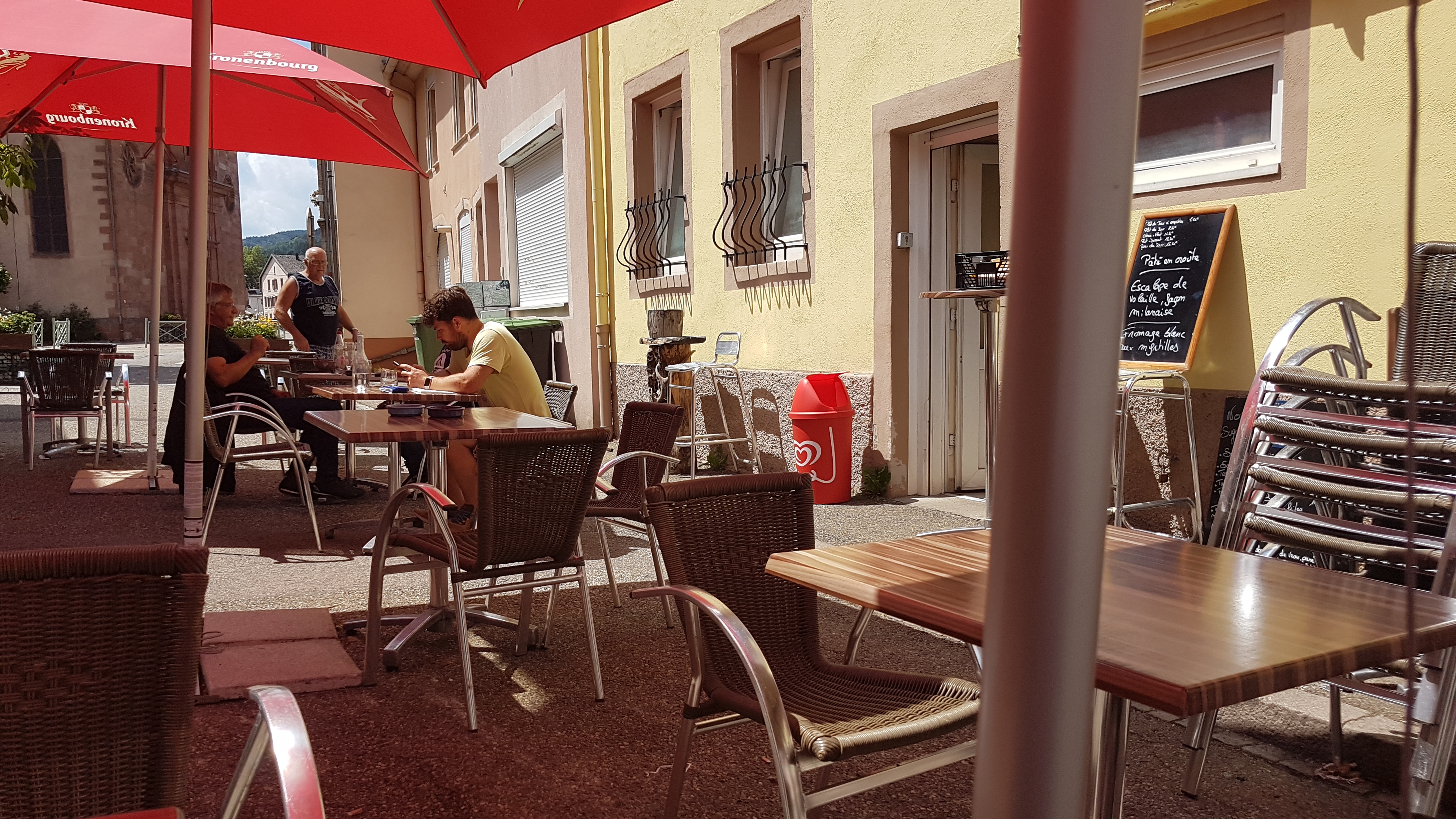 Terrasse sympa aménagée derrière le bâtiment, accessible aussi depuis la place du Marché, au calme et loin du bruit de la circulation routière dans Schirmeck. Service souriant et rapide pour boire un verre entre amis. La meilleure terrasse de Schirmeck !