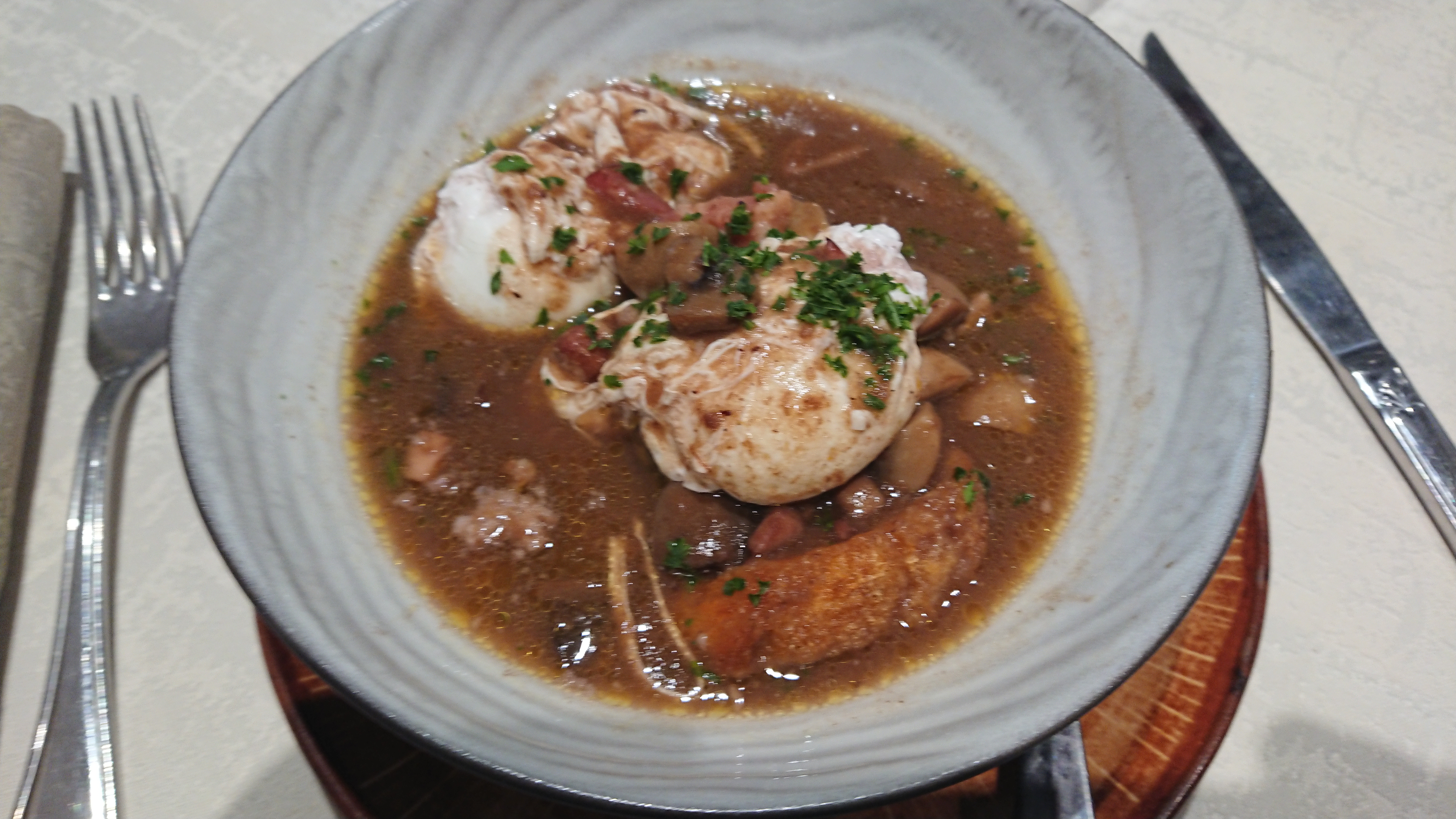 J’y suis allée deux fois , La première fois, je me suis régalée avec les œufs au vin jaune et à la crème ; et j’ai été un peu déçue la seconde fois, la viande était un peu dure , mais c’est un restaurant que je recommande car la qualité y est et l’hygiène aussi ; le service est très bien organisé bien qu’un peu froid. Une valeur sûre cependant