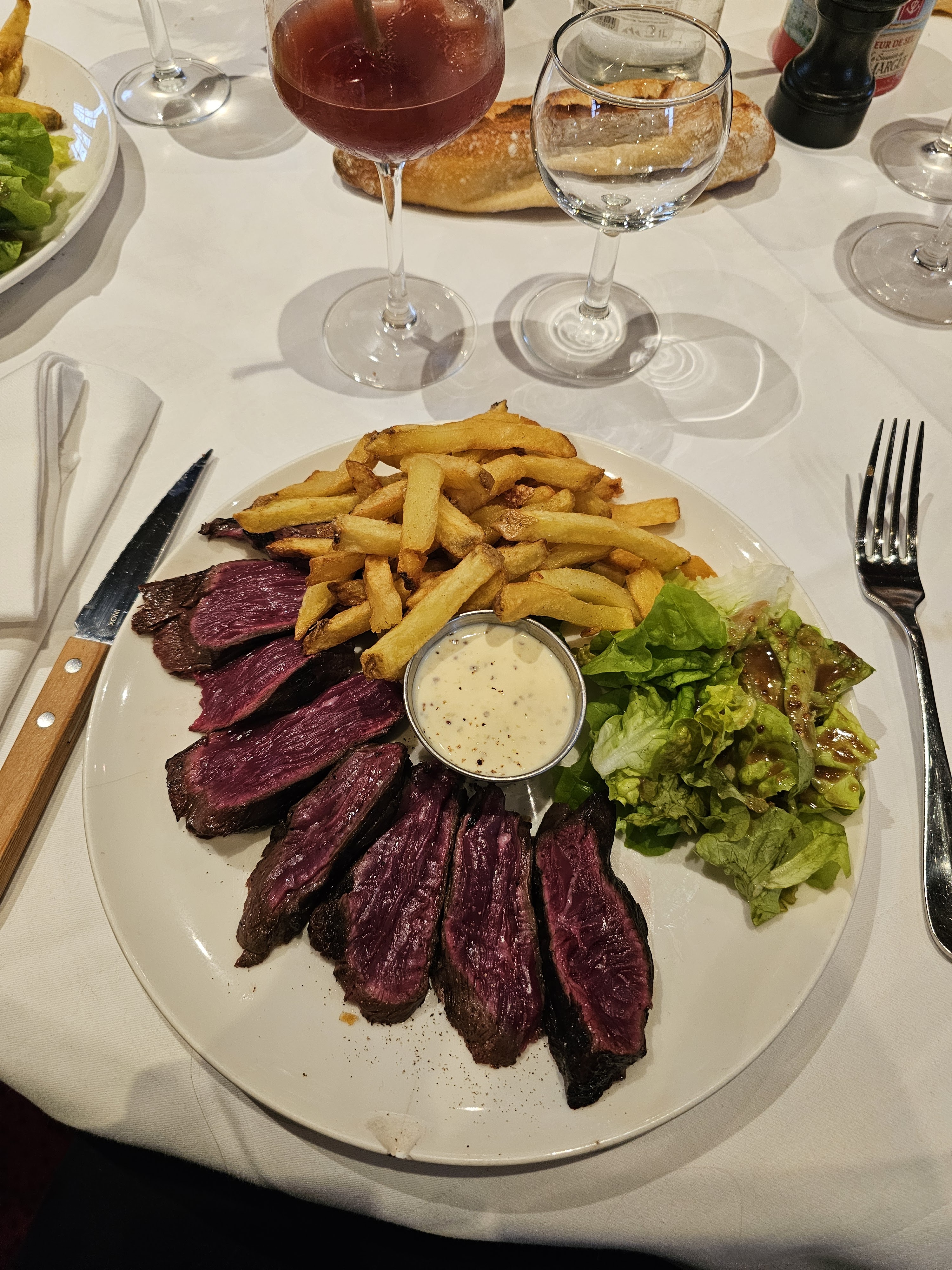 Prise en charge rapide des serveurs des notre arrivée Installation sur une table, ou le pain était déjà présent et sec. La commande a été passée assez rapidement. Les boissons ont été servis, mais pas la carafe d'eau qui a été demandé à la commande. Nous avons commandé la côte de bœuf maturée avec des frites. La côte de bœuf est arrivée mais pas les couverts nécessaires à la coupe. Toutes les tables autour avaient un couteau à viande sauf la notre. Je trouve dommage la négligence qu'il y a eu envers notre table.