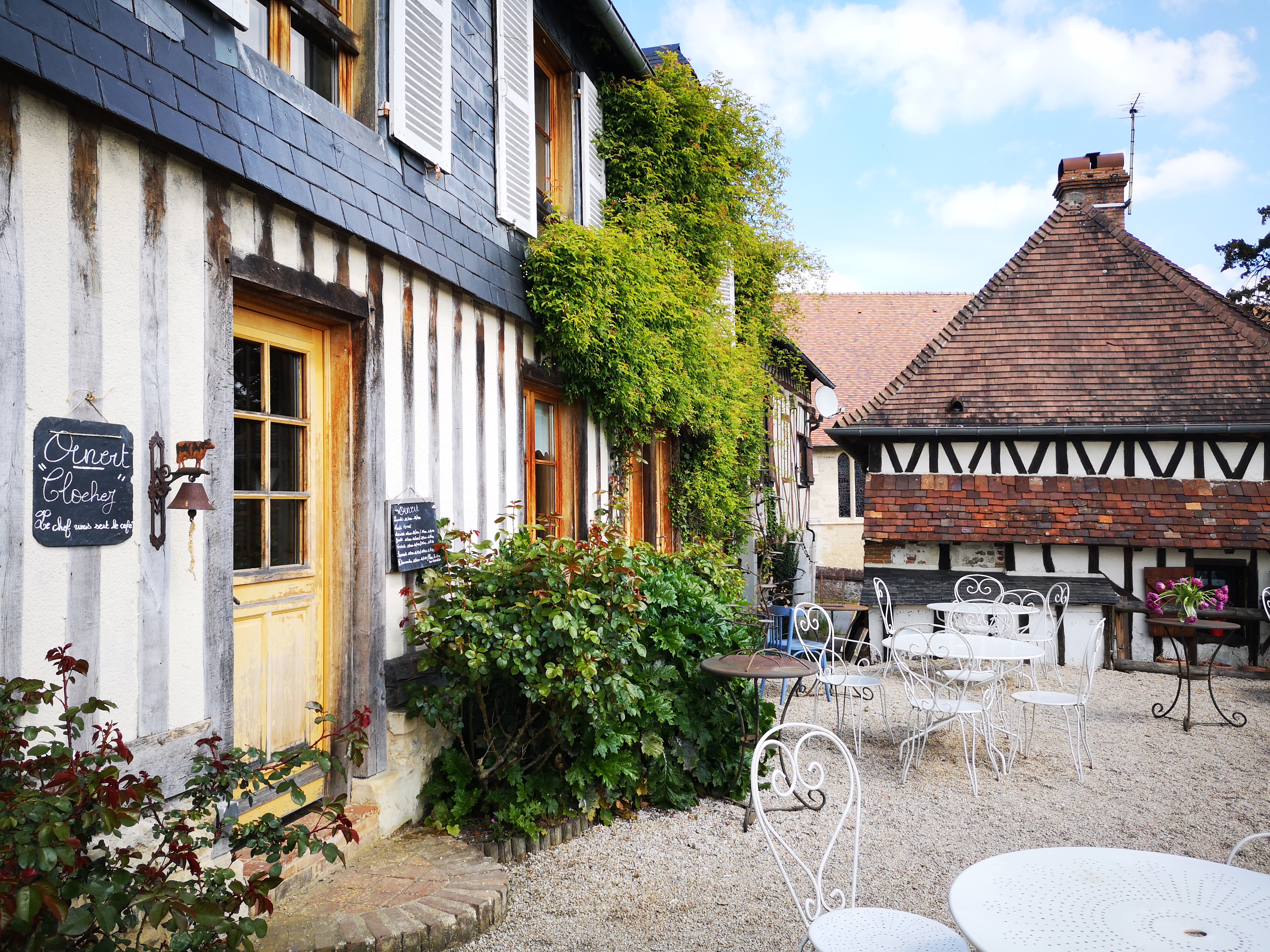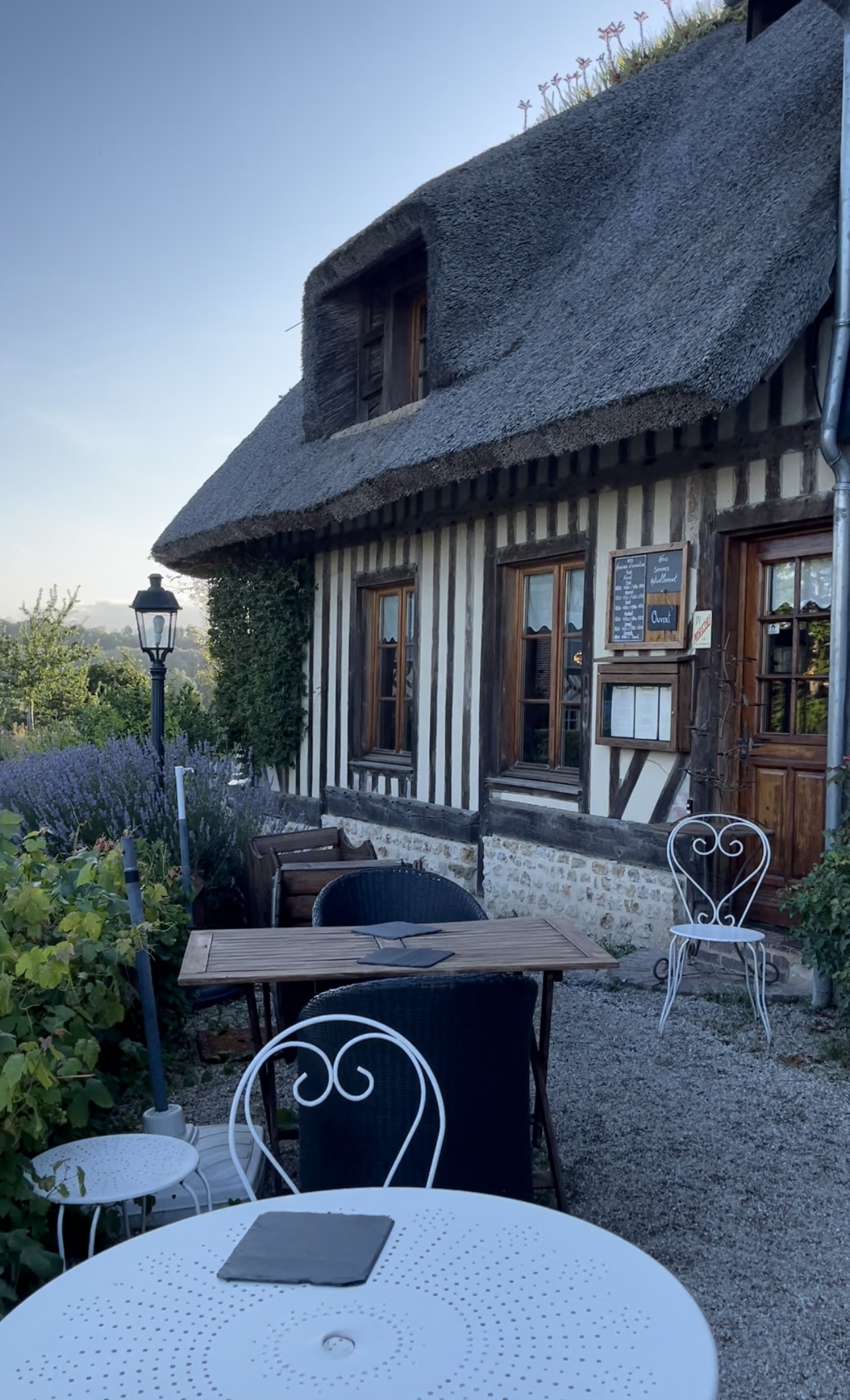 Une terrasse avec vue sur la campagne, les maisons à colombages et les toits de chaumes. Tranquille, au calme. Et en plus on y mange bien à un prix raisonnable.