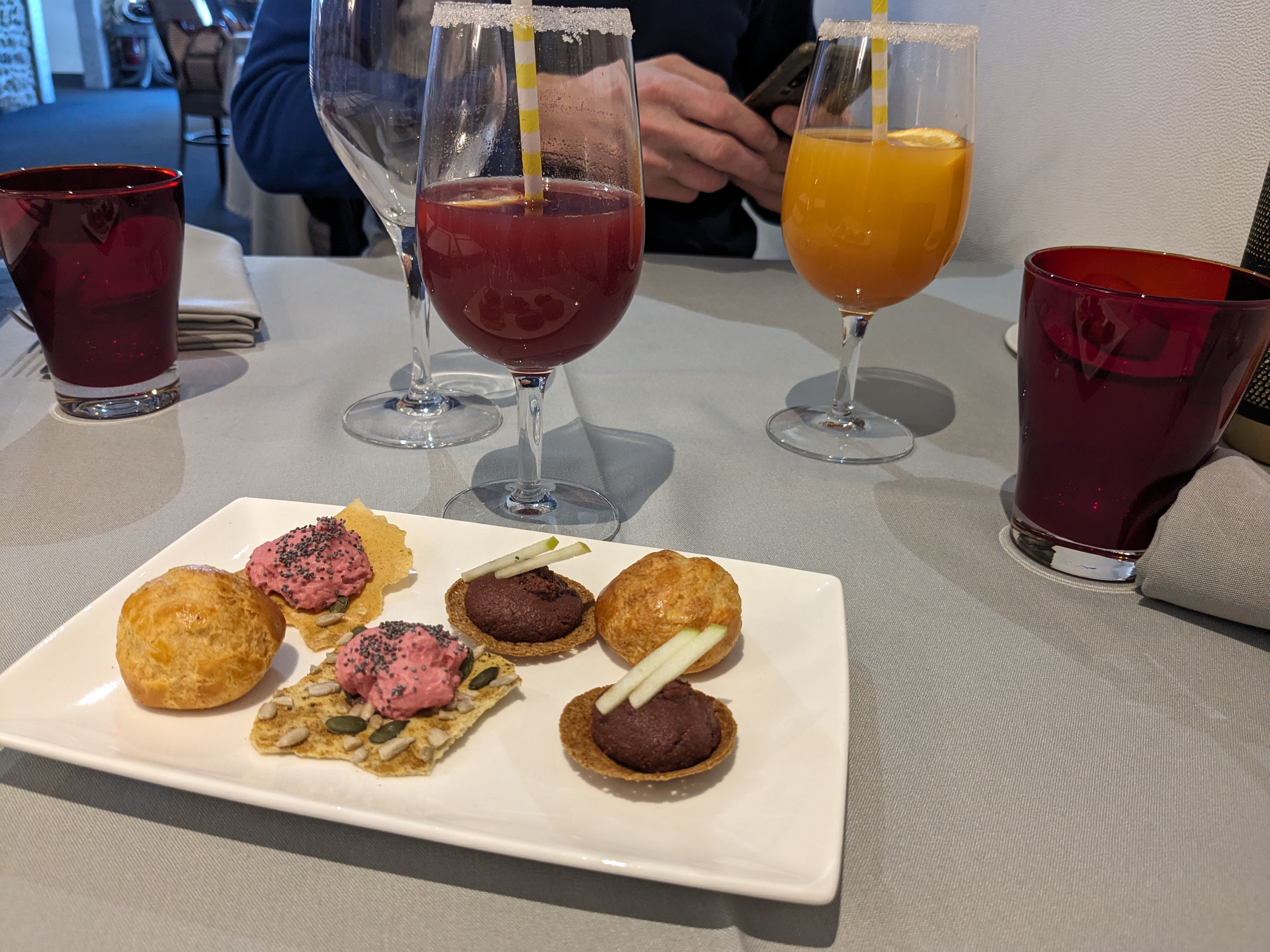 Chouette lunch au restaurant de la gare à Beaussais-sur-Mer (Ploubalay). Un cadre un peu froid à l'ancienne avec des tables nappées de gris, Avec l'apéro des mises en bouche variées 😎 Un beau menu avec en entrée des huîtres de Saint Jacut de la mer, un pressé de saumon et sa gelée à la bergamote ou une ballotine de pintade. En plat, un cabillaud chorizo et ses cocos de Paimpol... Un peu de fromages, un pavlova ou un gâteau au chocolat pour terminer. Un menu classique mais quand le classique est bien travaillé c'est très très bien 😎
