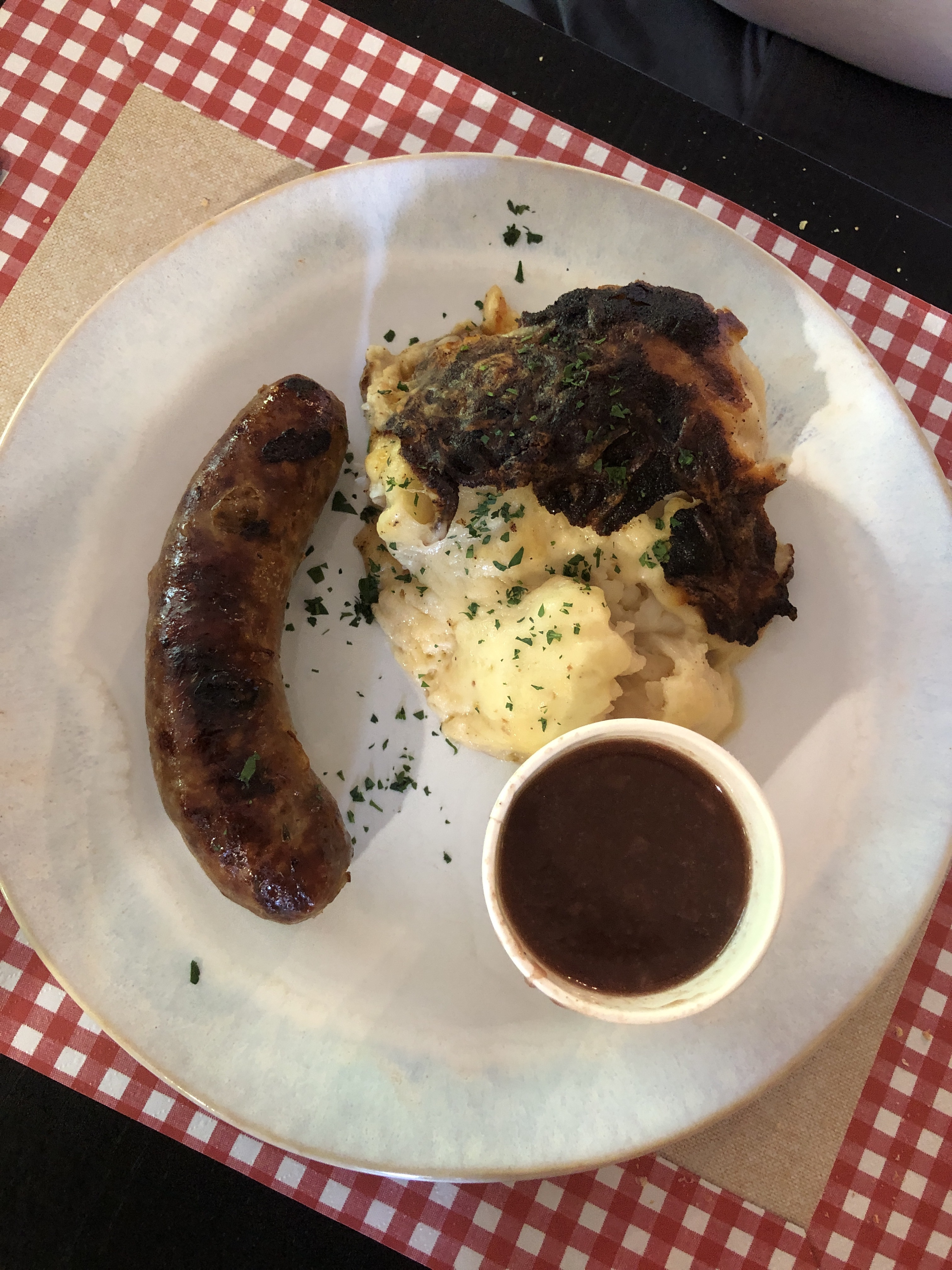 Un heureux hasard nous a amené ici pour le déjeuner, le menu du jour était fabuleux et généreux. La salade au chèvre et l'assiette saucisse/jambon auraient suffi à vous rassasier, mais nous avons vraiment apprécié les boulettes et la saucisse grillée, chacune accompagnée de bons légumes et d'une fabuleuse sauce à l'échalote ! Le service a été rapide et attentionné malgré une salle comble, pas étonnant qu'il y ait autant de convives ! Nous serions ravis d'y retourner à tout moment !