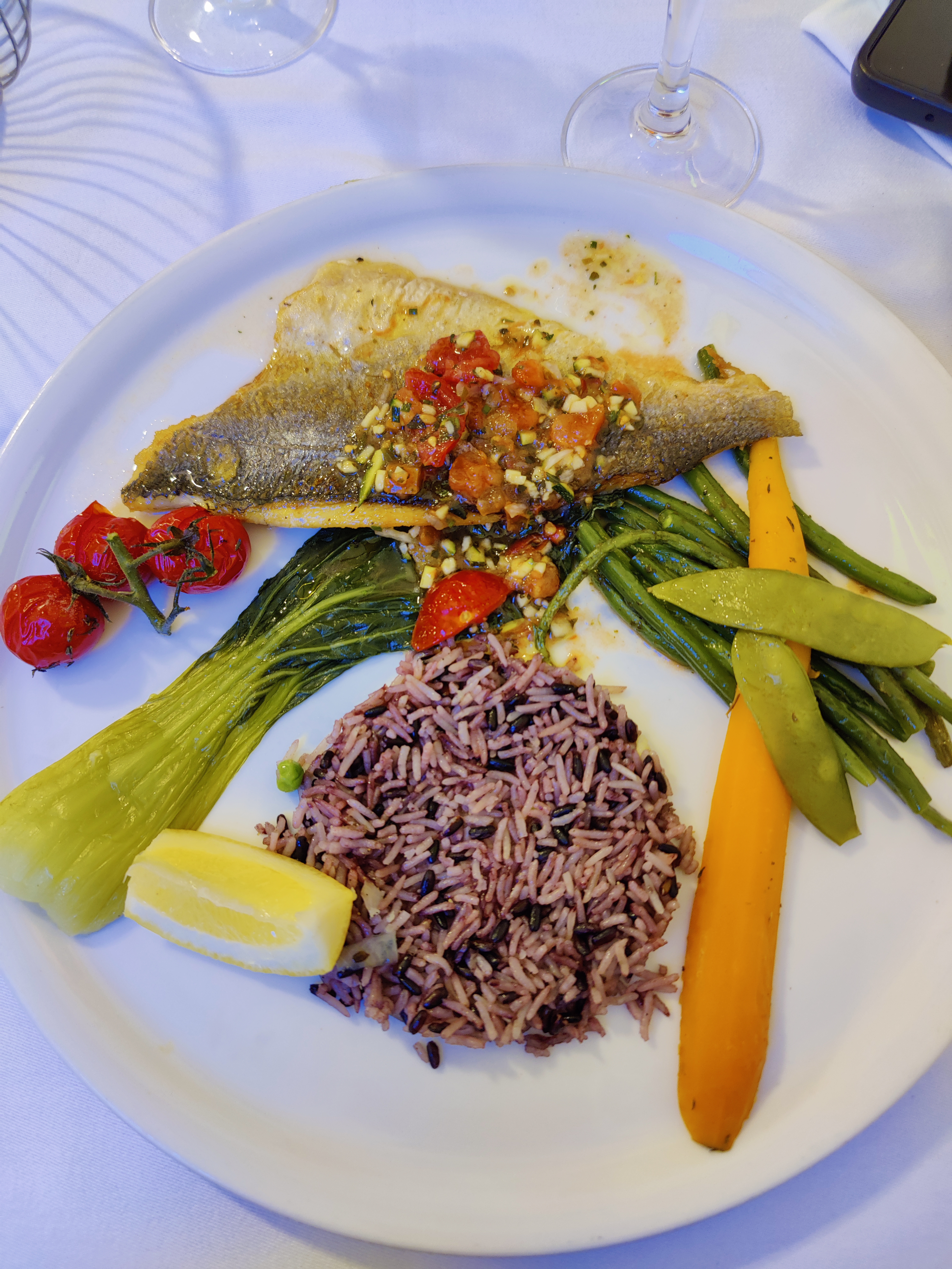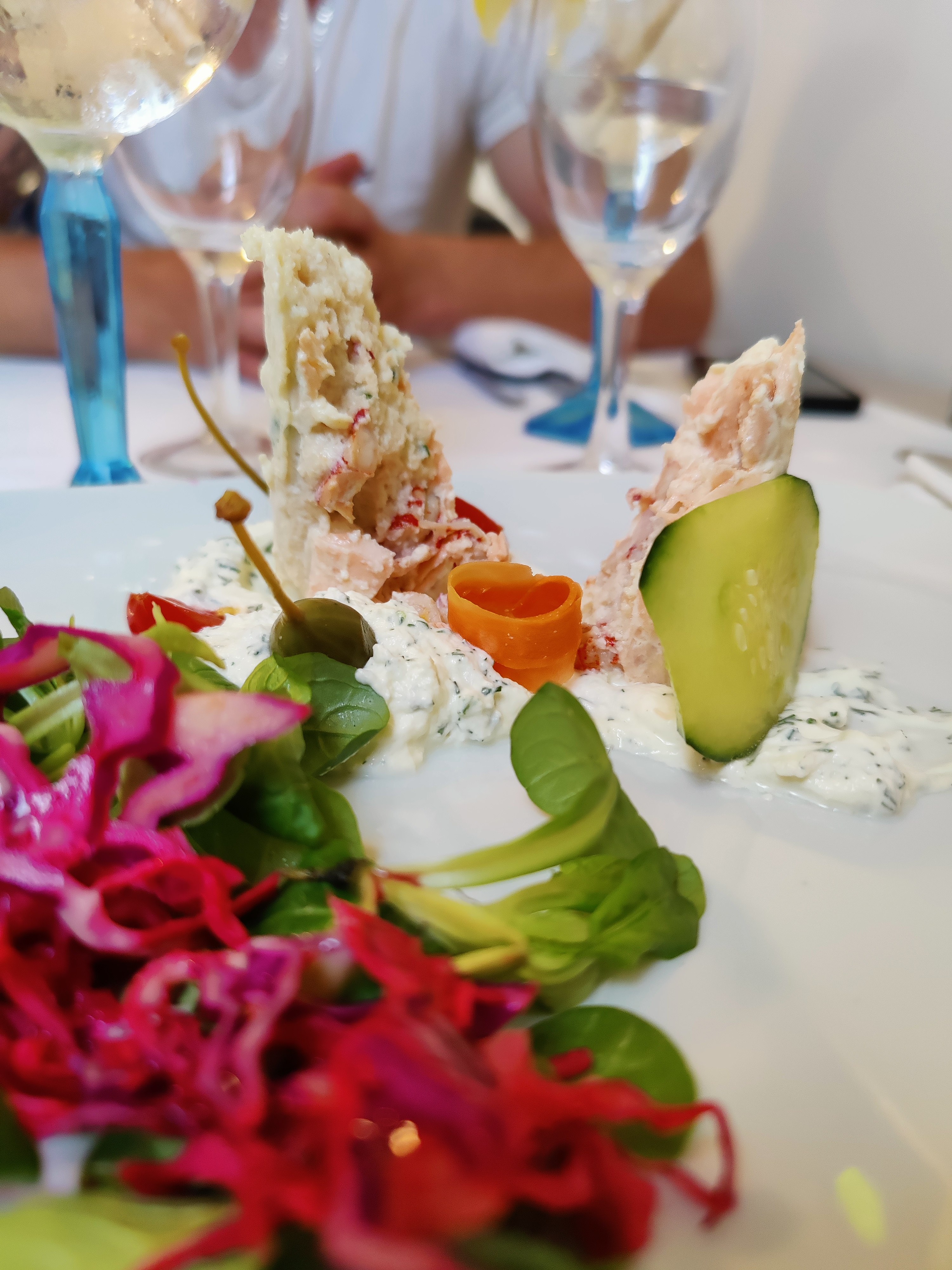Très déçus par les entrées, le menu annoncé ne correspond pas du tout à ce que l on retrouve dans les assiettes, notamment la salade de gambas dans lesquelles se trouvaient en fait une unique tête de gambas et quelques petites crevettes (du jamais vu !), on a eu la bienveillance de ne pas faire de scandale afin de pas gâcher totalement la soirée, ce qui aurait cependant été totalement justifié ! les entrées manquaient aussi d assaisonnements type huile d olive, vinaigre balsamique, les plats et desserts étaient assez réussis (un doute quant au fait maison) sauf la très décevante présentation des tiramisus, le personnel était plutôt gentils... et beaucoup de légumes surgelés, ce qui est indécent quand on voit le prix des menus...Le verre de vin était aussi très cher, et la bouteille n'a pas été montrée aux clients, et les verres des verrines n étaient pas nets. Bref, trop de points négatifs pour y retourner !