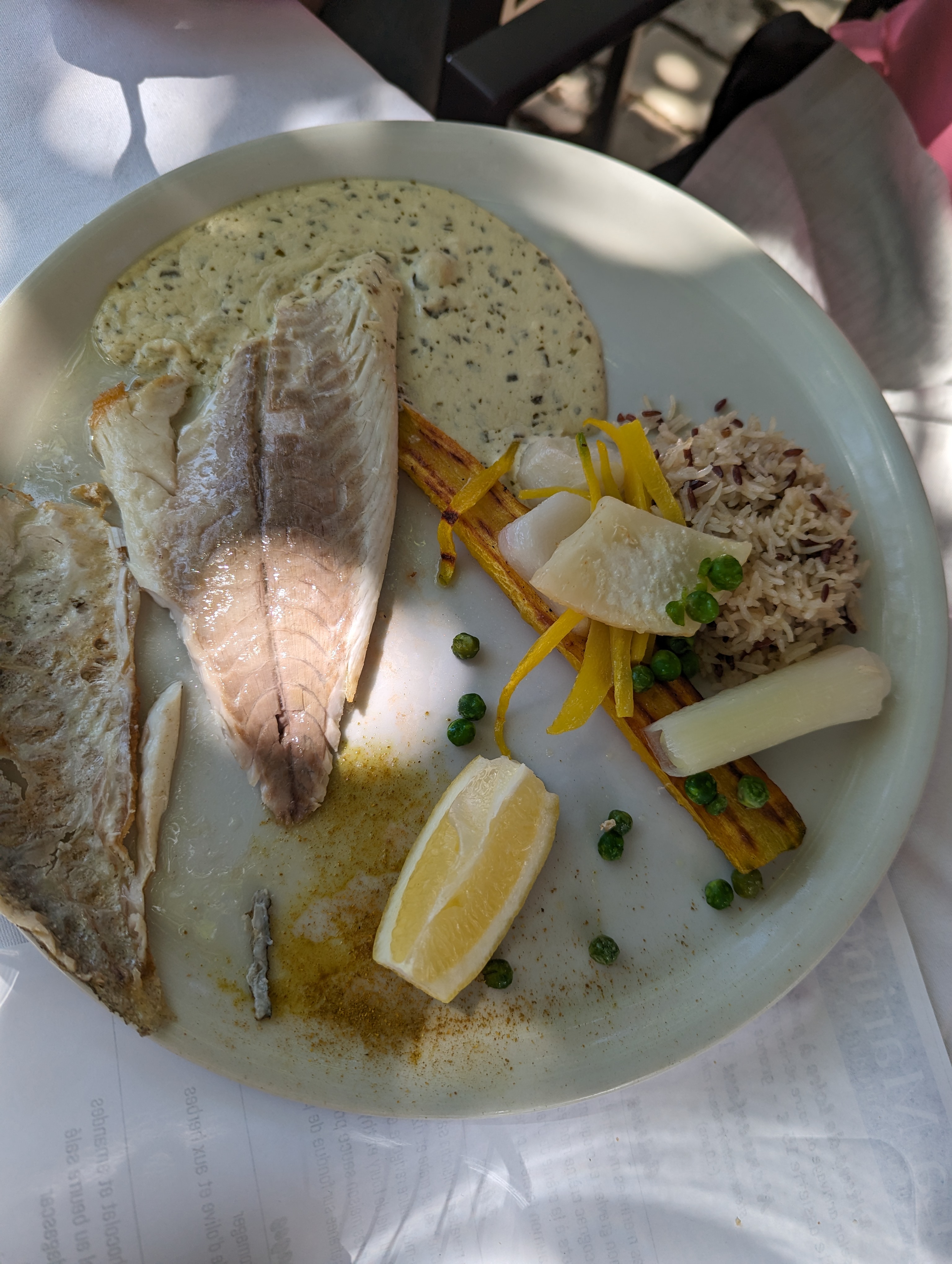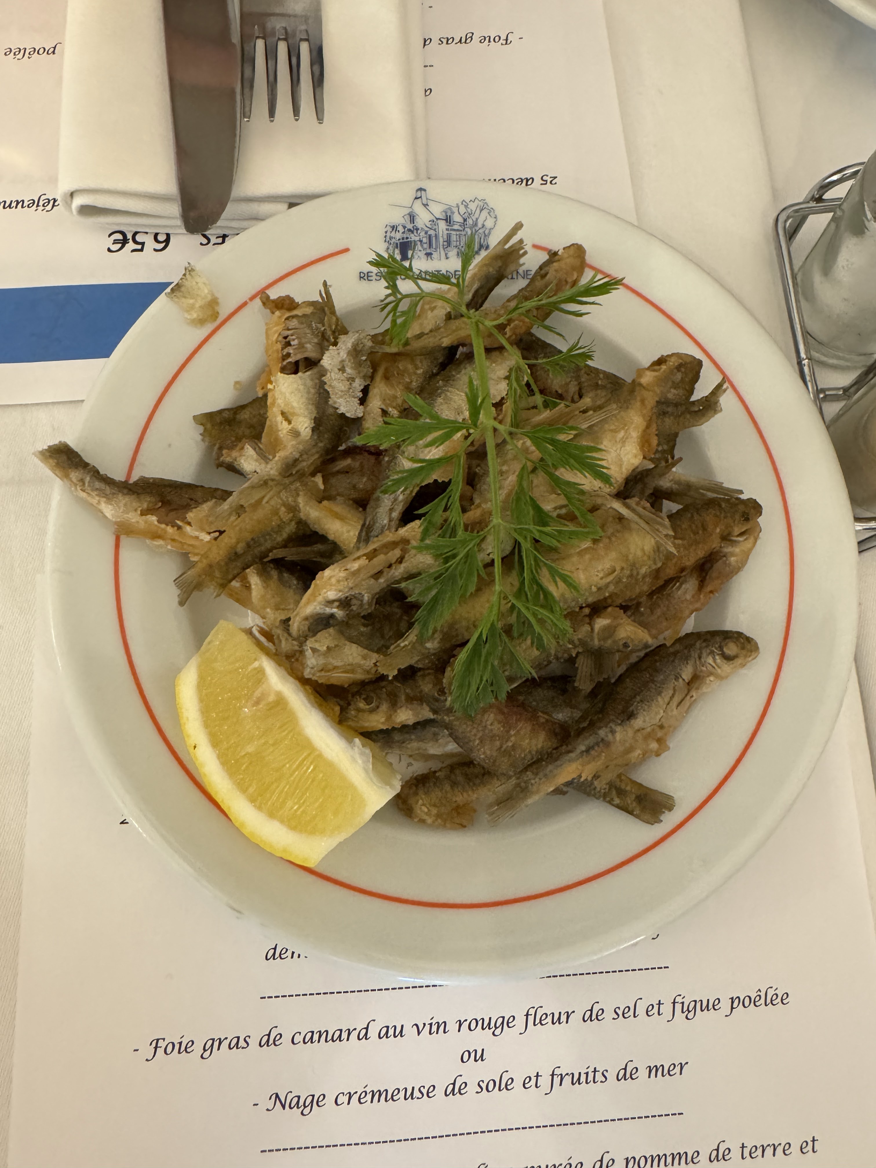 Un régal ! On s'en souviendra longtemps. La friture, je n'apprécie pas vraiment, la leur j'en aurais bien mangée plus. La souris d'agneau, nous aurions bien léché notre assiette, les petits légumes verts et croquants l'accompagnant excellents. Et le dessert, craquelin poire fondante glace caramel beurre salé, wouah ! Nous avons attendu mais nous n'avions pas réservé, et nous étions prévenus. C'était un dimanche et il y avait du monde ! Nous n'étions pas pressés car une balade en bateau était prévue pour 16 h. Averti, le patron a accéléré le service pour que nous soyons à l'heure et à notre arrivée au bateau, nous avons eu l'heureuse surprise d'apprendre que le guide avait été informé que des clients arrivaient avec un peu de retard. Le lieu, au bord de l'eau, en été, en terrasse est très agréable. Nous avons passé un très bon moment. Un peu cher certes pour nous ! Nous avons pris qu'un verre de vin chacun. Un peu cher également et pas assez frais pour mon goût