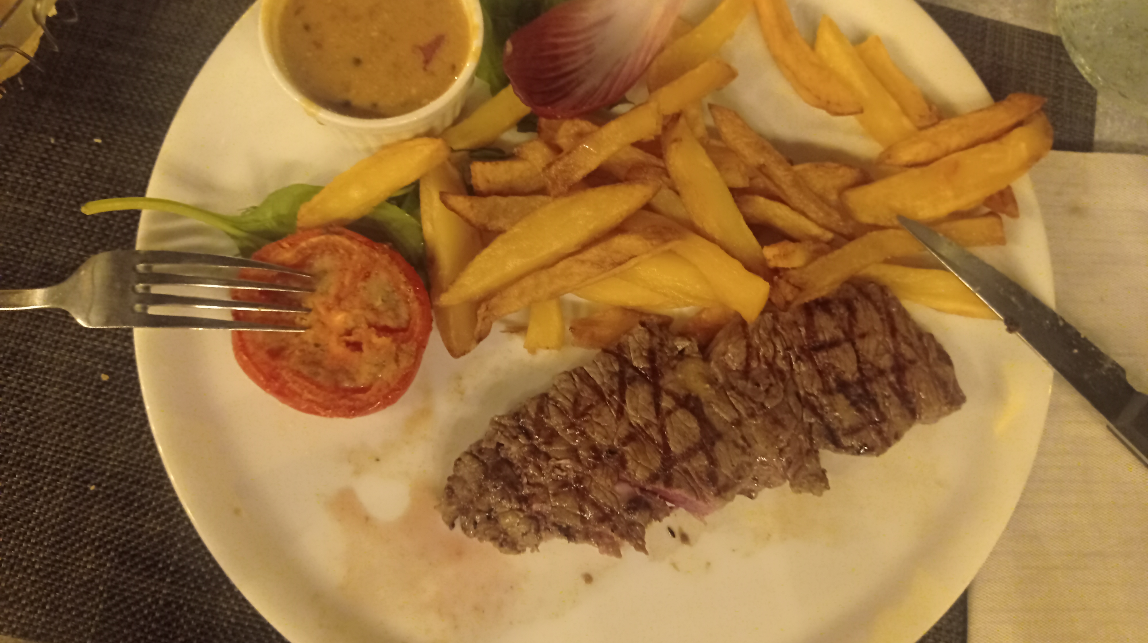 Tout était bon, les entrées, le plat, le plateau de fromage et le dessert! Et quand un gros mangeur commence à caler, alors c'est bon signe!!! Il ne manque au tableau qu'une belle déco, ne pas se fier au cadre, l'assiette est là !