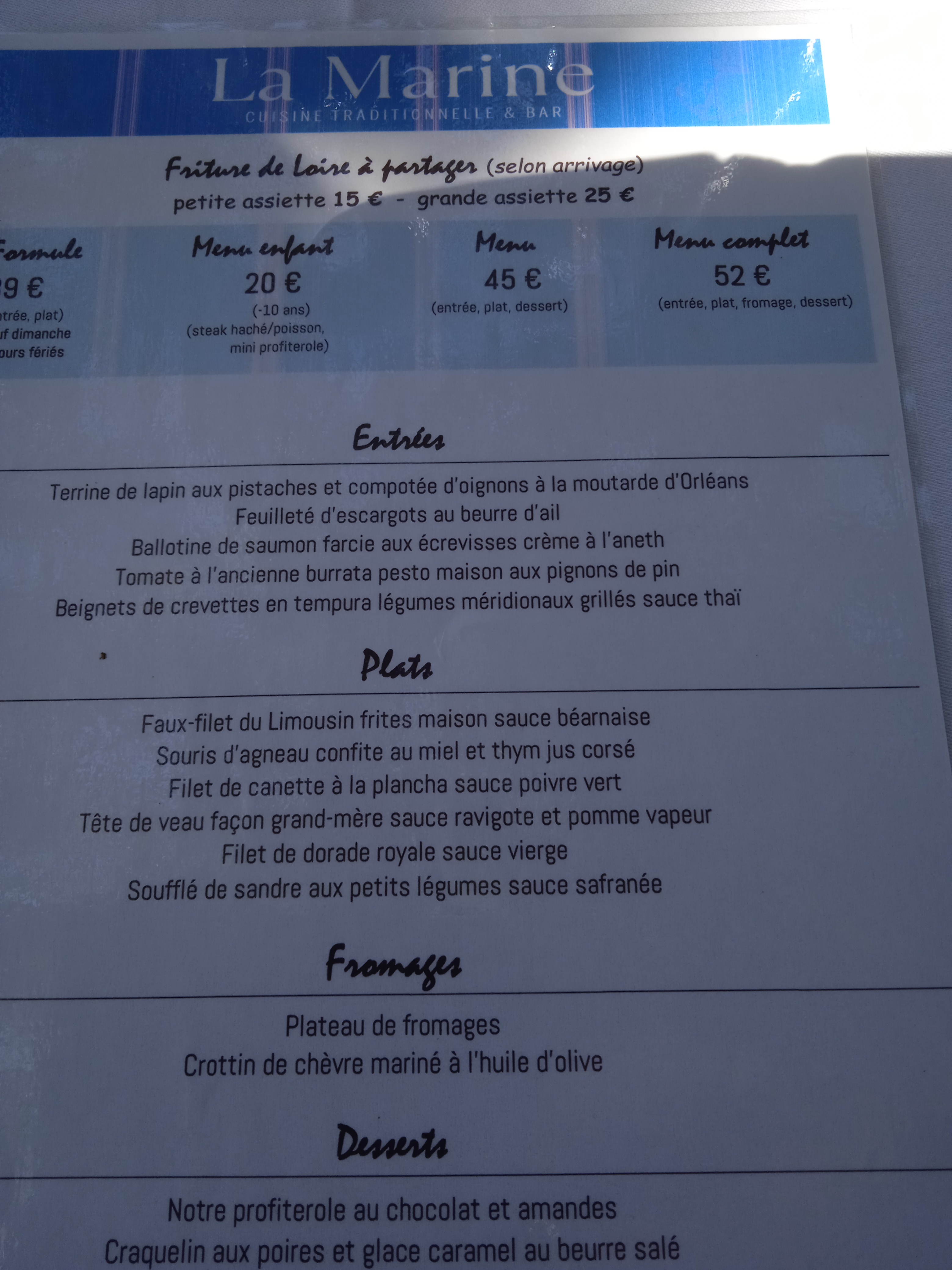 Combleux, une de mes balades préférées. La Marine, le seul restaurant de ce superbe ancien village de mariniers.Il était évident d'y retourner après le changement de propriétaire. Niveau cuisine et décor rien n'a ou presque n'a changé. Pour un semi gastro l'addition est certe salé. Nous avons très bien mangé les plats sont fins seul le service n'est pas a la hauteur de ce restaurant connu des Orléanais. Pas évident de trouver du personnel en cette conjoncture économique évidente. Je regrette le passage des voitures entre les tables 🙏 mais ça, ce n'est pas de leurs ressort je suppose. Ce qui me manque le plus, de pouvoir manger une salade ou une friture a un prix raisonnable. Mais j'aime toujours m'y installer et profiter du paysage sous les tilleuls.