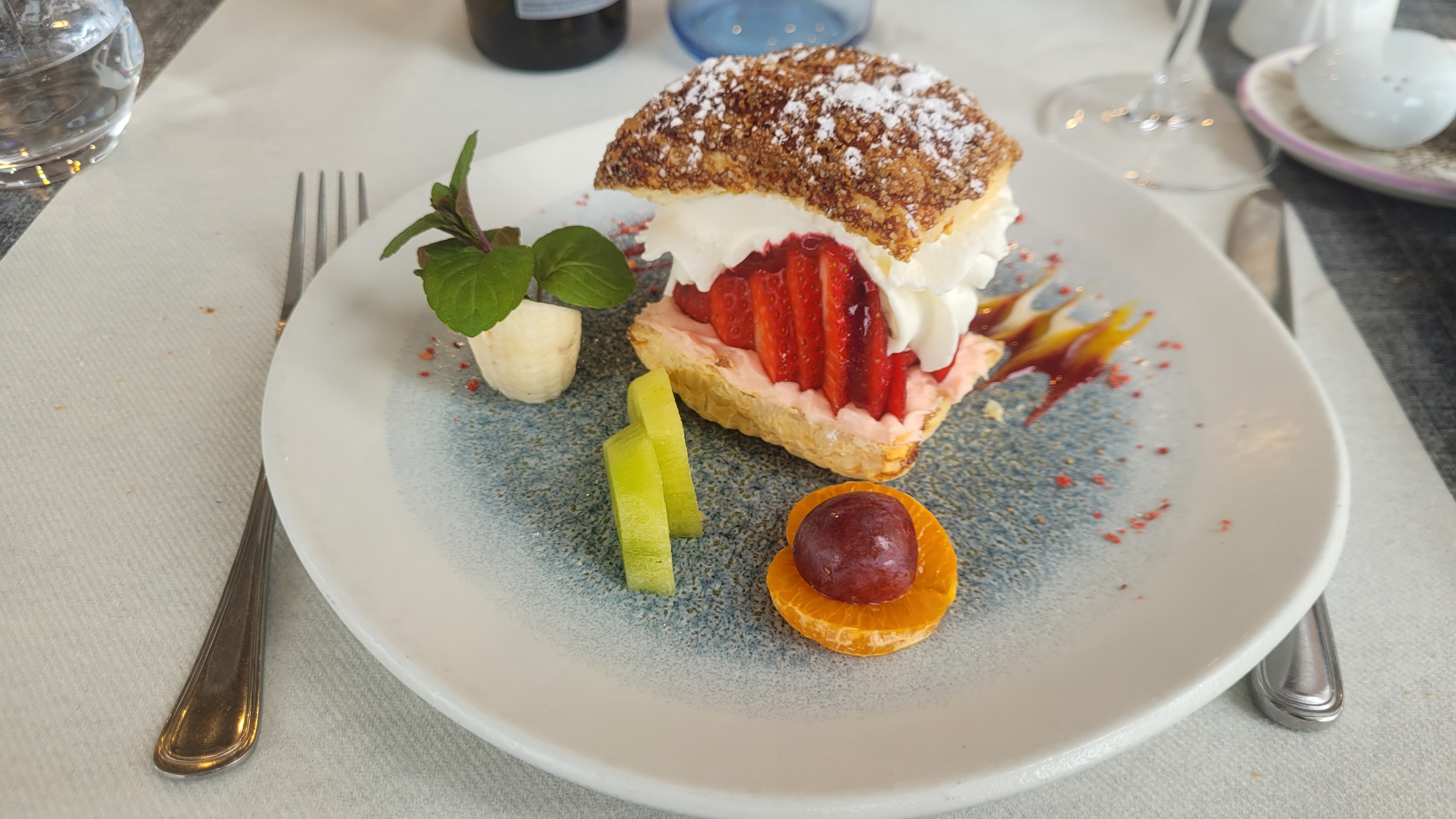 Nous avons très bien mangé,mention spécialement pour la côte d'agneau de près salé et la feuillantine de fraise.petit bémol sur le pain de qualité moyenne et les différentes cartes des menus trop nombreuses qui rend la compréhension difficile.