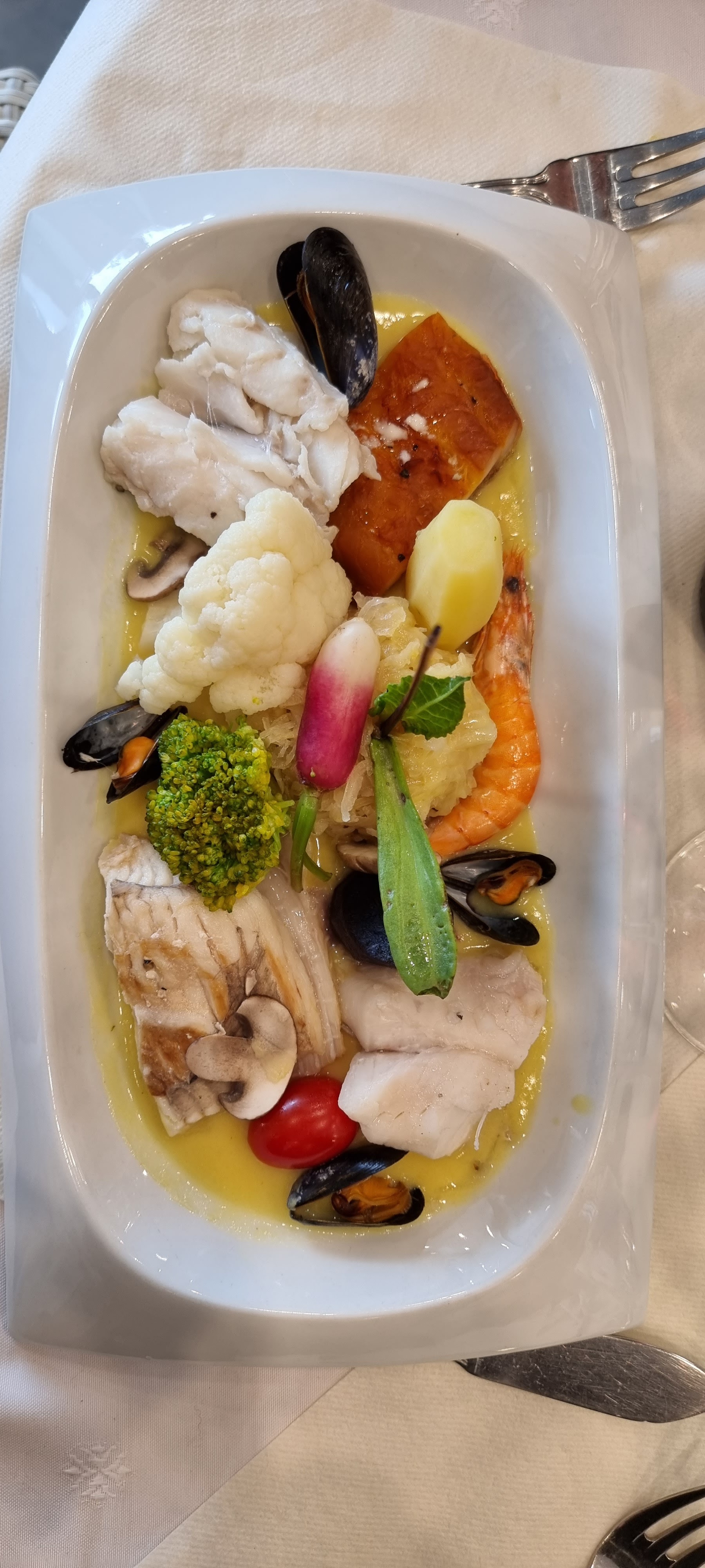 Beaucoup de choix (menus + carte), plein de poissons, beau plateau de fruits de mer. Mais le service est très particulier (remarques, appels téléphoniques gênants, personnel de cuisine qui passe par la salle, ...). On peut y aller pour la carte mais pas pour le calme ni la sérénité.