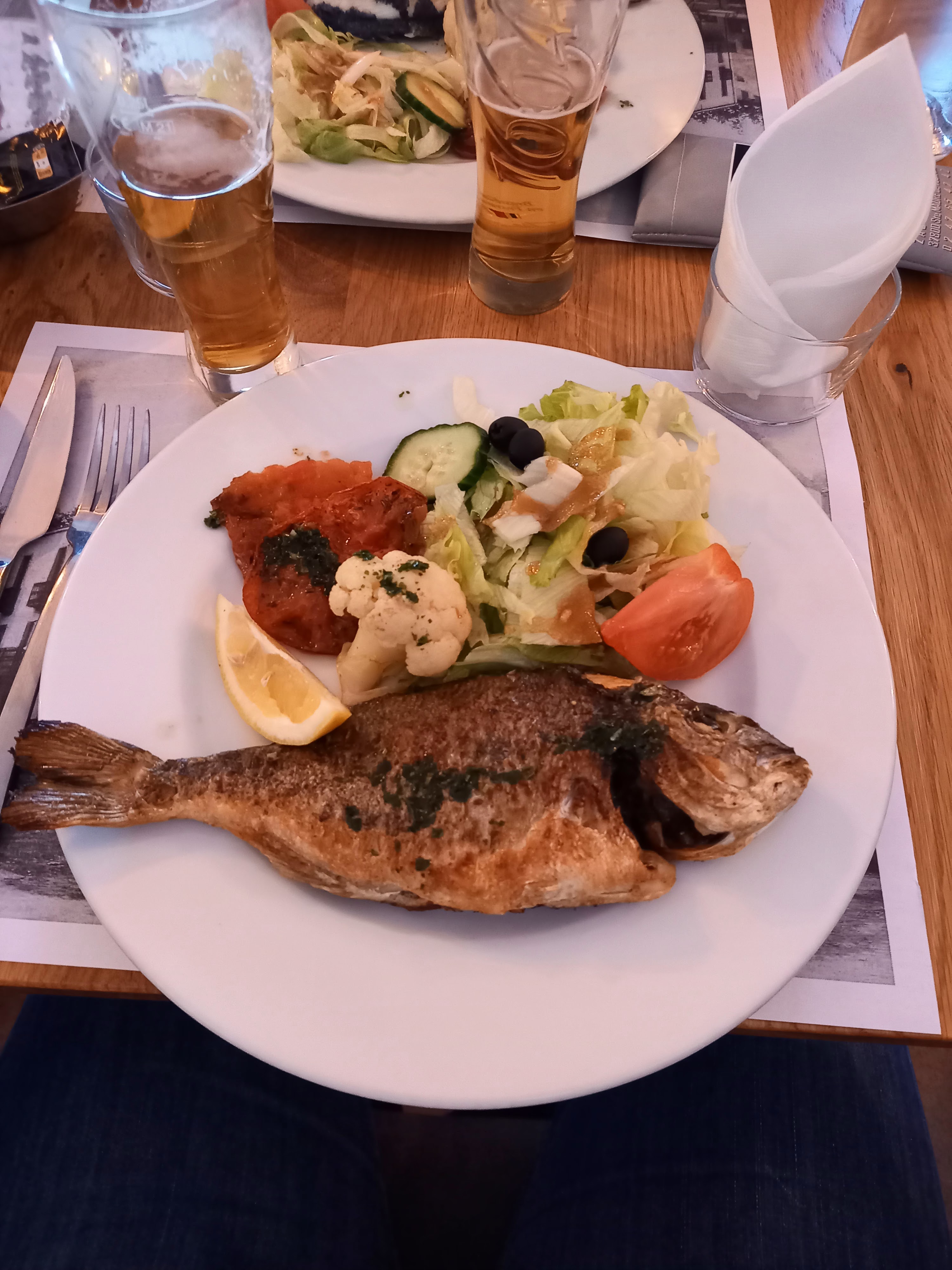 Très décevant dans l'ensemble. Poisson commandé du jour. Et j'avais très peu mangé et j'ai trouvé un poil dans mon poisson… Je l'ai dit à la serveuse et elle est repartie avec mon assiette…. Je ne savais pas si elle le remplaçait ou non… Cependant, je l'ai entendue parler au propriétaire/directeur à l'intérieur de la porte. Chaque fois qu'il me croisait, il ne reconnaissait rien et ne me demandait même pas si je voulais autre chose... mais quand je suis allé payer... il n'a rien dit et a commencé à me facturer du poisson (19 euros) pour quelques feuilles de laitue et un morceau de chou-fleur froid et tranche de tomate et un verre de vin et supplément 3,50. Vraiment déçu de la nourriture et plus encore de la façon dont le problème a été géré. J'ai demandé avant de commander s'ils avaient un «menu du jour» et la serveuse a répondu en disant que notre chef ne commencerait qu'en mai, alors peut-être que j'étais un mois trop tôt !! Quoi qu'il en soit, je n'y retournerai certainement pas et je ne le recommanderai pas.