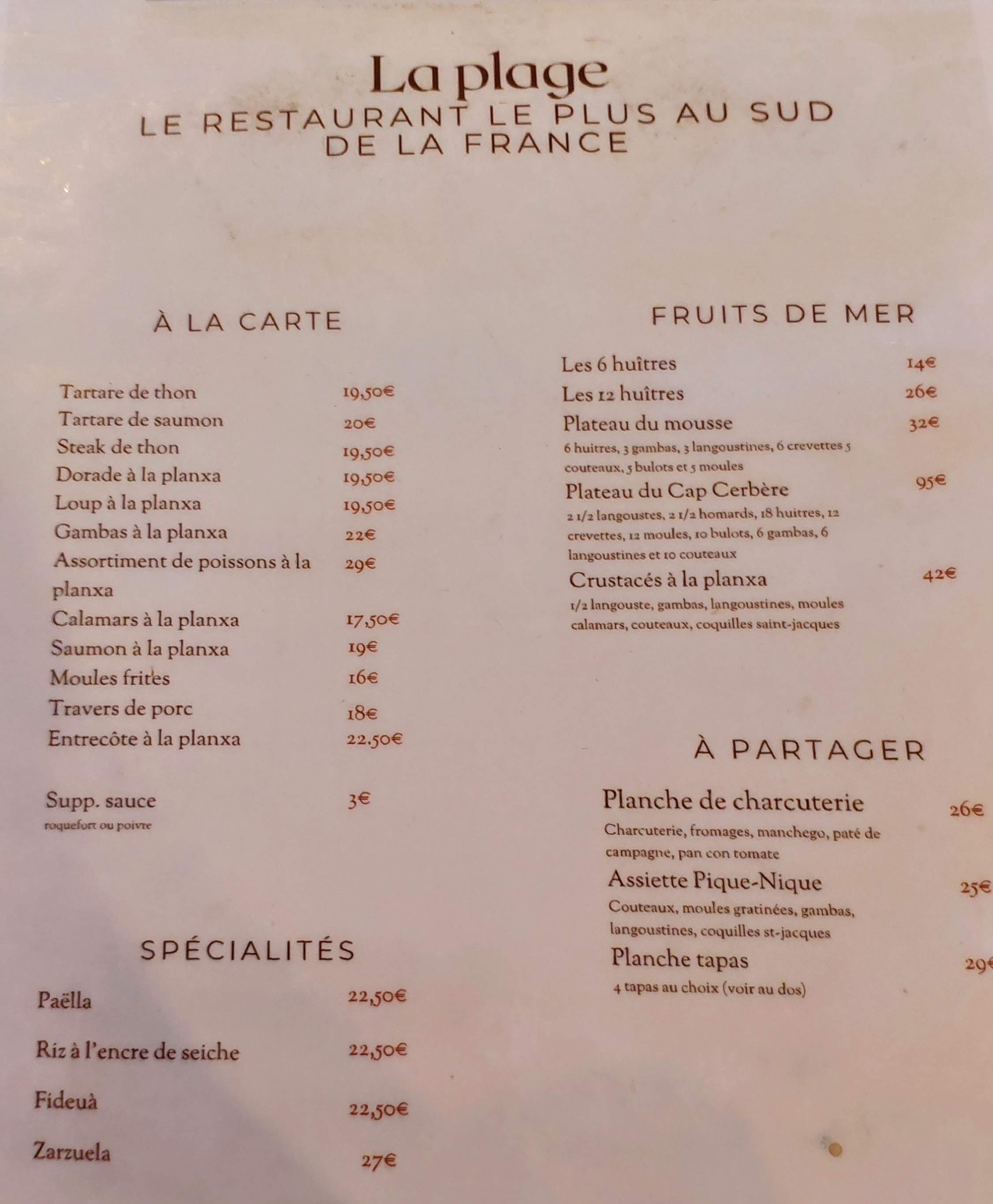 Rien d’exceptionnel , serveur nul , serveuse qui essaie de relever le niveau ... bref j'y suis aller 2 fois et toujours pareil vin commander au début ...et servi au dessert !!!! idem pour avoir du pain !!! pas du tout commerçant de toute façon a Cerbére la politesse il ne connaissent pas