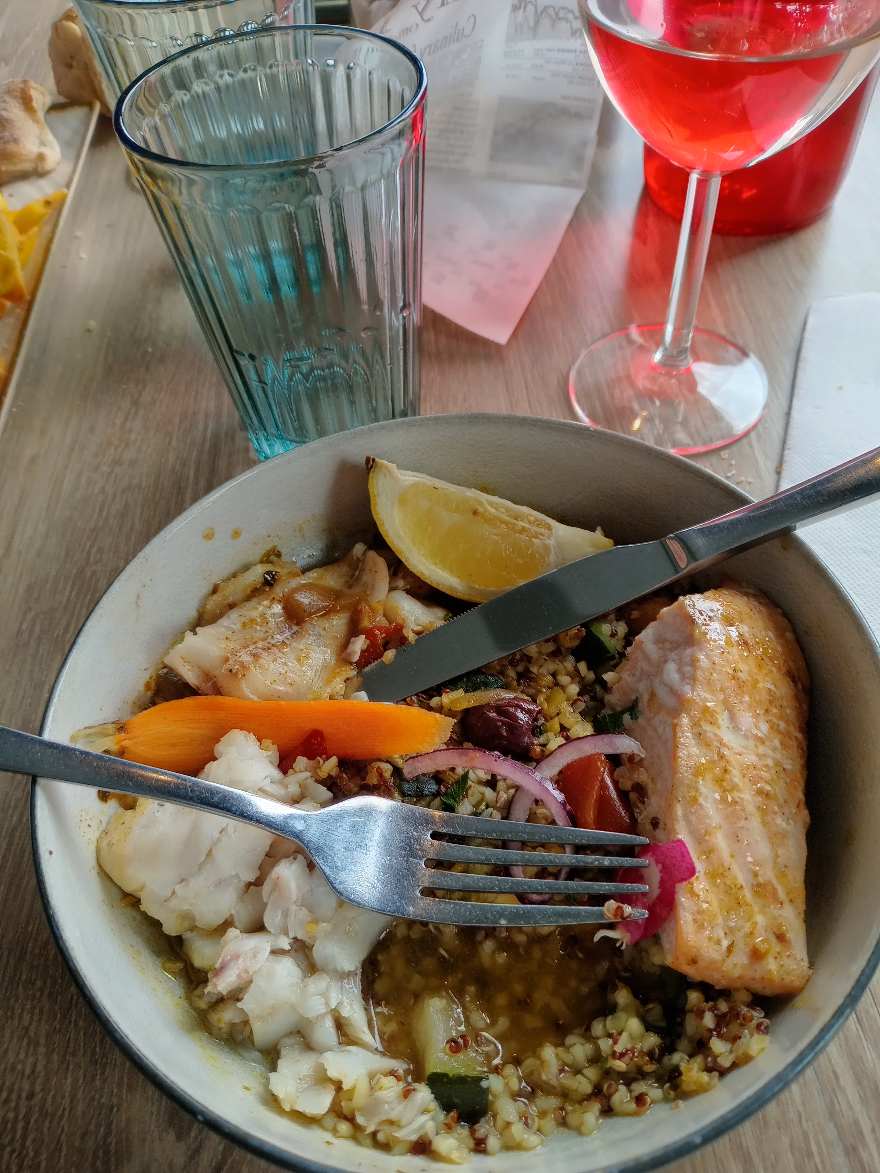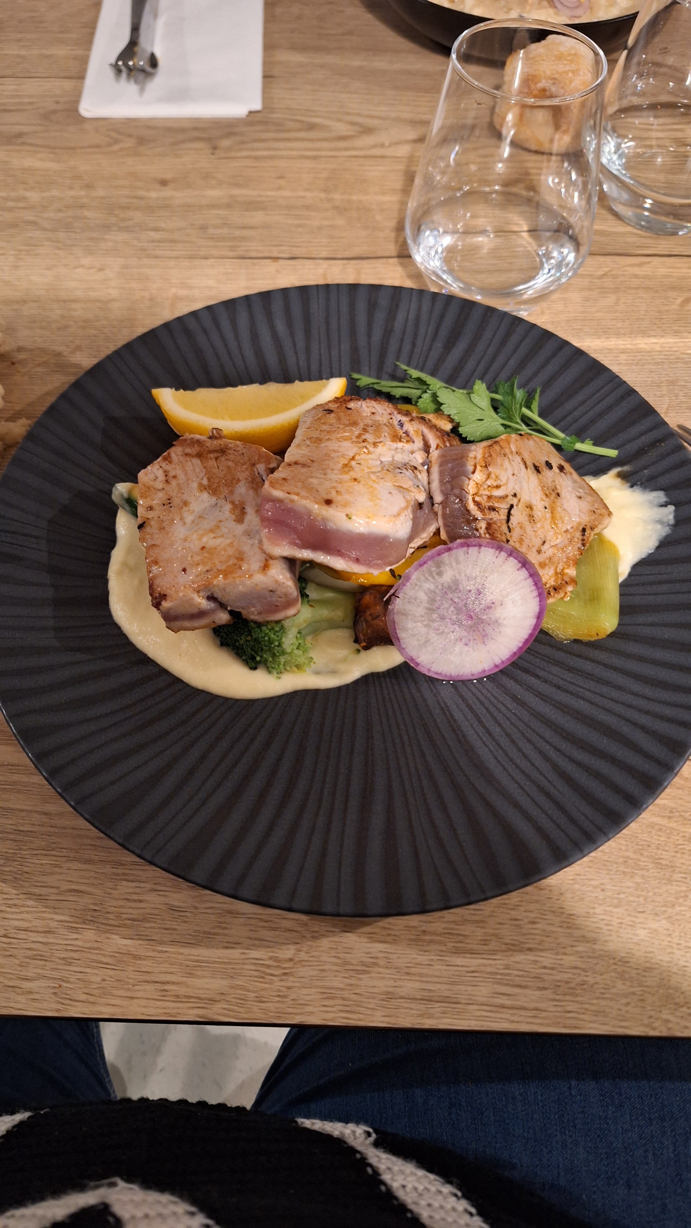 2 ème visite dans ce restaurant et toujours aussi bon. Notre mix de grill de poisson (saumon et bar) parfaitement cuits accompagnés de leurs petits légumes. Un régal ! Et la vue sur mer vaut le détour, par tous les temps, même en hiver !