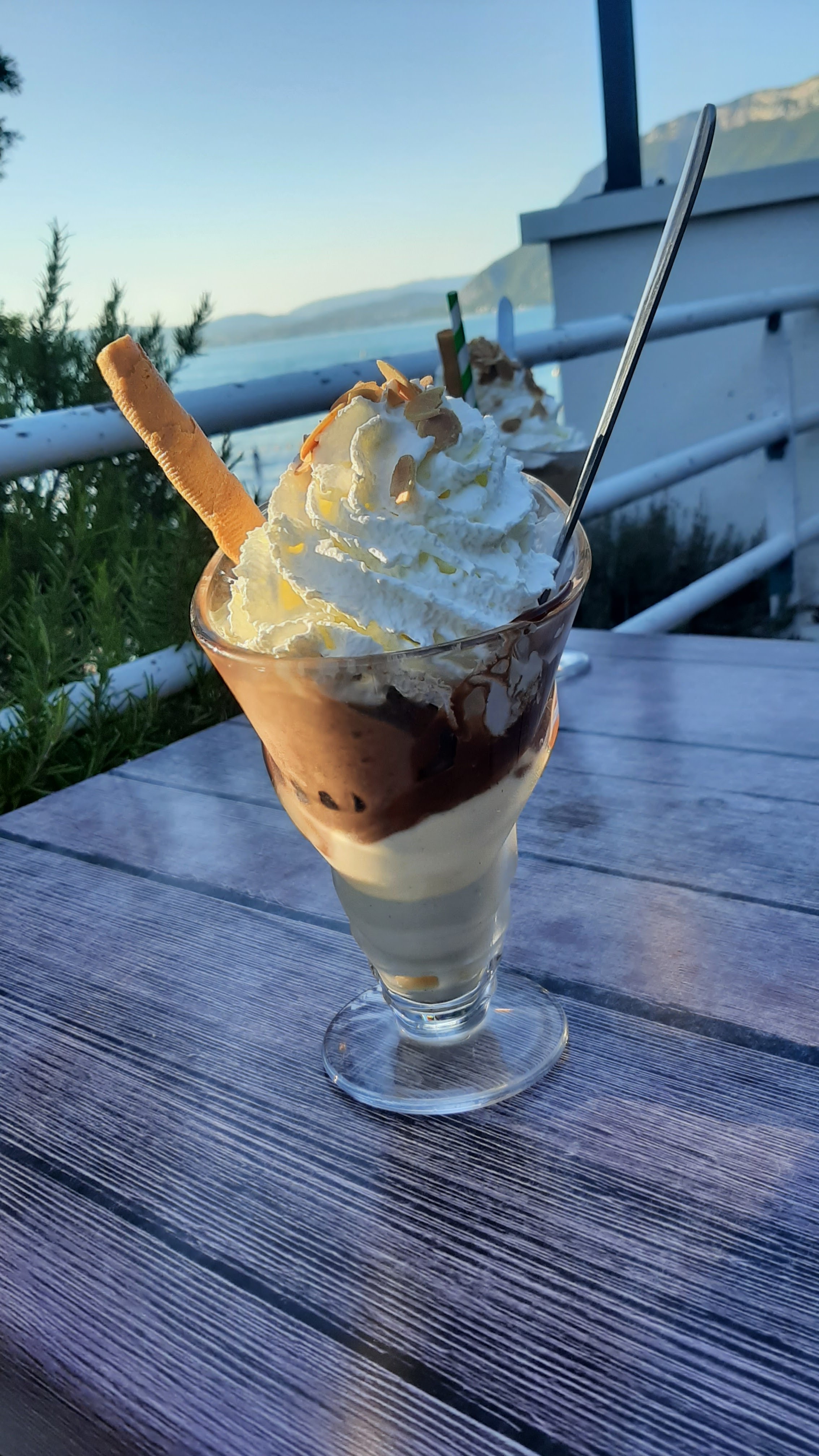 Endroit agréable avec vue sur le lac et la montagne. Accueil sympa. Service rapide. Dommage que dans mon bowl végétarien je n'ai pas eu de protéines végétale. Un vrai régal les glaces!