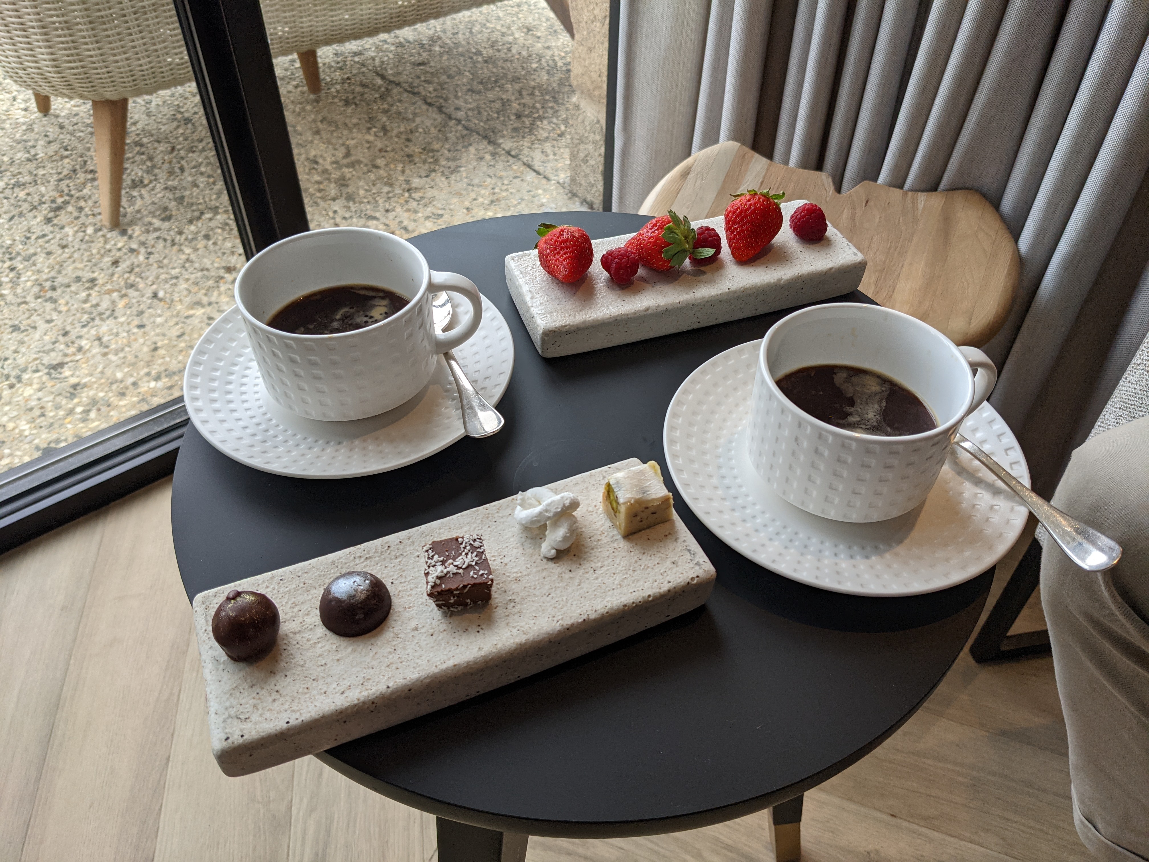 Nous avons passé un très bon moment. Le déjeuner était délicieux. Mes partenaires sont partis pour un menu et moi à la carte. Notre repas était ponctué de mises en bouche et de mignardises. Nous avons aimé changer d'ambiance pour le café. Le salon est aussi très agréable et lumineux malgré le temps exécrable du jour !