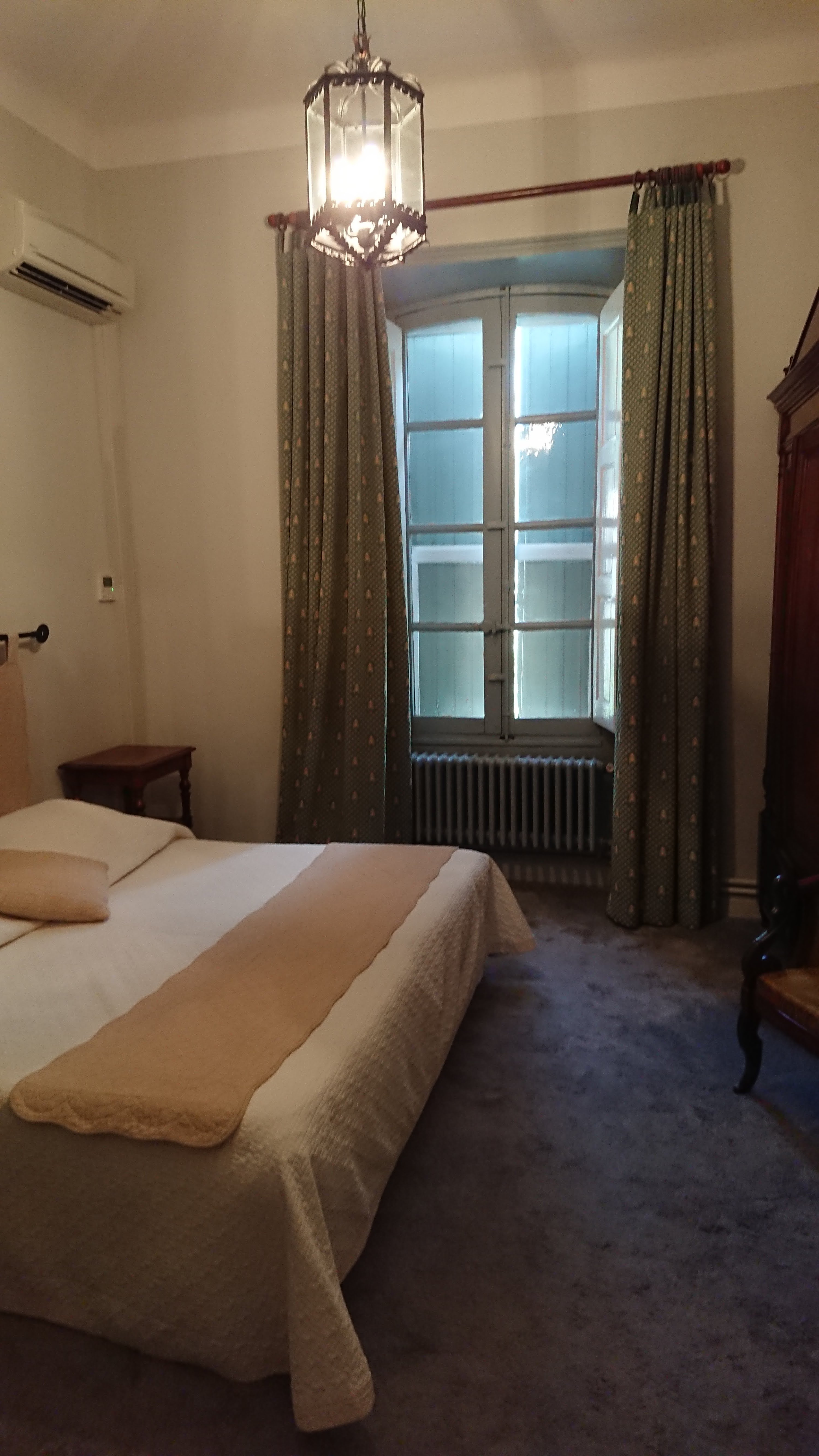 Une petite chambre, sans grand intérêt, avec aménagement spartiate, décoration et mobilier d’une autre époque, sans charme particulier. Attenante, une salle de bain refaite à neuf, fonctionnelle et propre. L’attrait principal est la vue depuis la petite terrasse (sympa) de la chambre donnant sur les Alpilles et la piscine. Cette dernière est l’atout réel du lieu, grande avec des abords bien aménagés et de l’espace. L’accueil par les réceptionnistes est, quant à lui, tout à fait correct. Le lieu, au global, aurait vraiment du potentiel.