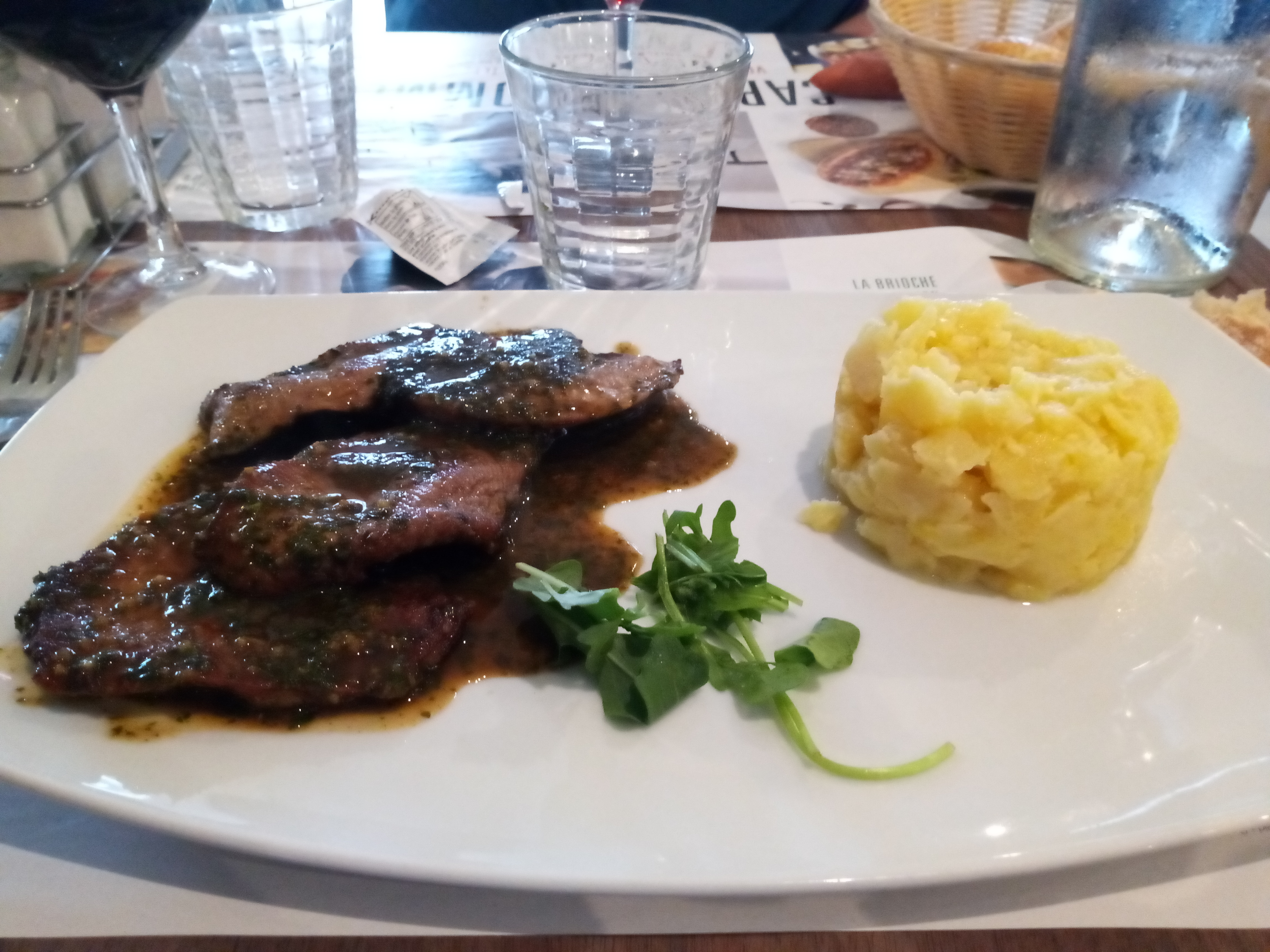 Acceuil très bien, formule du midi à 16 € sa va, ormis que les tomates cerise mozzarella peut mieux faire en quantité, plat de résistance très bon et copieux, dessert petit bémol (cheveux dedans par accident) vite remplacé, et petit vin rouge de table Cousteau mais correct,