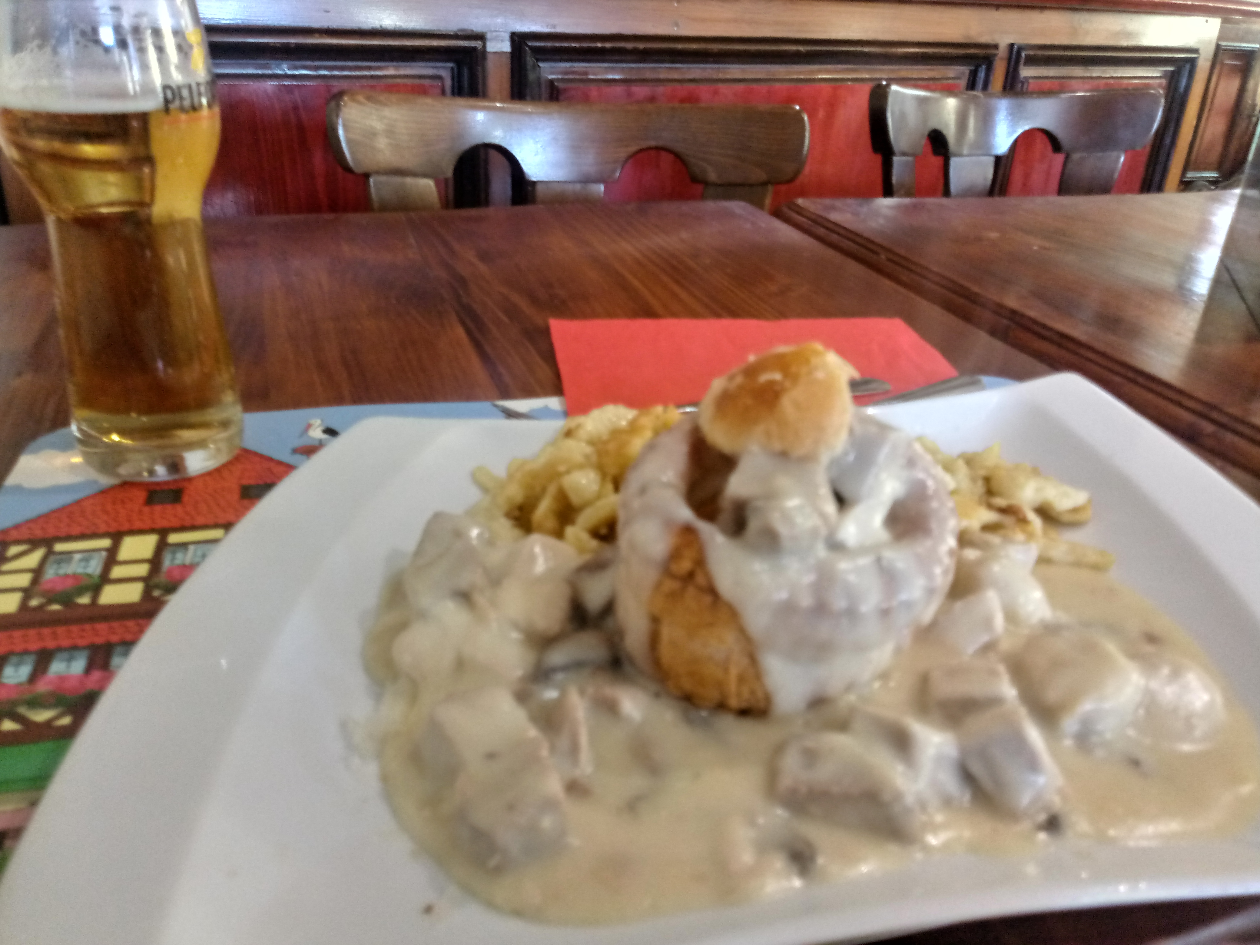 Riz de veau aux girolles avec Spätzle vraiment excellents. Salade vigneronne relevée de quelques lanières de poivrons bien trouvée.