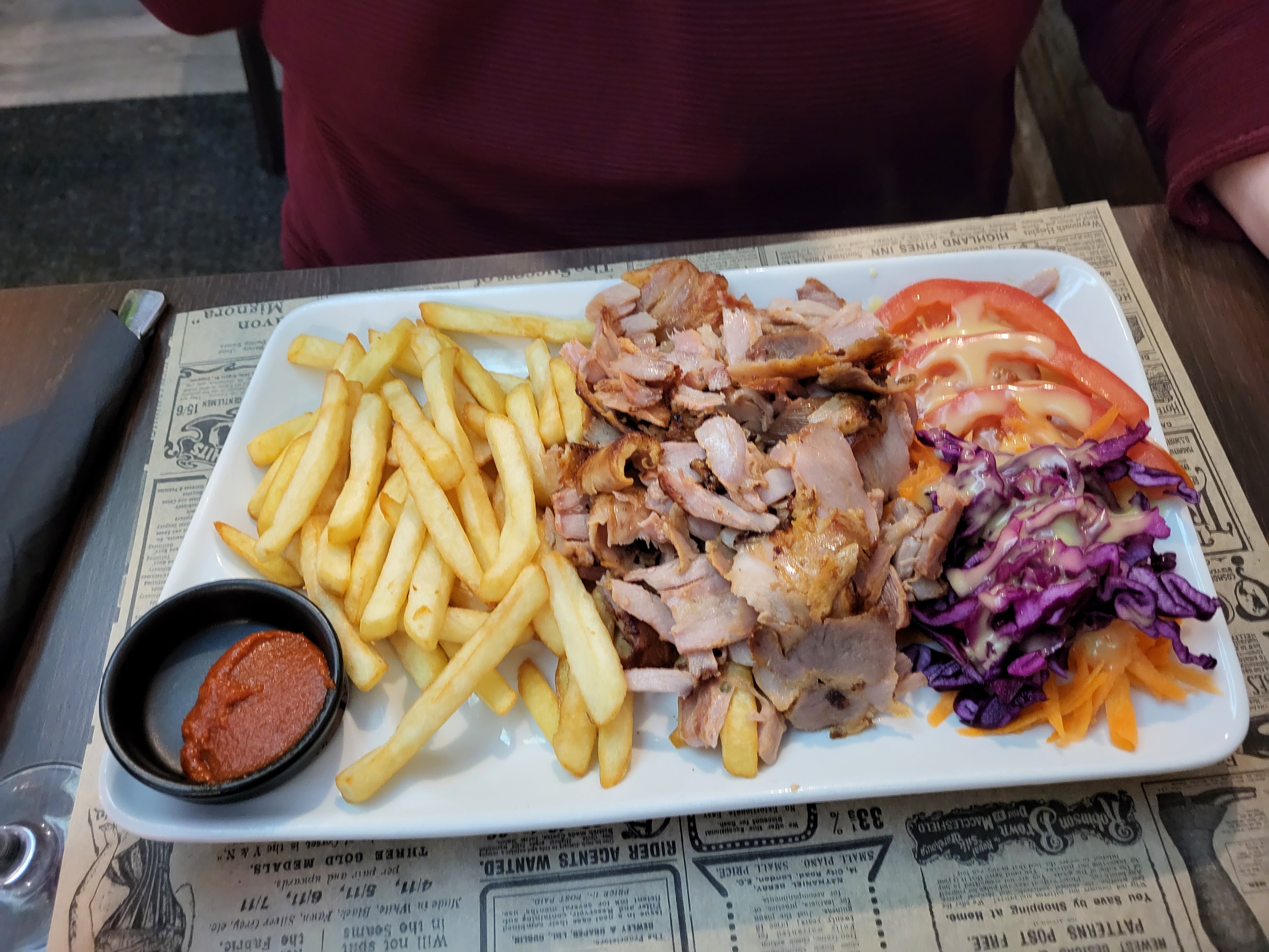 Viande bien cuite pas de surcuisson et frites bien assaisonné malgré des frites non maison ( pomme de terre épluchées etc ) l'établissement est propre et très bien situé vers le théâtre La salade tomate sont plus fraîches que d'autres kebab.et les frites sont chaudes contrairement à d'autres endroits où on te les sert très tièdes voire froides. Je mets 4 car c'est le meilleur kebab de Vesoul que j'ai pu teste mm si je ne suis pas restaurant rapide mais un kebab de qualité fait du bien