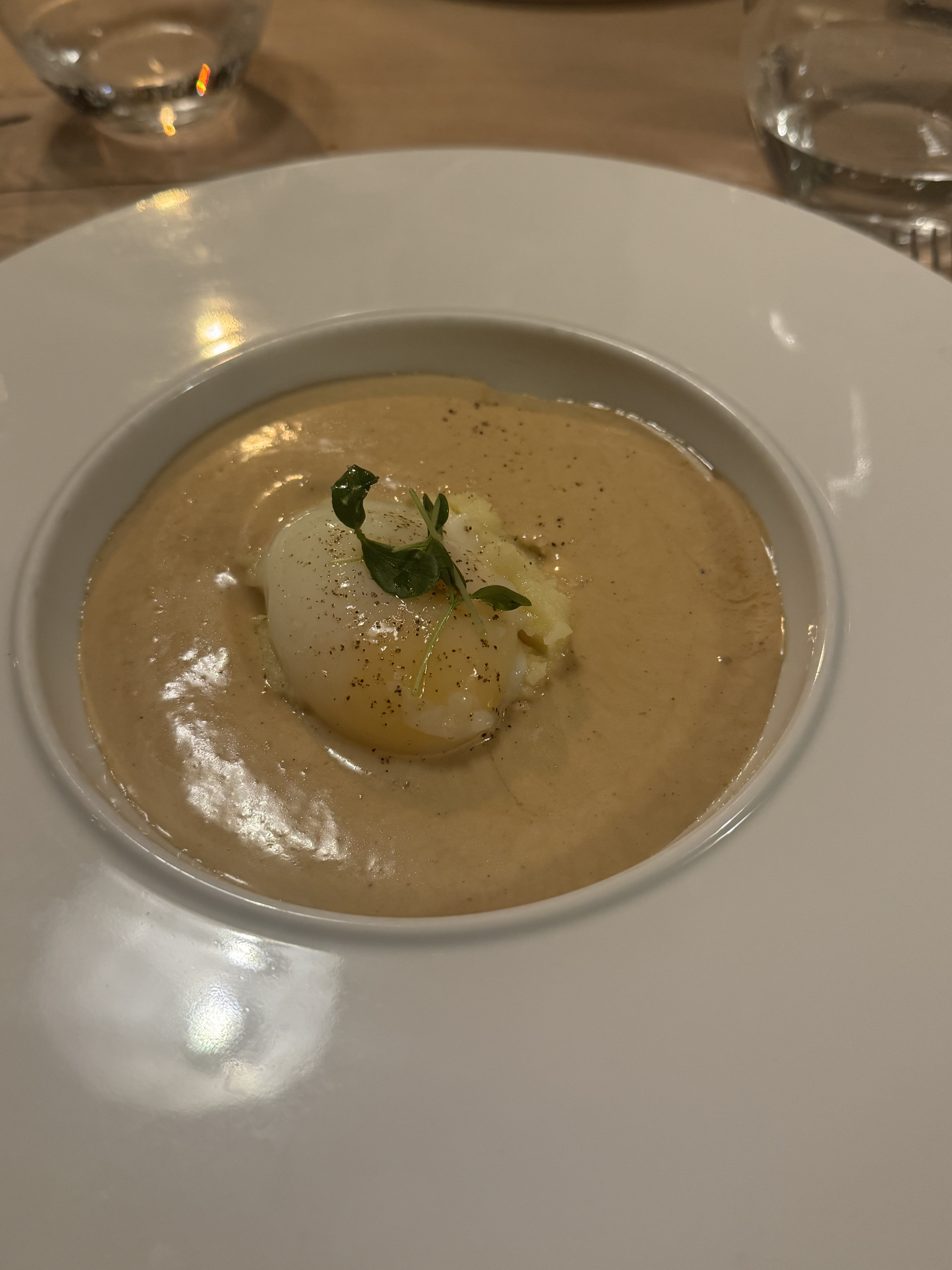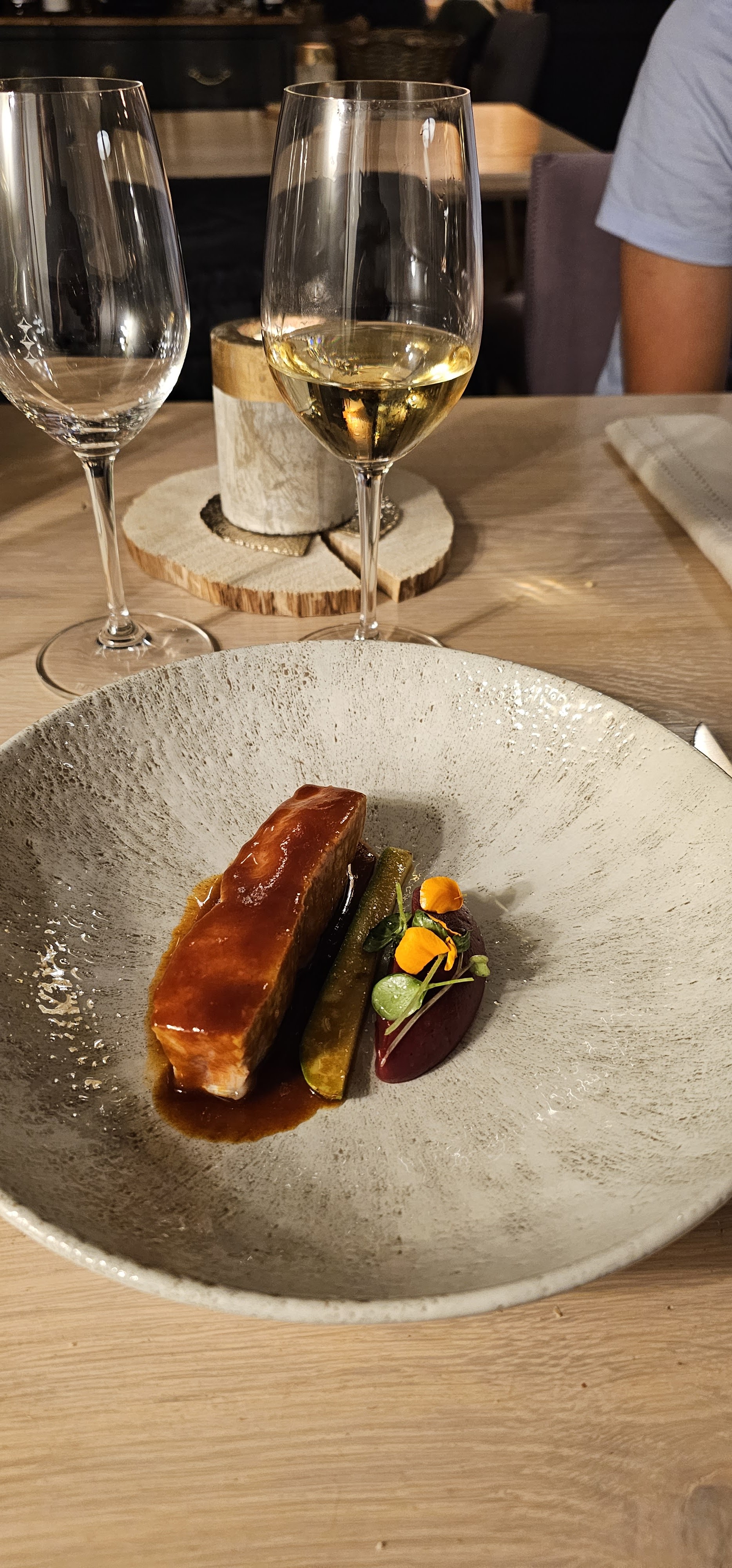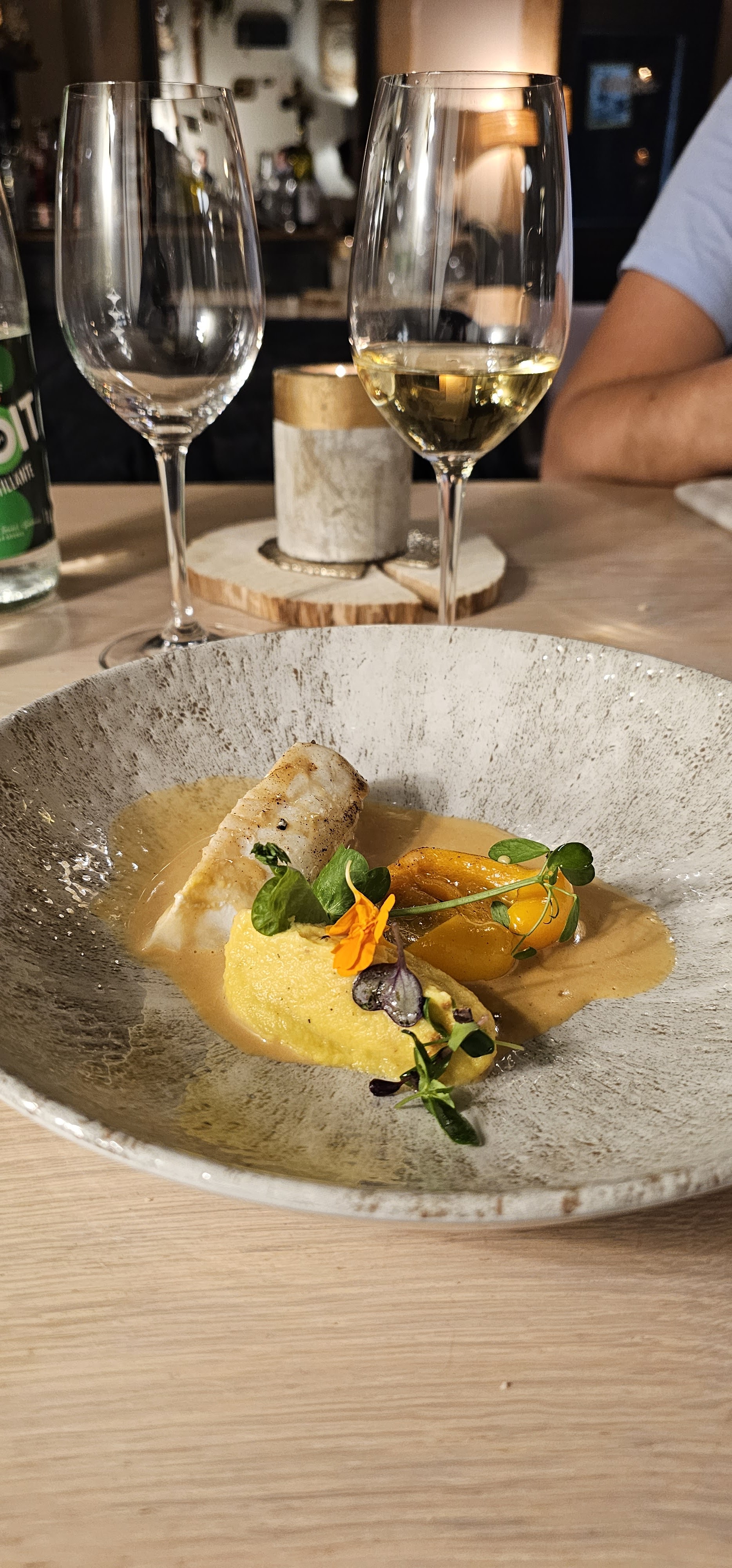 Ambiance chaleureuse et détendue avec de la bonne nourriture. Même si le personnel était très sympathique et accueillant, le vin arrivait après le service à chaque fois. Souvent, j'avais même besoin de rappeler au personnel de verser le vin assorti. Ce n'est pas un gros problème mais pour ce niveau de restauration, en dessous de la moyenne. Néanmoins, nous avons apprécié notre soirée, alors je tiens à vous en remercier !