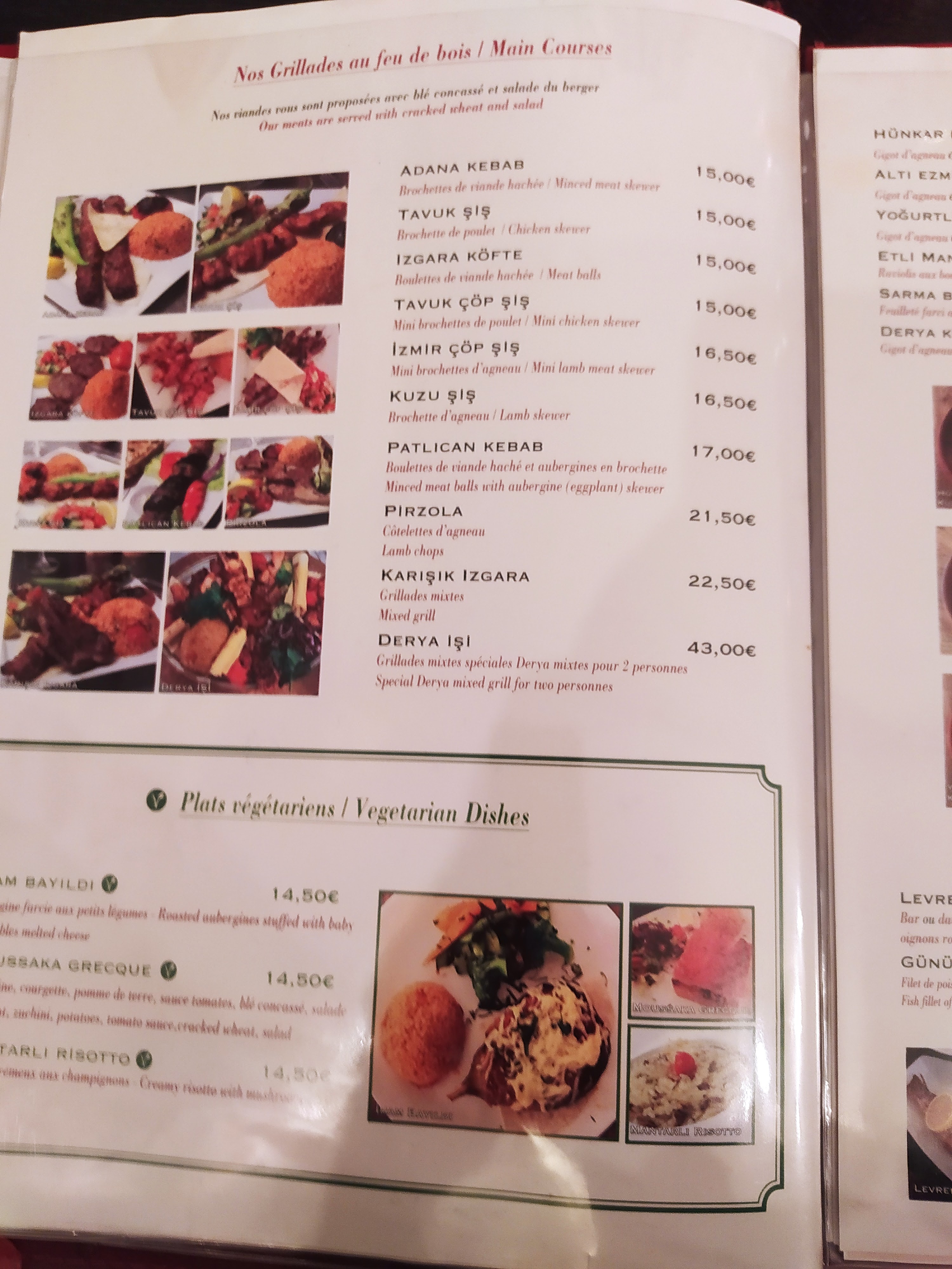 Bon dans la rue il y a foison de restaurants dans la même gamme de prix et pour nous cette foi là ça sera de la cuisine turque chez Derya. Le menu à 15,50 euros entrée, plat et dessert nous a séduit.Le cadre avec sa petite terrasse donnant sur la rue mais ce fût dans la salle avec son mobilier fonctionnel, la prise de commande et le service corrects et souriant, les mets proposés satisfaisant dans le choix. Assiette bien présentée, et quantité suffisante (à signaler pour les gros mangeurs ça ne sera pas assez copieux) pain maison bien chaud en accompagnement. Ici c'est des plats turcs fait maison et bien goûteux, on est loin du kebab donner ou de ses brochettes frites pour cela ça ne sera pas à cette adresse, donc les plats proposés sont du cuisiné traditionnel (ça me rappelle un peu la Turquie et ses restaurants avec cuisine locale).Bel établissement à fréquenter et faire connaitre, j'y reviendrai sans hésiter.