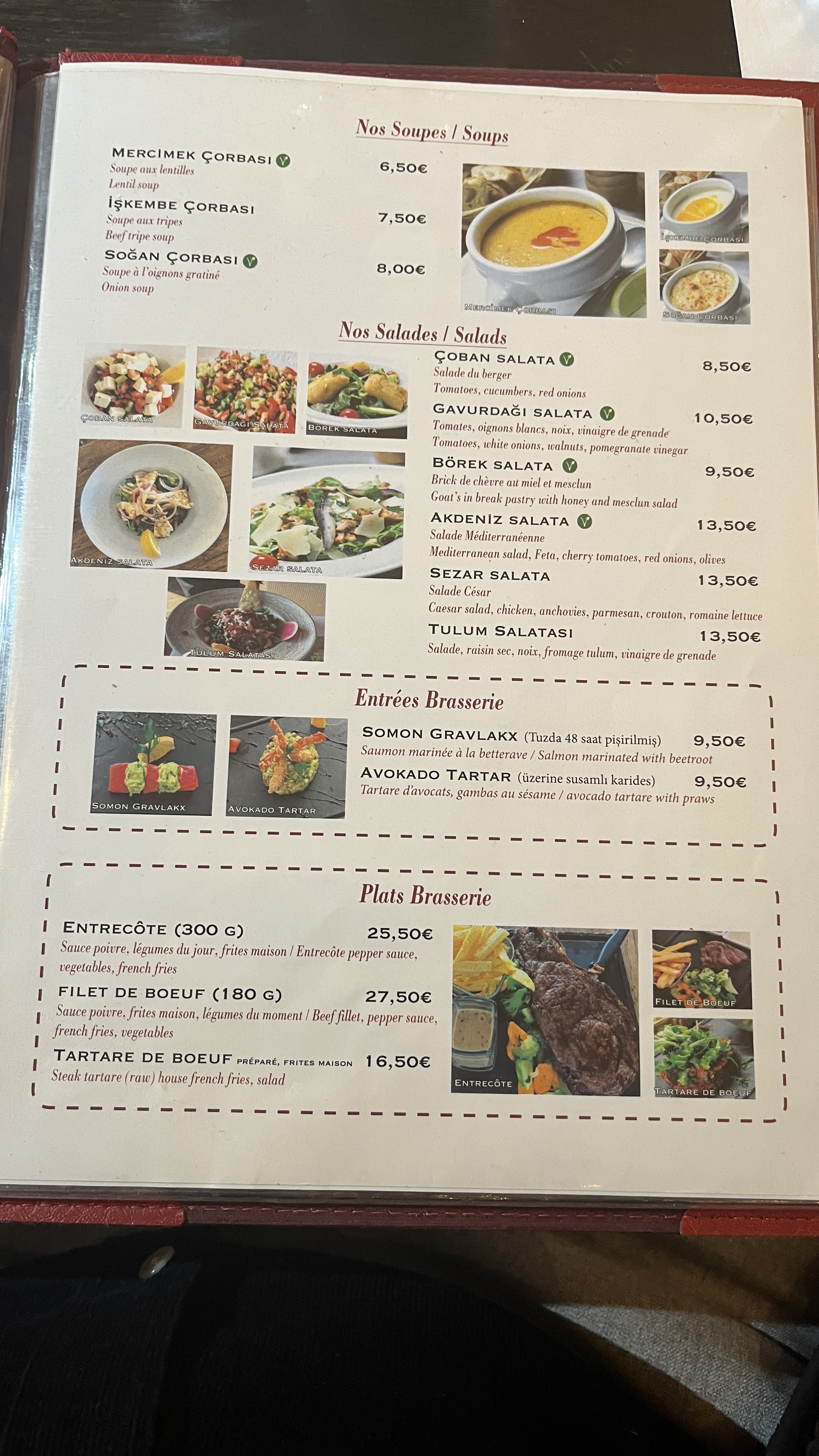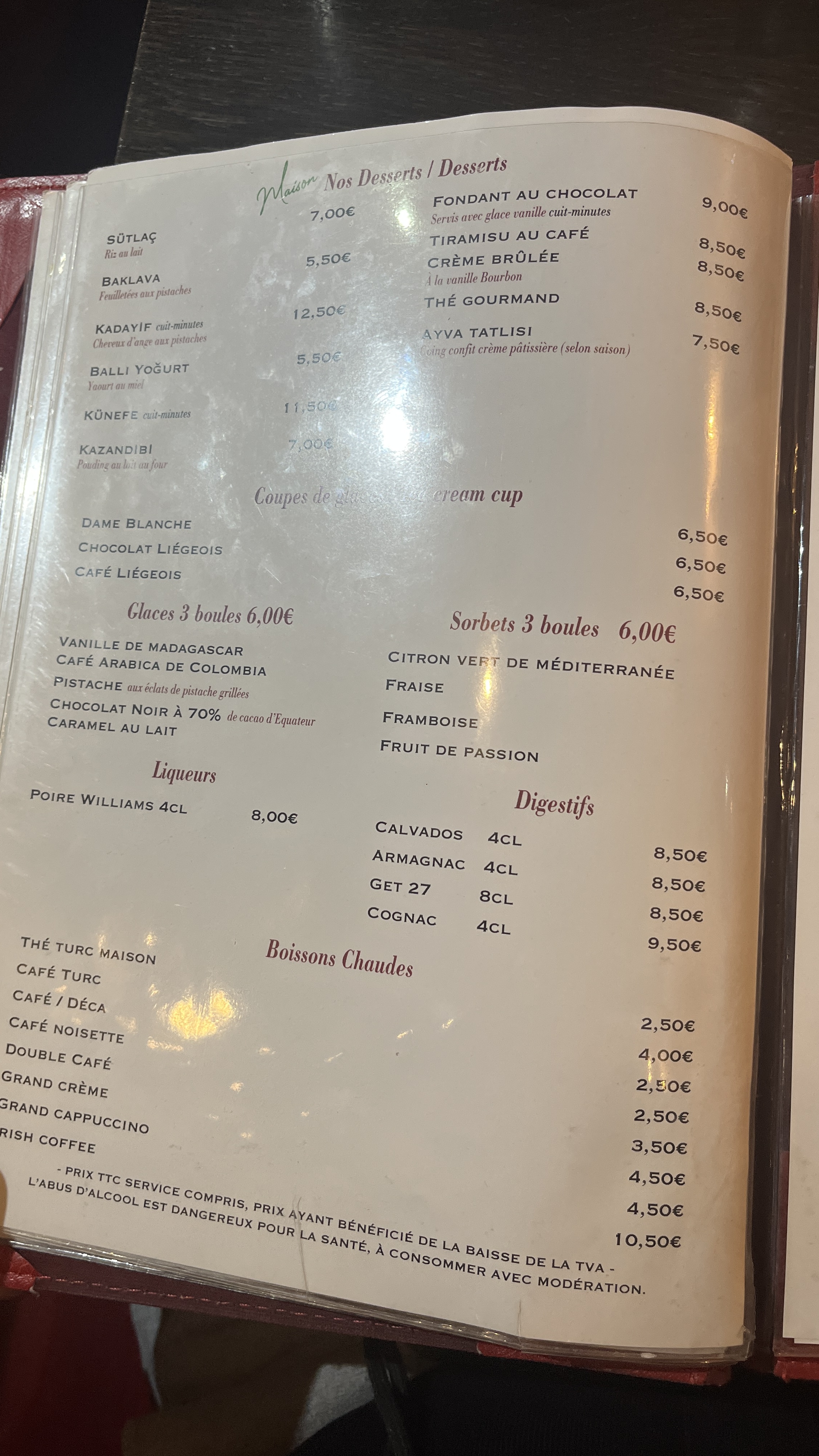 Super restaurant les serveurs sont très gentils très accueillants et courtois. Au menu vous pouvez trouver plein de variétés de meze (entrées froides ou chaudes) et quasi toutes les spécialités turques pour les plats. On a donc pris un mélange d’entrée à 16 euros très abordable pour la quantité c’était très copieux et un mix de viandes pour 2 personnes pour 40 euros a peu près. Tout était délicieux je vous remercie !