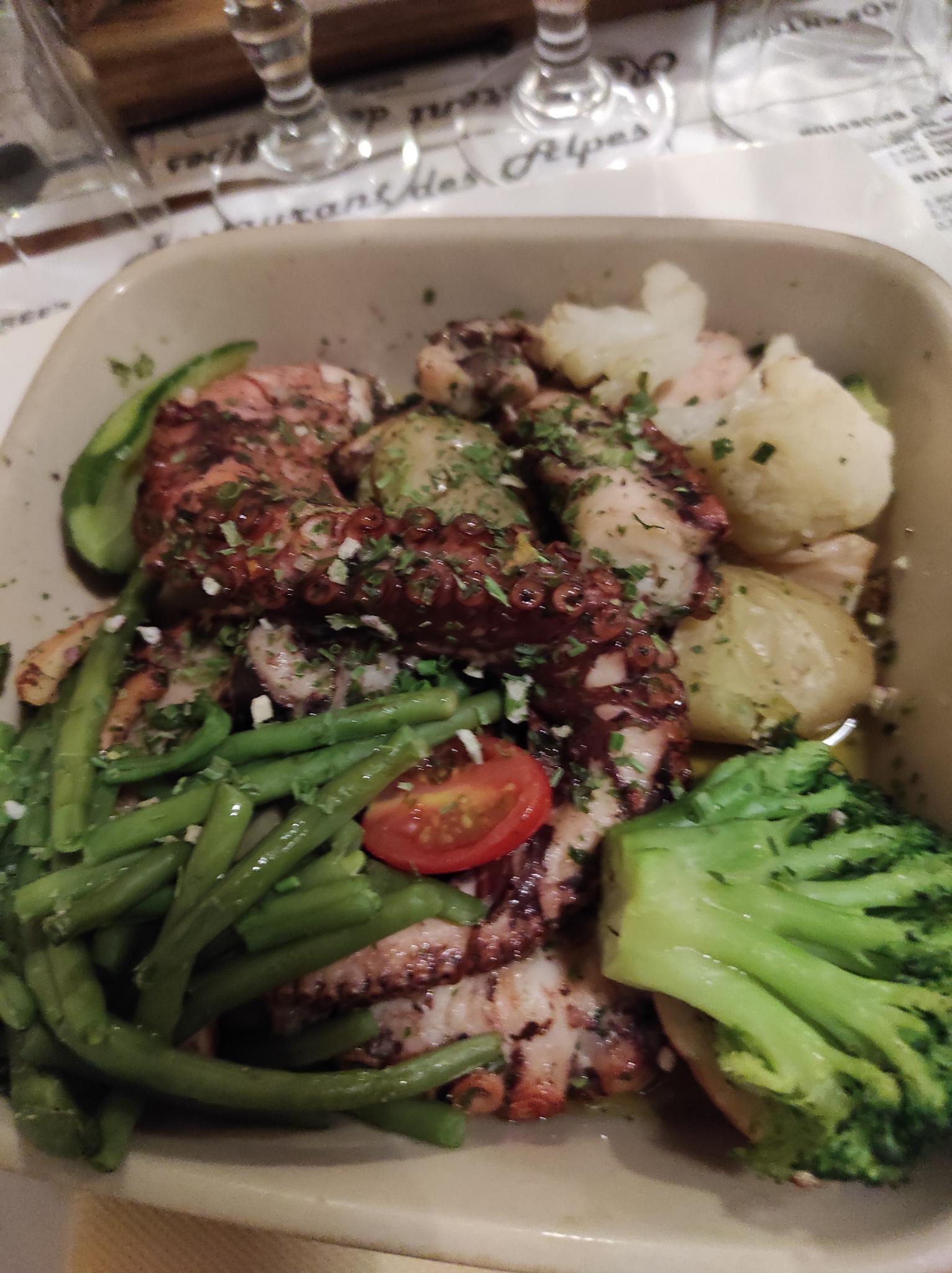 Nous avons dîné chez Tina (Restaurant des Alpes) et nous avons extrêmement bien mangé, c'était absolument délicieux !!! Les serveuses étaient aux petits soins et adorables. Les plats étaient copieux !! Très très bons. Allez y les yeux fermés. Nous avons pris un poulpe, un filet de St Pierre et une mousse au chocolat (les trois étaient des délices).