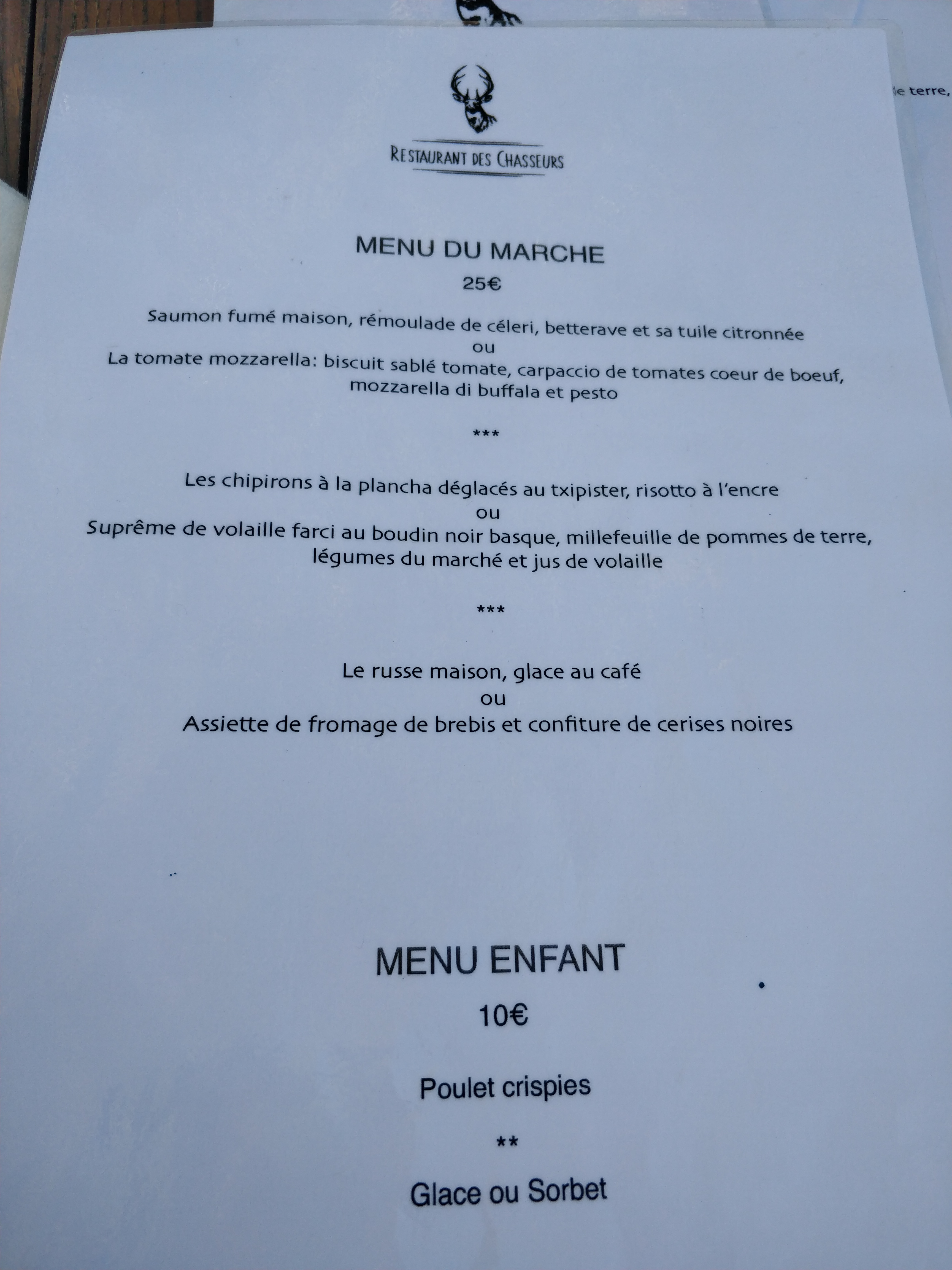 Alors ne vous laissez pas abuser par la référence aux chasseurs, pas de cuisseau de chevreuil ou de civet de sanglier mais une cuisine fine et originale, bien préparée et servie avec le sourire. L'endroit est simplement décoré et le public d'habitués ne s'y trompe pas, le chef connait son métier et vous régale pour un prix très raisonnable. Une belle expérience après le train de la Rhune.