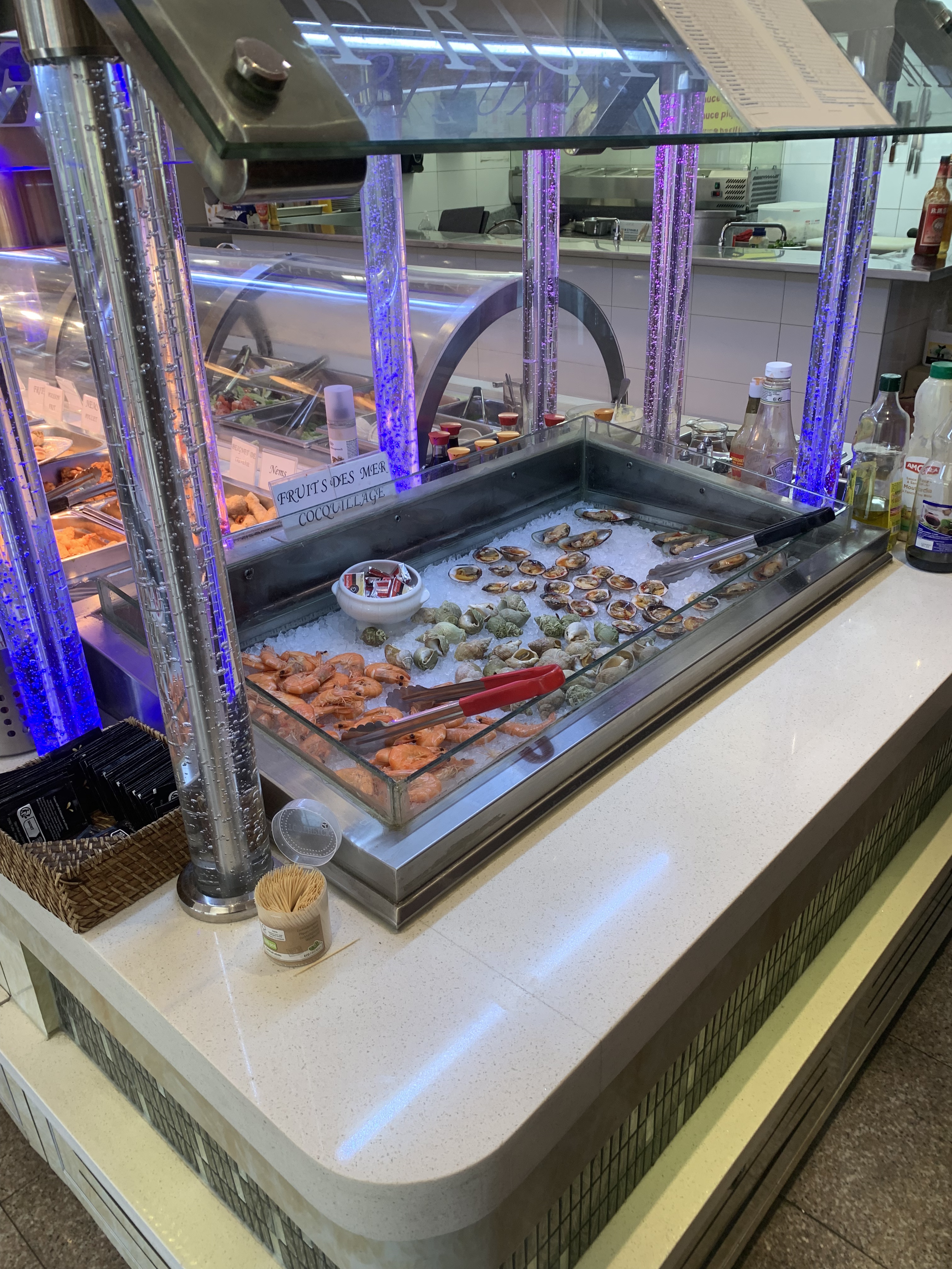 C’est la deuxième fois qu’on y va et franchement c’est délicieux ! Les plats sont très frais : huîtres, poissons, sushis, fruits de mer, légumes et viandes, desserts, fruits. J’adore ! À volonté et un menu défiant toute concurrence ! Le prix est de 15€ le midi et 19€ le soir ! Venir ici manger est un plaisir ! Grande salle et du monde mais agréablement surprise ! À recommander…