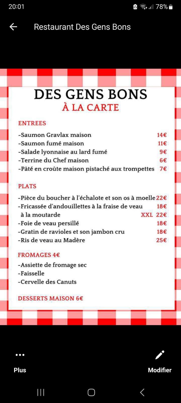 Nous sommes allés manger 2 fois au restaurant des gens bons, super restaurant de qualité. Nous avons pris le flyer pour les fêtes et avons décidé de prendre des plats cuisinés à emporter pour Noël. Description des plats : . portions généreuses . les viandes et poissons avec une cuisson parfaite, moelleuses et de bonne qualité. . sauces faites maison, ça se sent ! Avec du goût Le chef est un pro, il cuisine avec des produits de qualité et sait les mettre en valeur. Finalement, nous avons pris notre repas du jour de l'an. Je recommande ce restaurant.