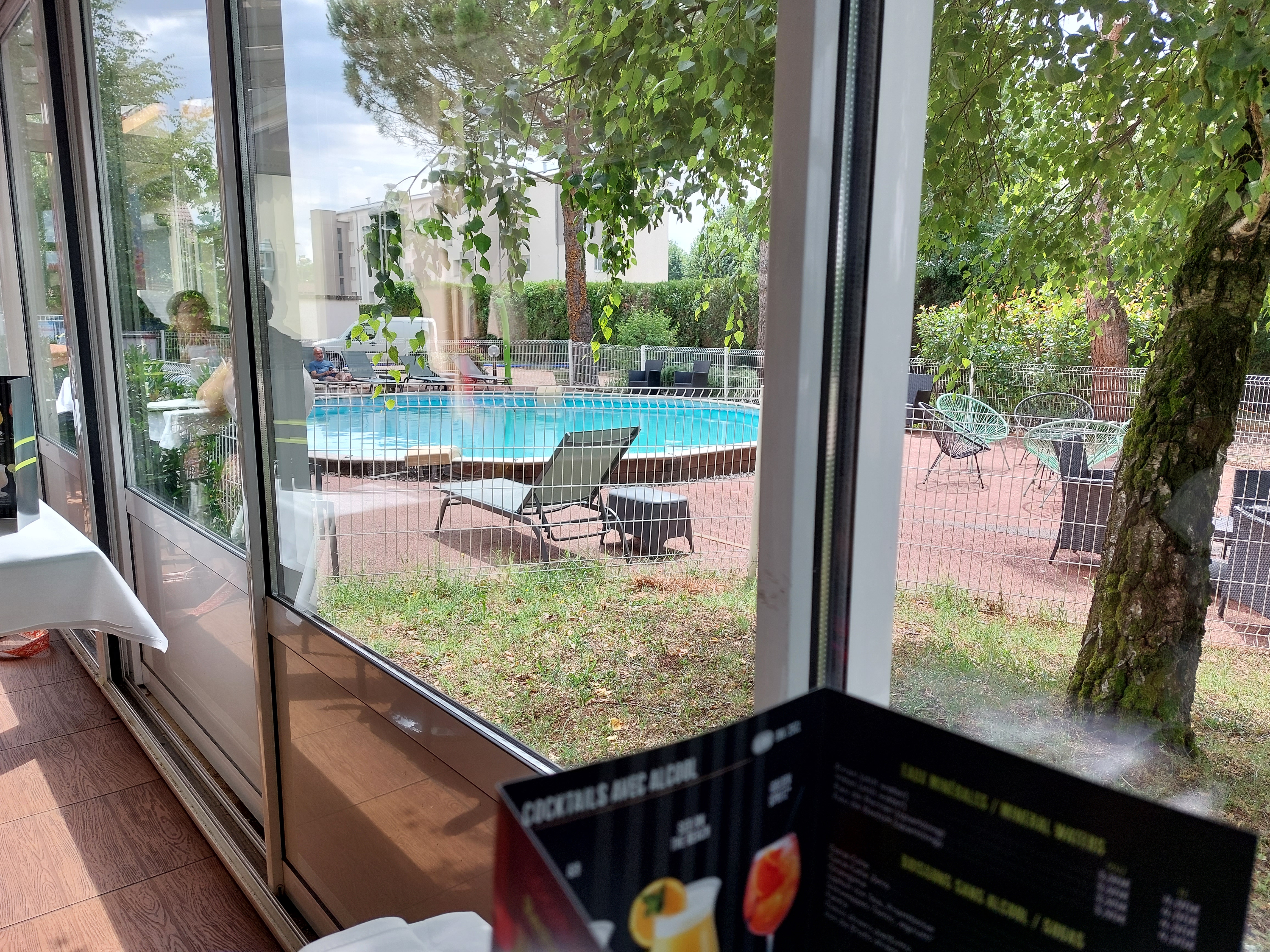 Lieu très agréable avec une belle véranda et vue sur la piscine. Accueil sympathique avec des serveurs de bonne volonté qui manquent un peu d expérience. Les prix sont corrects avec un menu: entrée, plat, dessert à 33 €. Le plat de gambas,saint Jacques est peu copieux . Le filet de bœuf est de qualité, la sauce est peu adaptée pour relever la viande. Les desserts sont très ordinaires,les belles tartes aux framboises ont disparu du menu. A signaler :une belle carte des vins de la Côte Chalonnaise.