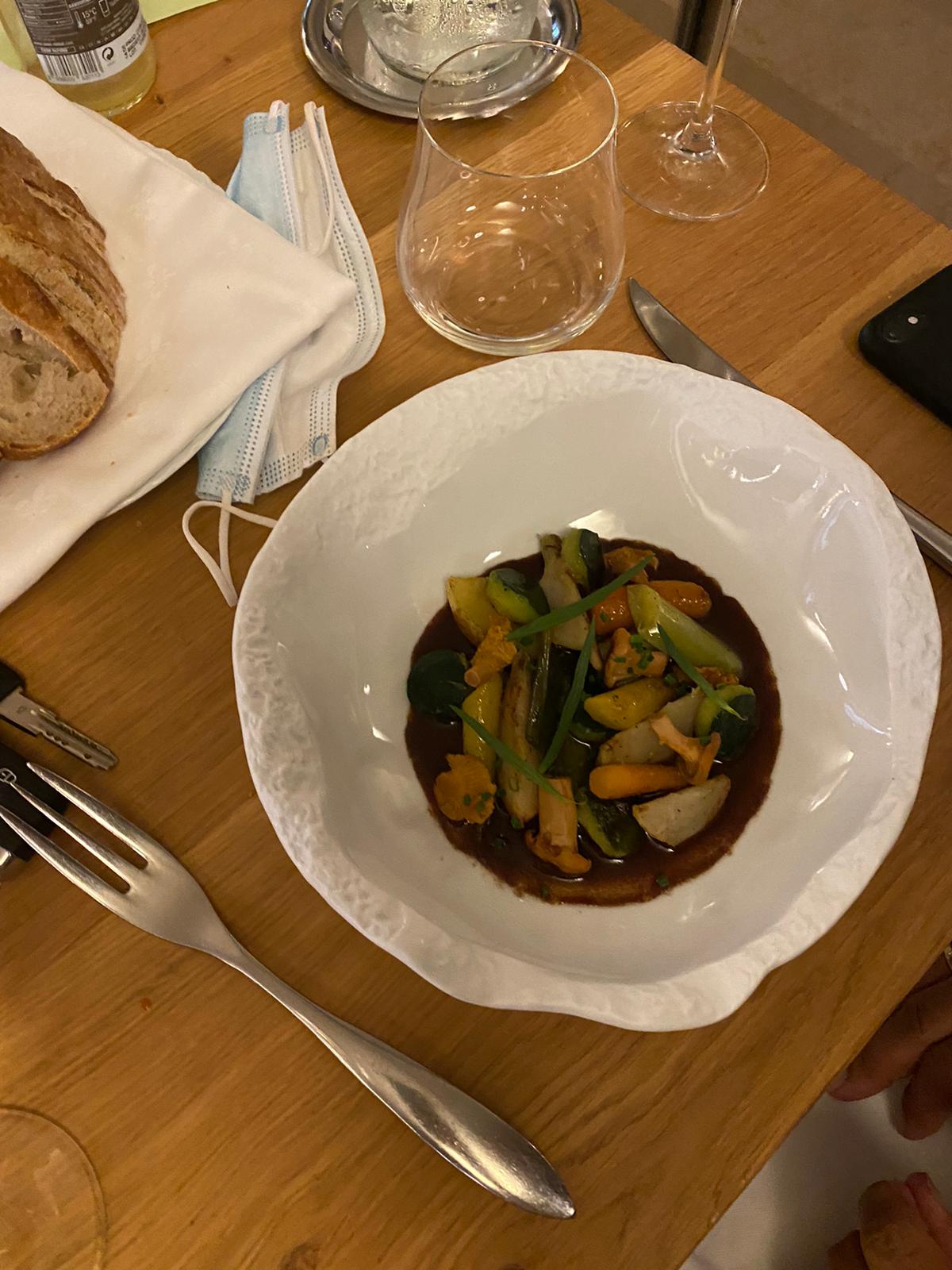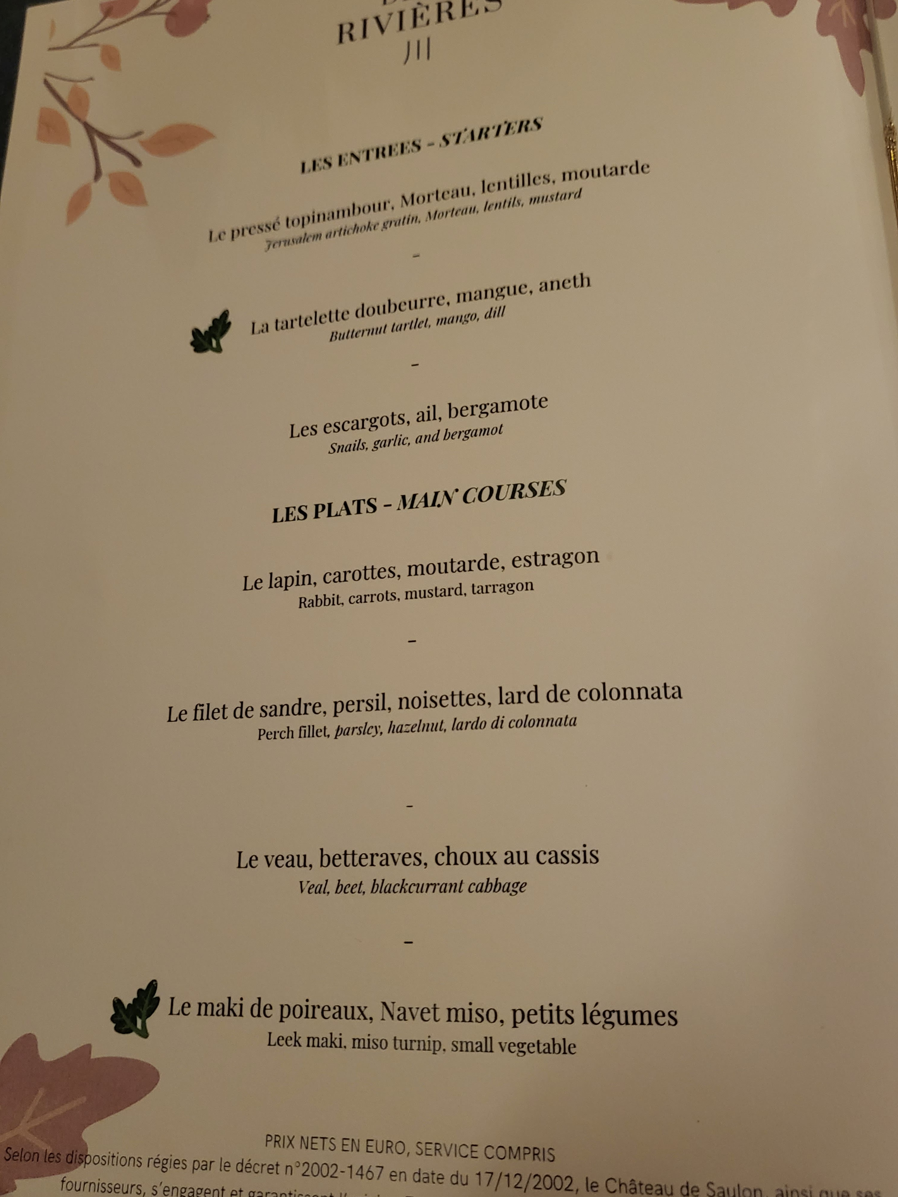 Repas fin et fait avec des produits frais. Beaucoup de changement au château pour notre bien être. J ai apprécié le fait qu'il y ai une permaculture, rare dans un hôtel.