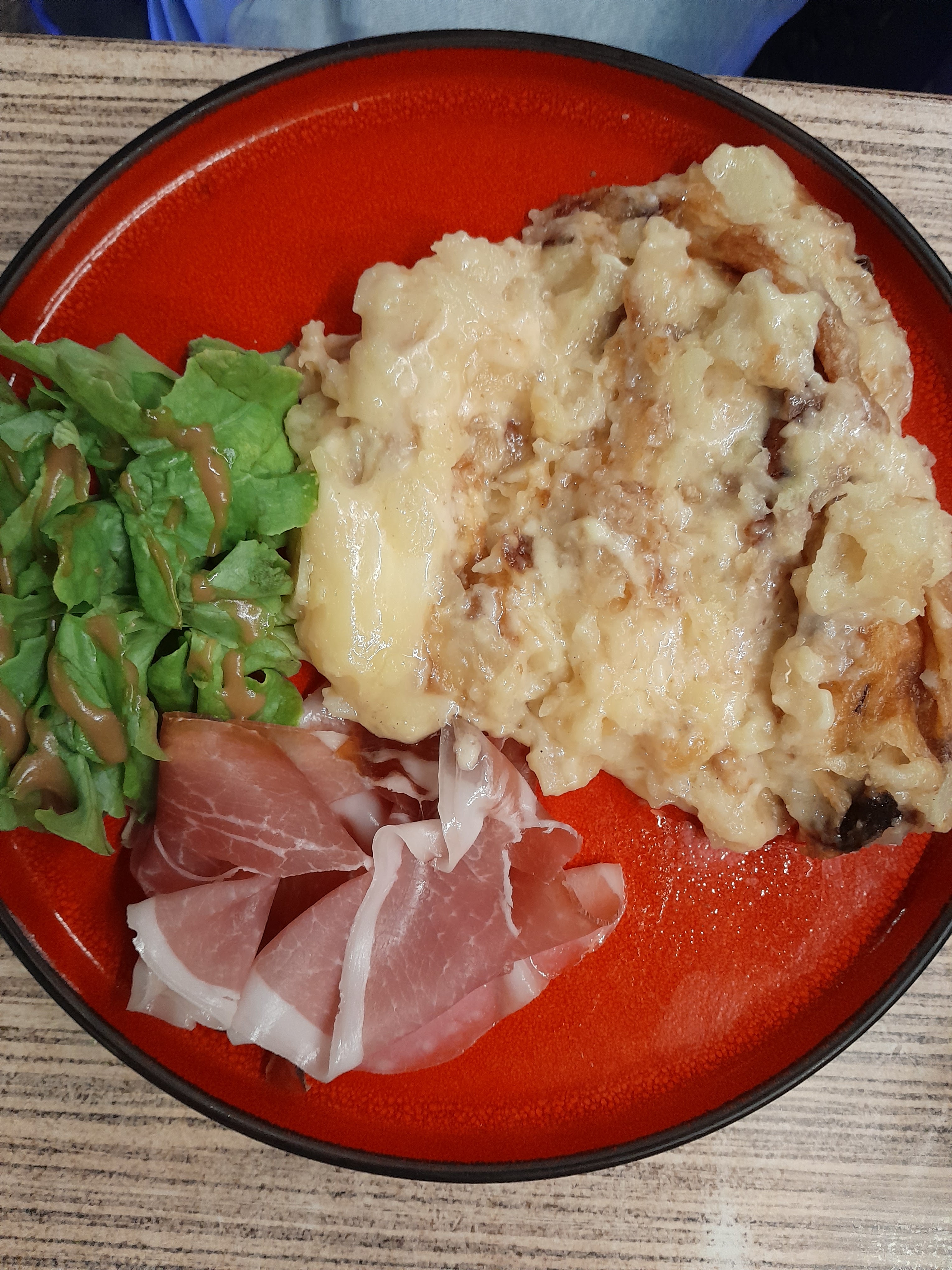 Pas si divin que cela, 2 salades xxl auvergnate commandés, salade en abondance, 2 tomates cerises coupées en deux, 2 cerveaux de noix, un oeuf coupé en deux, et sacrilège obligé de réclamer le jambon de pays, en désert, spécialité de la maison pour ma femme, très écoeurant, et moi une Pavlova aux fruits rouges avec du pesto, je ne recommande pas cet endroit,