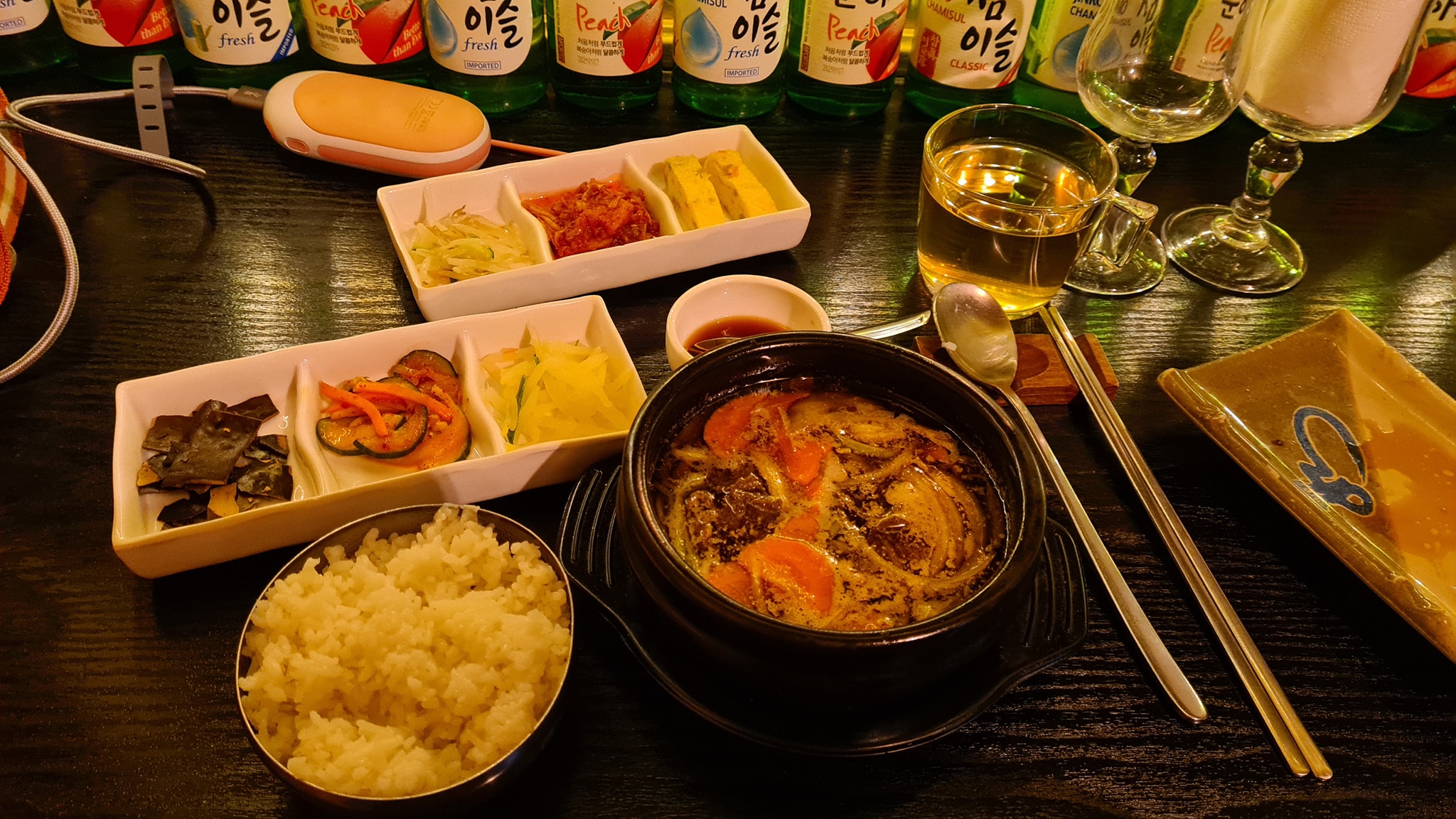 On a mangé avec ma conjointe un samgyeopsal et un ragoût de bulgogi. Le plat est arrivé avec beaucoup d’accompagnements ! Je recommande vivement car les portions sont généreuses et on a été très bien accueilli. Mention spéciale pour le petit cadeau (2 verres d’aloe vera et 2 bonbons) au moment de la note.