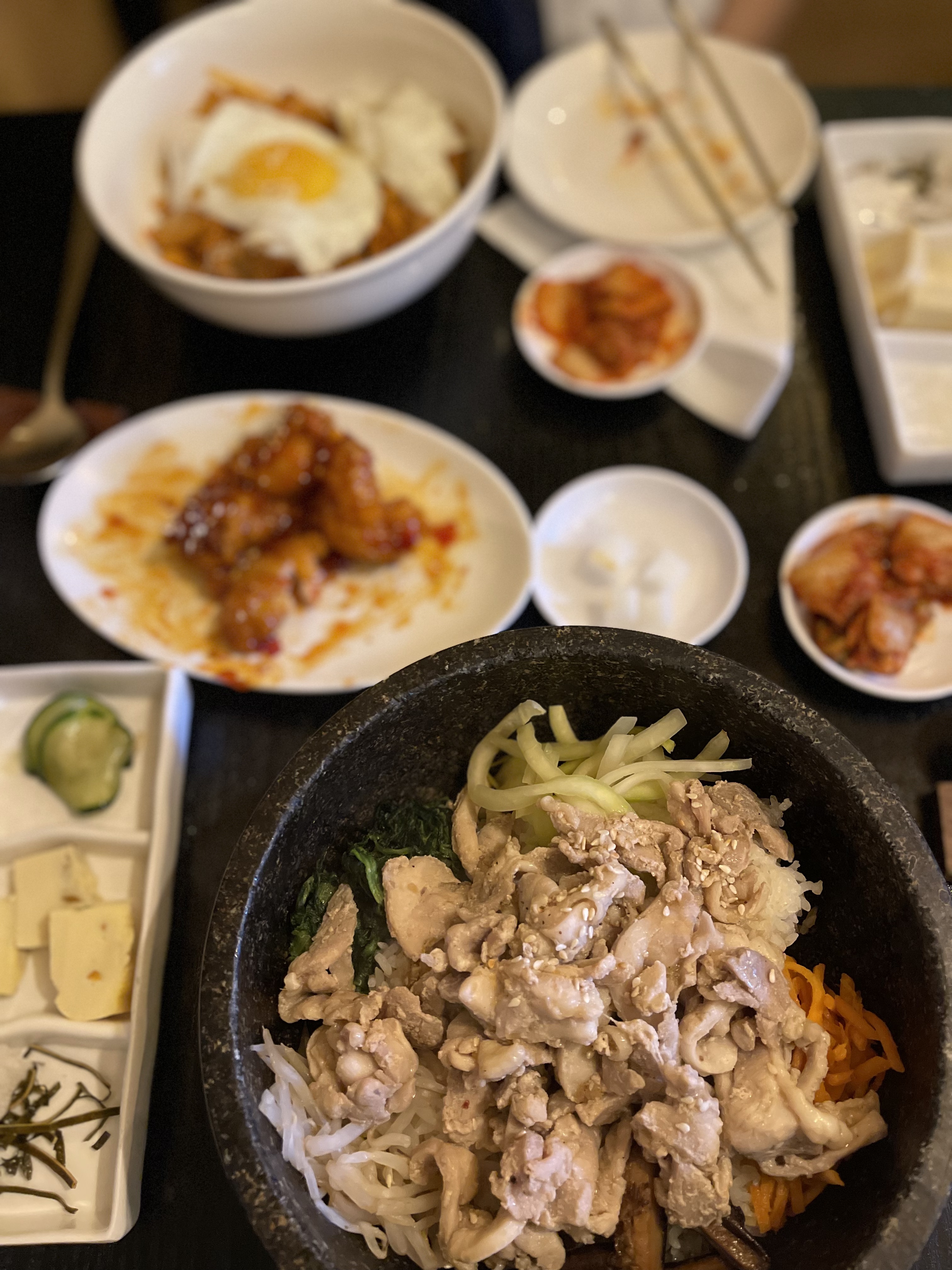 Personnel super sympa et souriant, mais notre serveuse était trop submergé par les clients? du coup elle ne nous a pas proposé à boire et j'ai du demander 3 fois pour avoir ma sauce soja. -Malheureusement les plats n'arrivaient pas assez vite trop d'attente entre les entrées. - J'avais pris le menu du soir avec un bibimbap qui n'était pas suffisamment assaisonné dommage. Par contre le poulet dans l'entrée était MAGNIFIQUE.