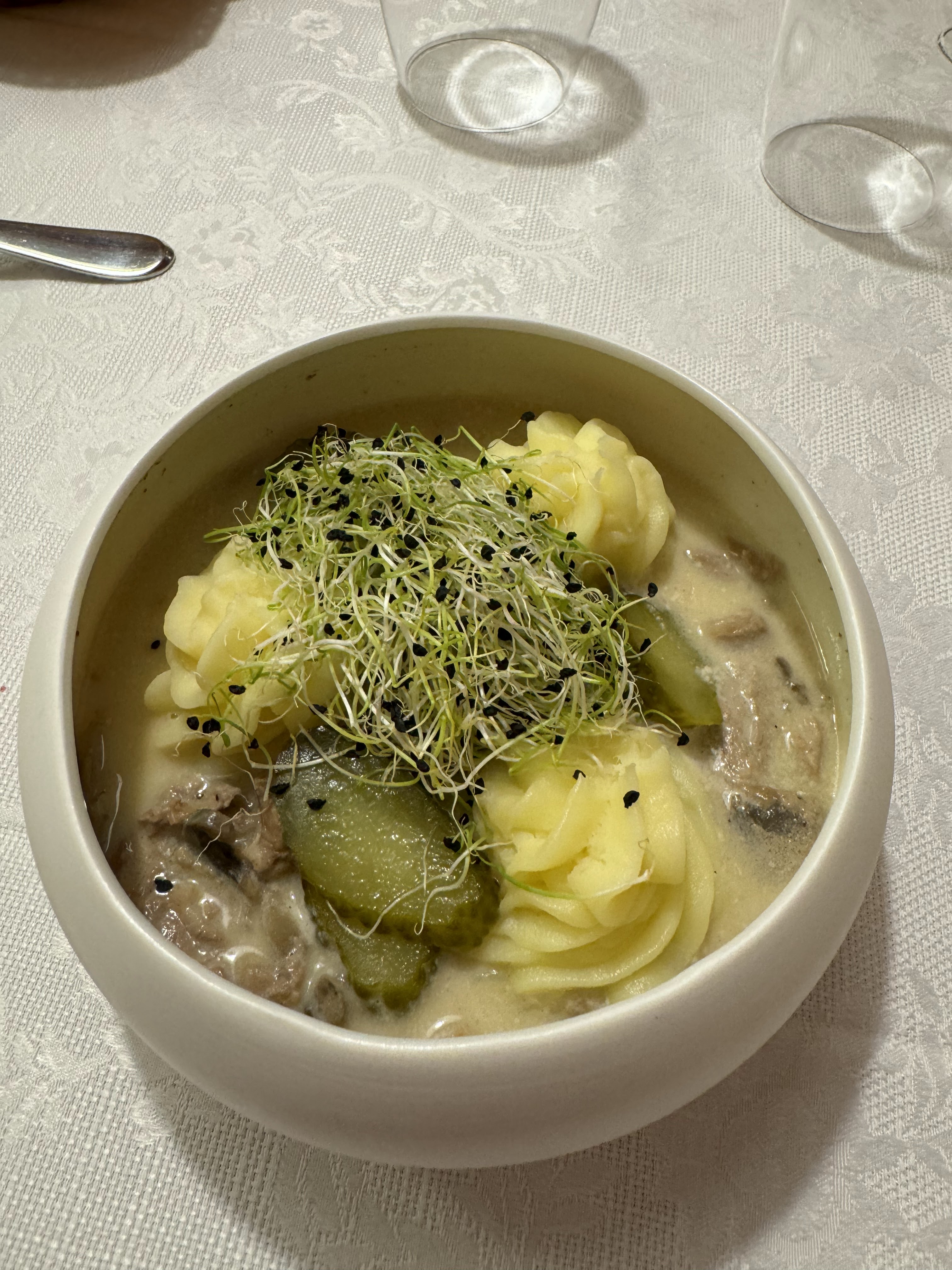 Top du top, servi par Serguei qui nous avait prévenu que la maison nourrissait bien ! Pourtant à l'arrivée du dessert (un Napoléon) j'ai pris un fou rire avec la famille tellement c'était énorme ! Plats géorgiens et russes excellents. Merci c'était un bon moment et on reviendra à coup sûr.