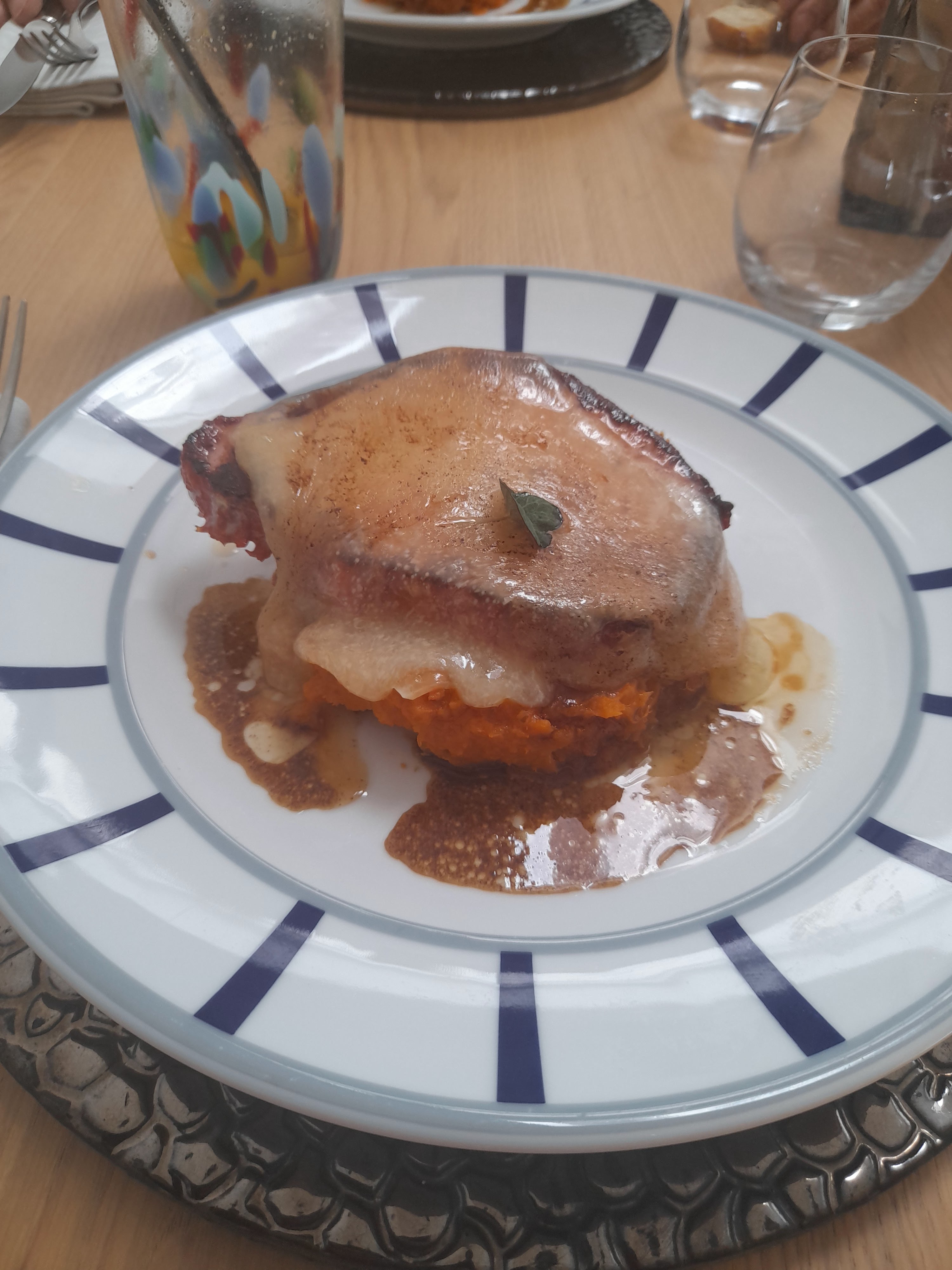 Vue magnifique, plat un peu sophistiqué mais très bon. Choisir les produits régionaux pour se régaler devant le bocage Basque.