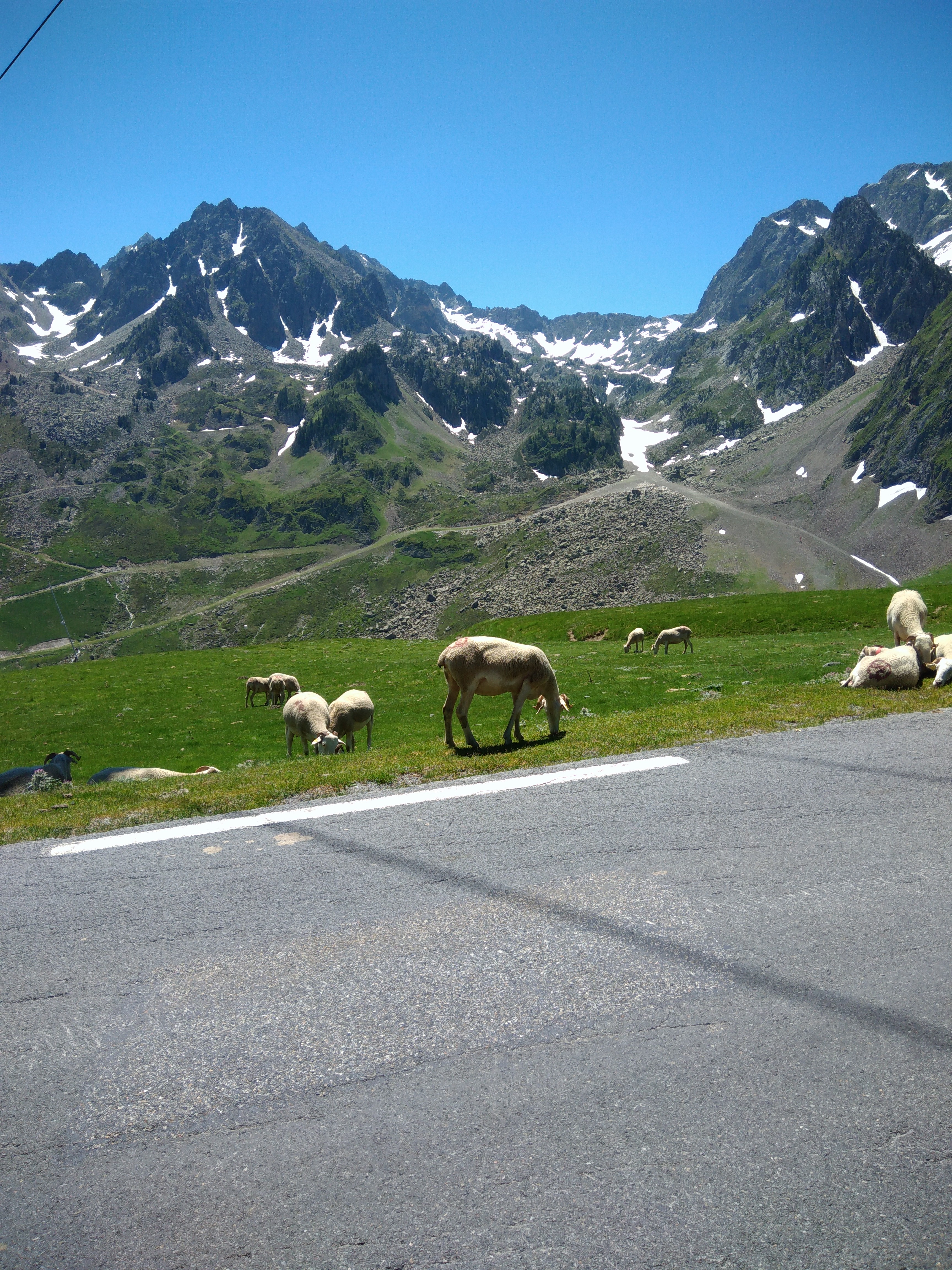 C est magique, la montée avec les vaches et les moutons sur la route du col côtoyant les cyclistes et les voitures vue splendide