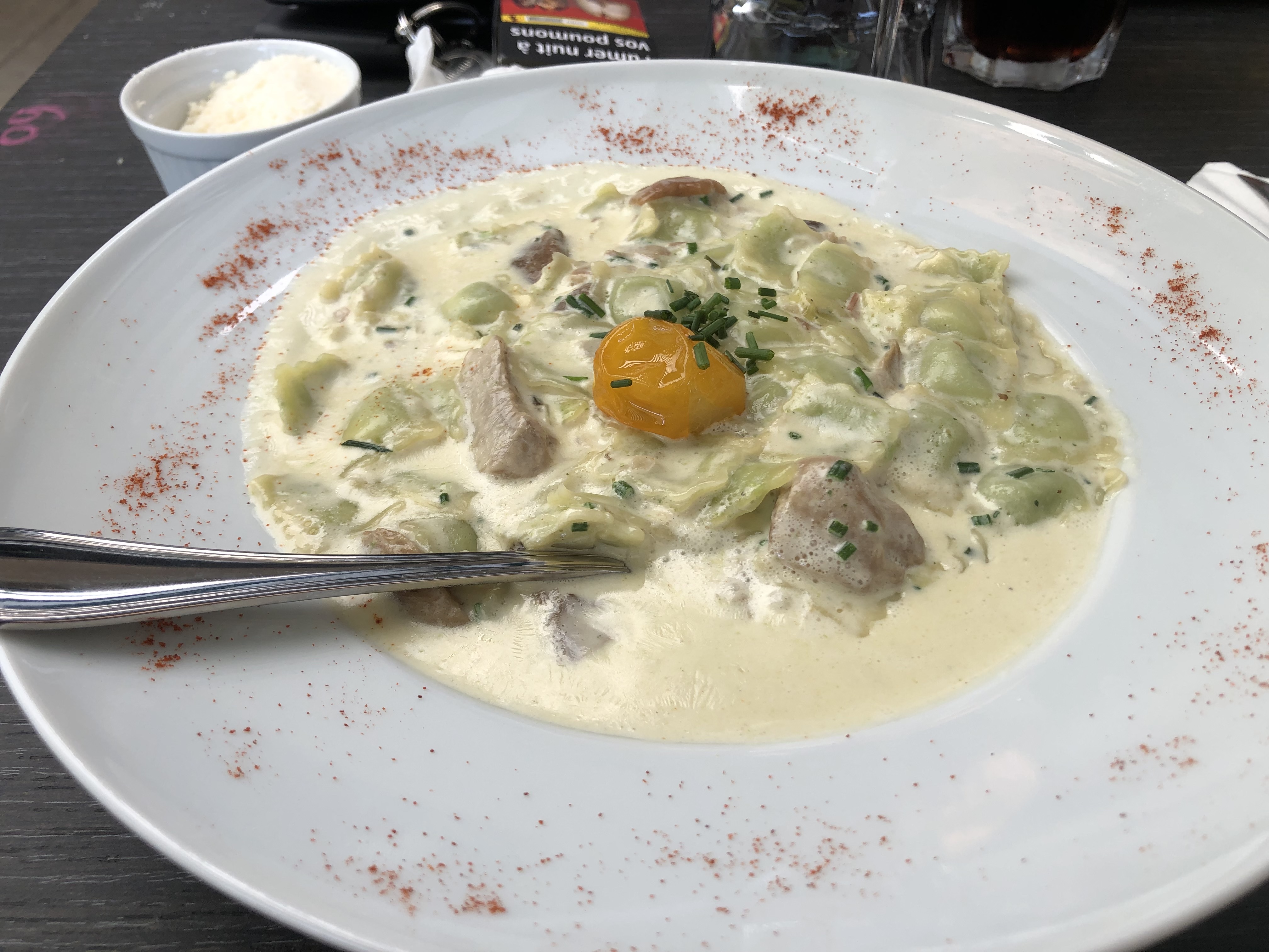 La cuisine est vraiment excellente ! Mais il est dommage que le service soit un peu trop impersonnel vu le prix. On en a eu pour 103 euros pour deux entrées , une assiète de ravioles et un fish and ships, deux desserts et 3 verres de vin. A la fin le patron (j'imagine) a failli m'encaisser 70 euros en plus (173 €) et n'a pas tenu compte des menus, mais a facturé le tout à la carte. Je n'y retournerai plus alors que depuis 20 ans j'aimais manger là bas pour pas cher, dans un tres beau contexte extérieur avec une petite rivière. Je trouve dommage que le travail en cuisine soit effacé par tant de soucis en terrasse.