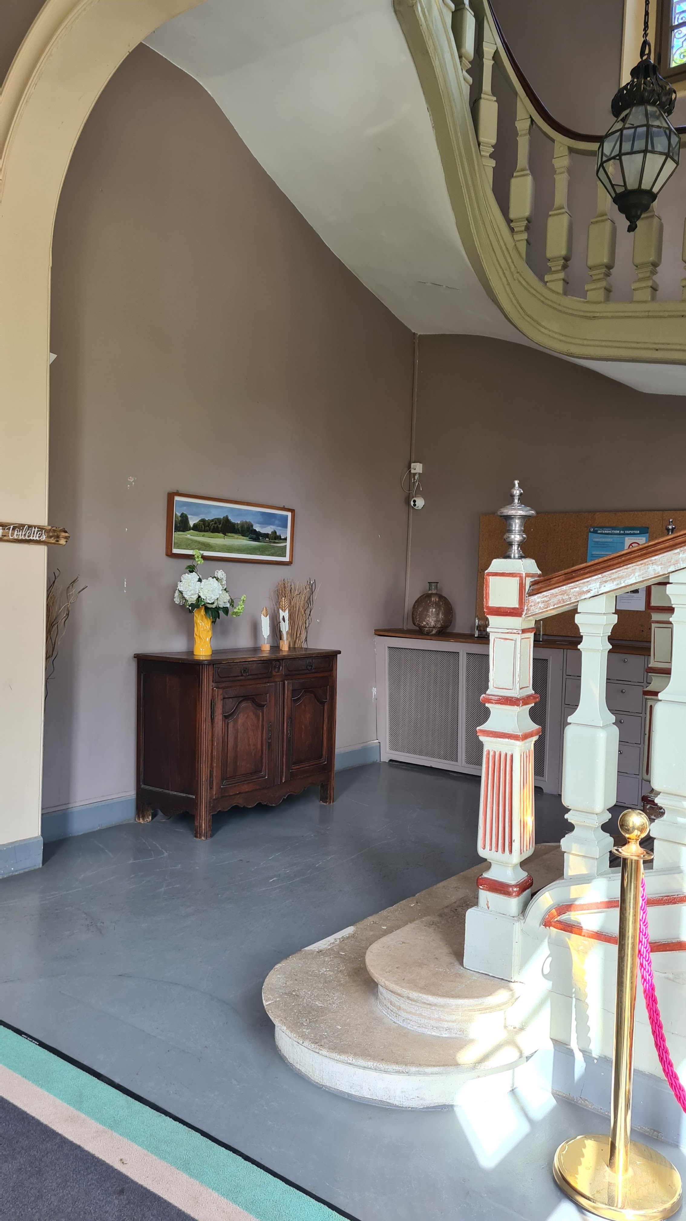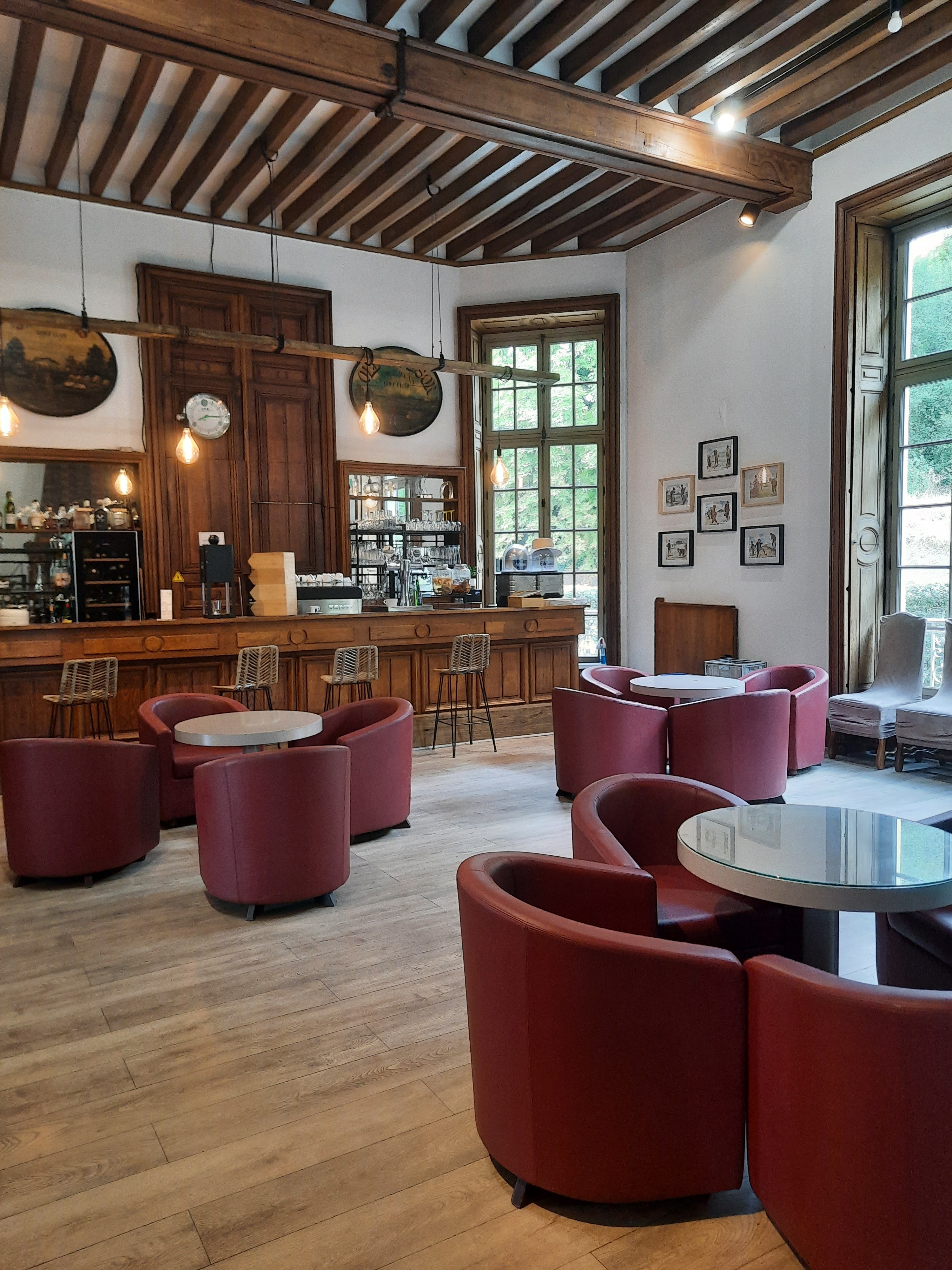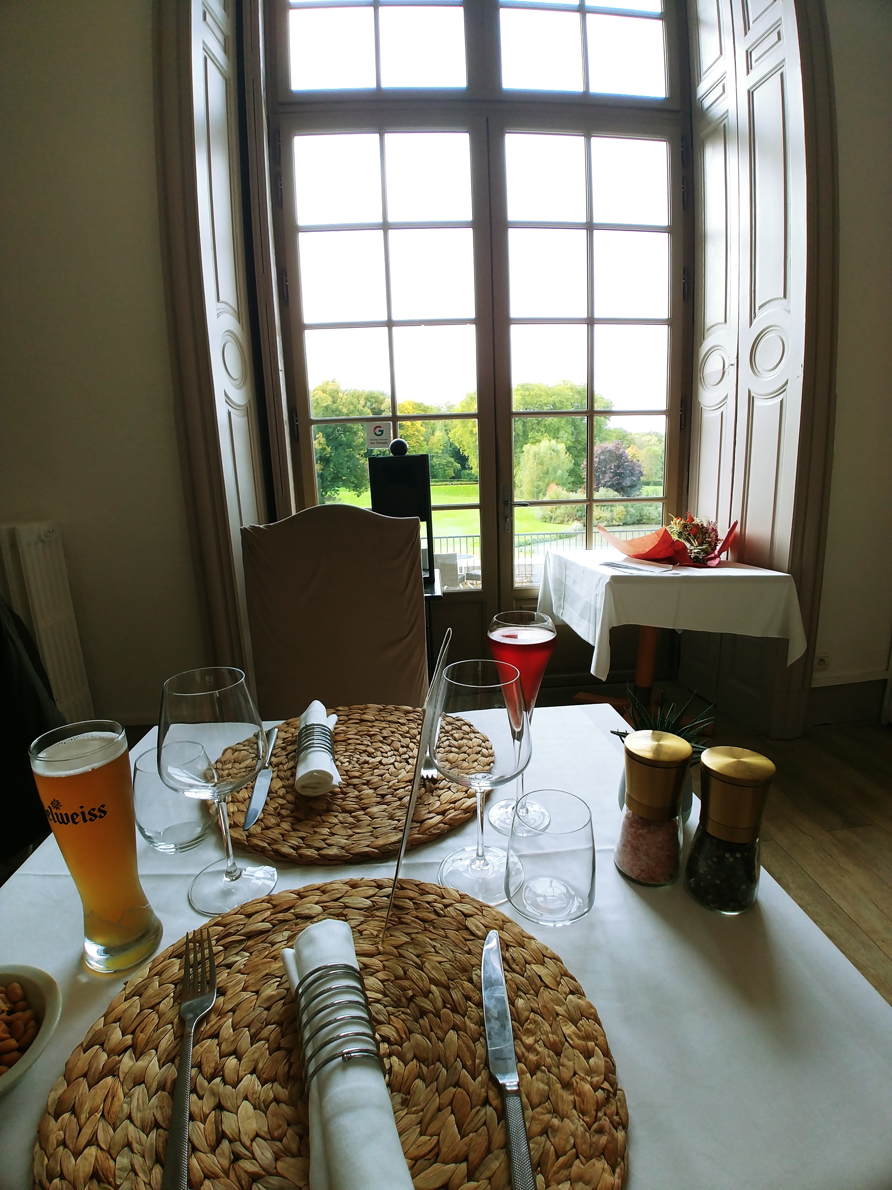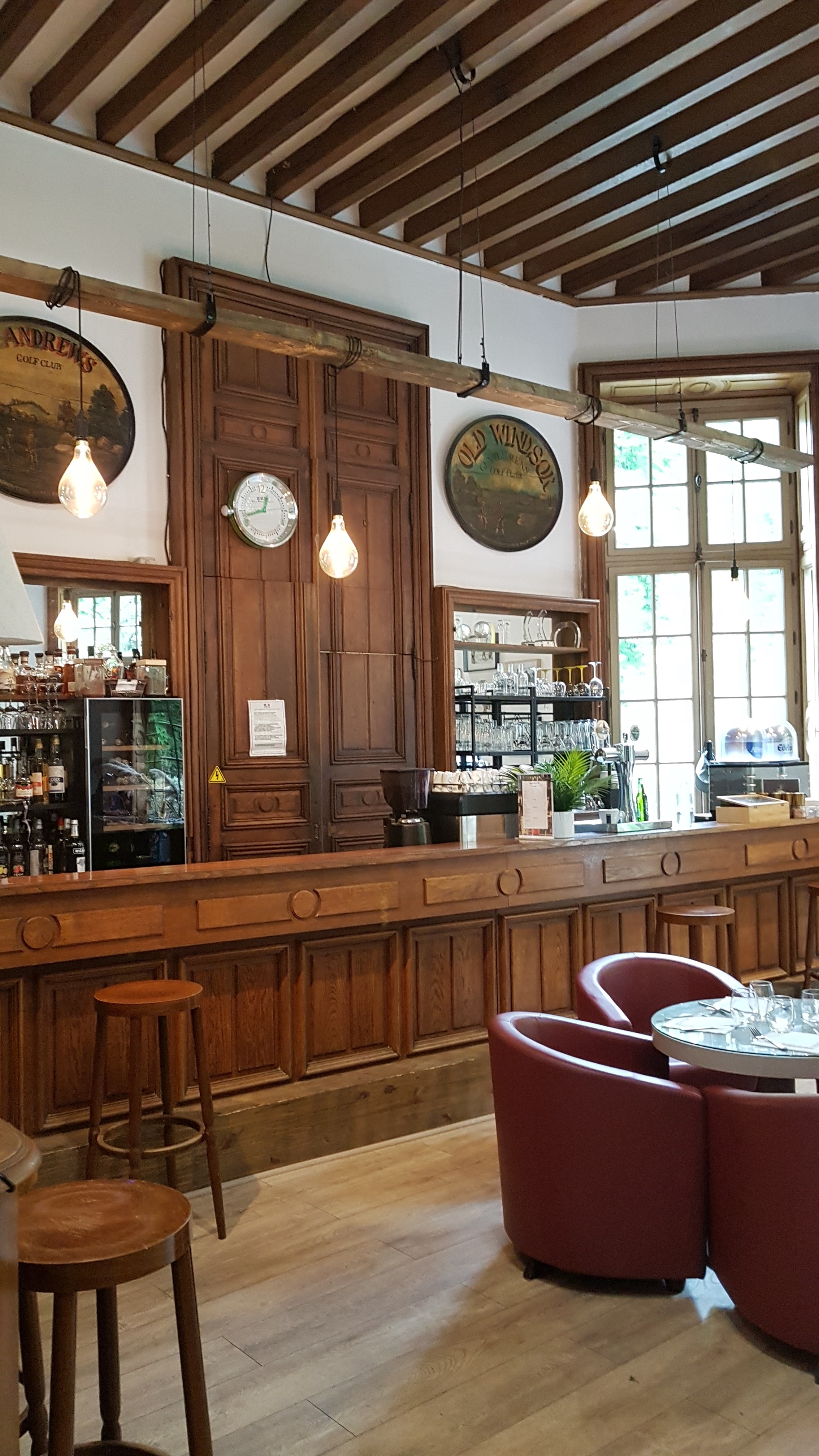 Cela faisait un moment que nous n’étions pas venus et nous avons noté quelques points positifs et négatifs. Tout d’abord le cadre reste inchangé avec un château, sa belle terrasse et son golf. Nous avons cette fois mangé dans la première partie, face au bar. Un peu déçu de cet emplacement qui n’est pas dans la salle principale et dont le mobilier est composé de tables de terrasse ou autres mobiliers plus adaptés à un lobby. Le menu proposé E+P est à 29€ ou E+P+D à 36€. L’entrée est une bonne surprise avec ses gambas et sa sauce aux truffes. En plat le faux-filet est tendre mais les frites sont décevantes et sans saveurs. La sauce au poivre n’a rien d’exceptionnelle non plus…dommage. Ah une chose à faire remonter, s’il vous plaît, arrêtez avec ses paniers format friteuse pour les frites. Cela est digne d’un Flunch ou Courte-paille (sans jugement). En dessert la crème brûlée est simple également (bon il y a un macaron dessus et?). Sinon il y a un financier aussi mais là encore…moyen. La machine à café était en panne aujourd’hui et le café de substitution (très light) était offert de ce fait…bonne initiative et logique. Globalement cela passe très bien mais manque d’originalité ou de raffinements. Niveau service, personnel présent et rapide. Allez il manque peut être quelques conseils sur les plats mais c’est chipoter. Il y a du mieux par rapport à notre dernière visite au changement d’équipe (ou propriétaire) car nous avions été très déçu. Nous reviendrons… :)