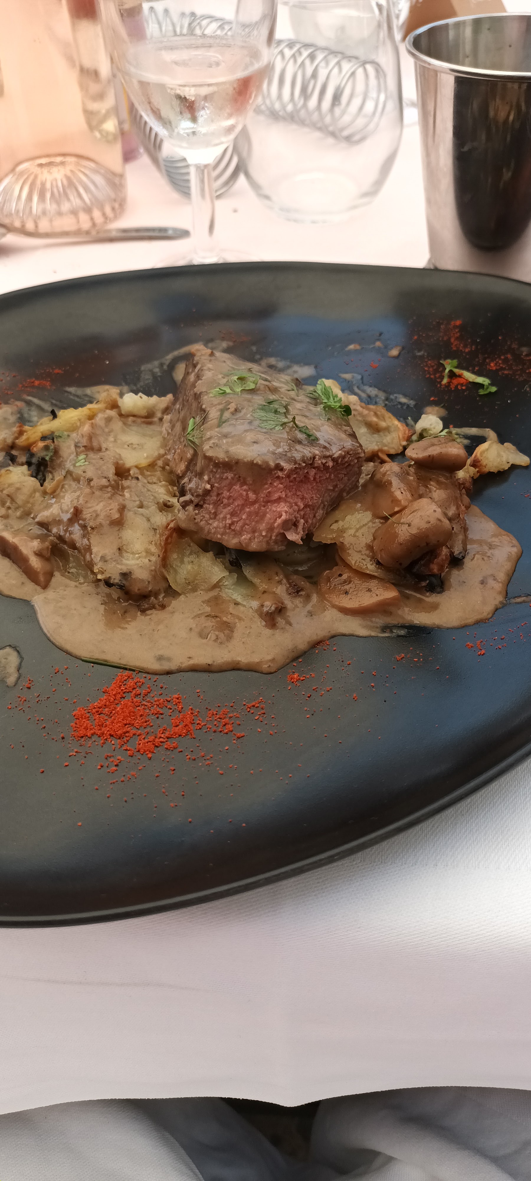 Une superbe expérience.. Cadre idyllique autour du Golf. Noix d'entrecôte black Angus avec un croz hermitage un délice