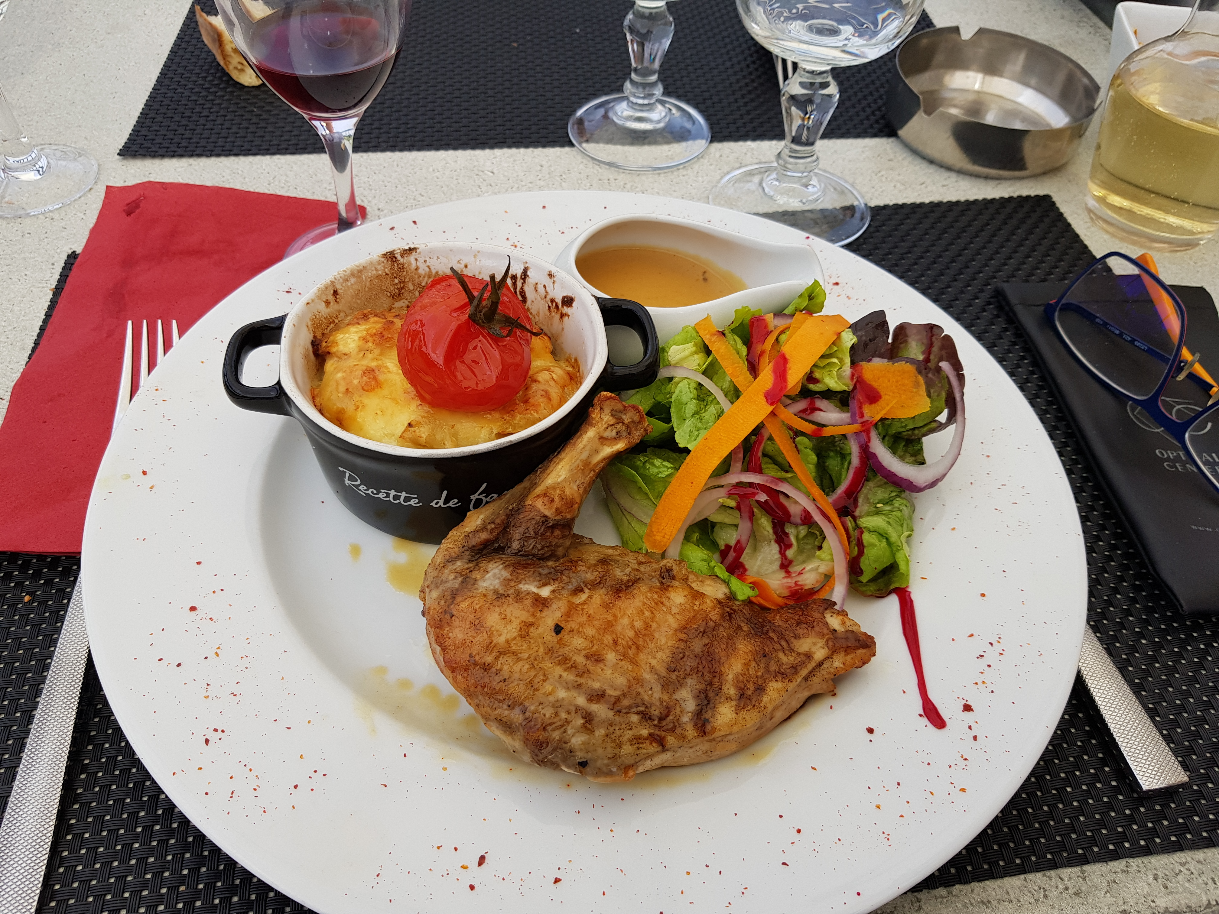 Très bel environnement, belle salle et bon accueil Les entrées (millefeuille d’aubergine et croustillant de poulet), les plats (saumon et suprême de poulet), les desserts (pain perdue et tartelettes) étaient tous bons et bien servis