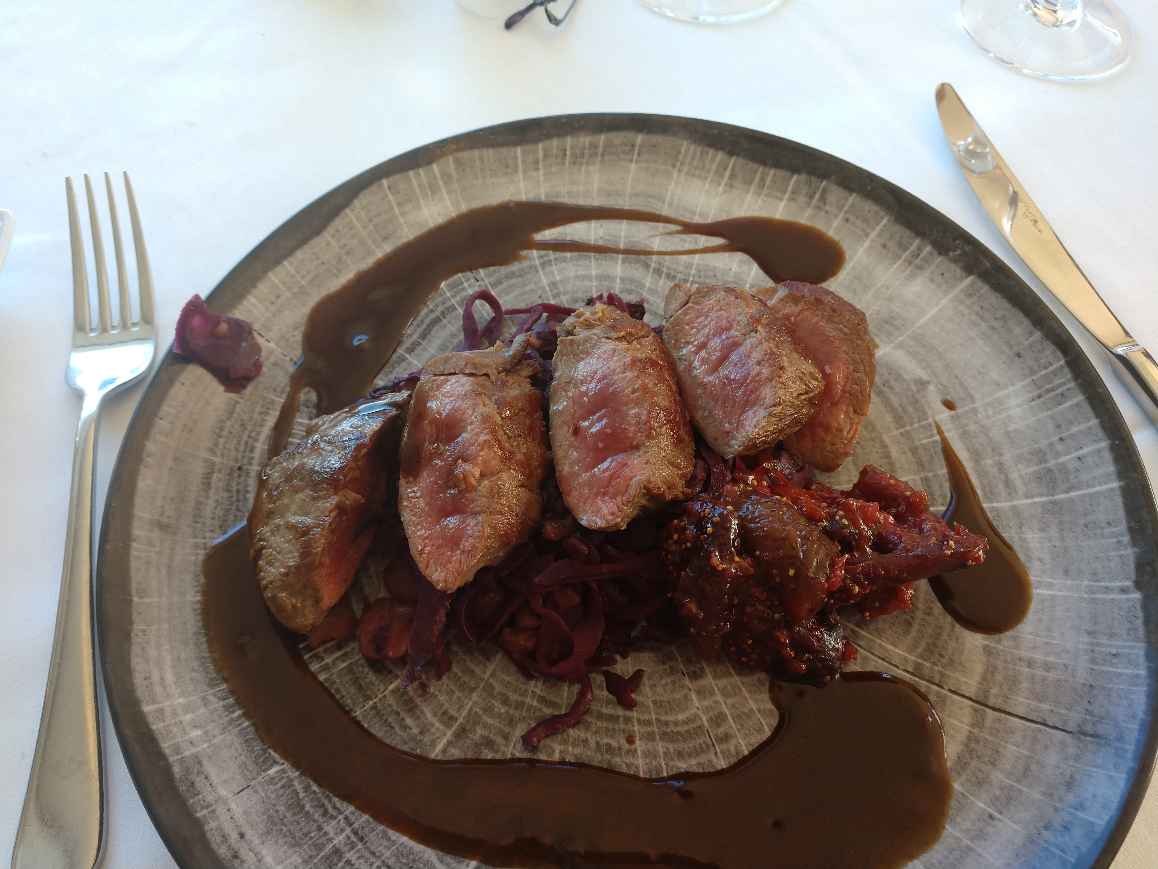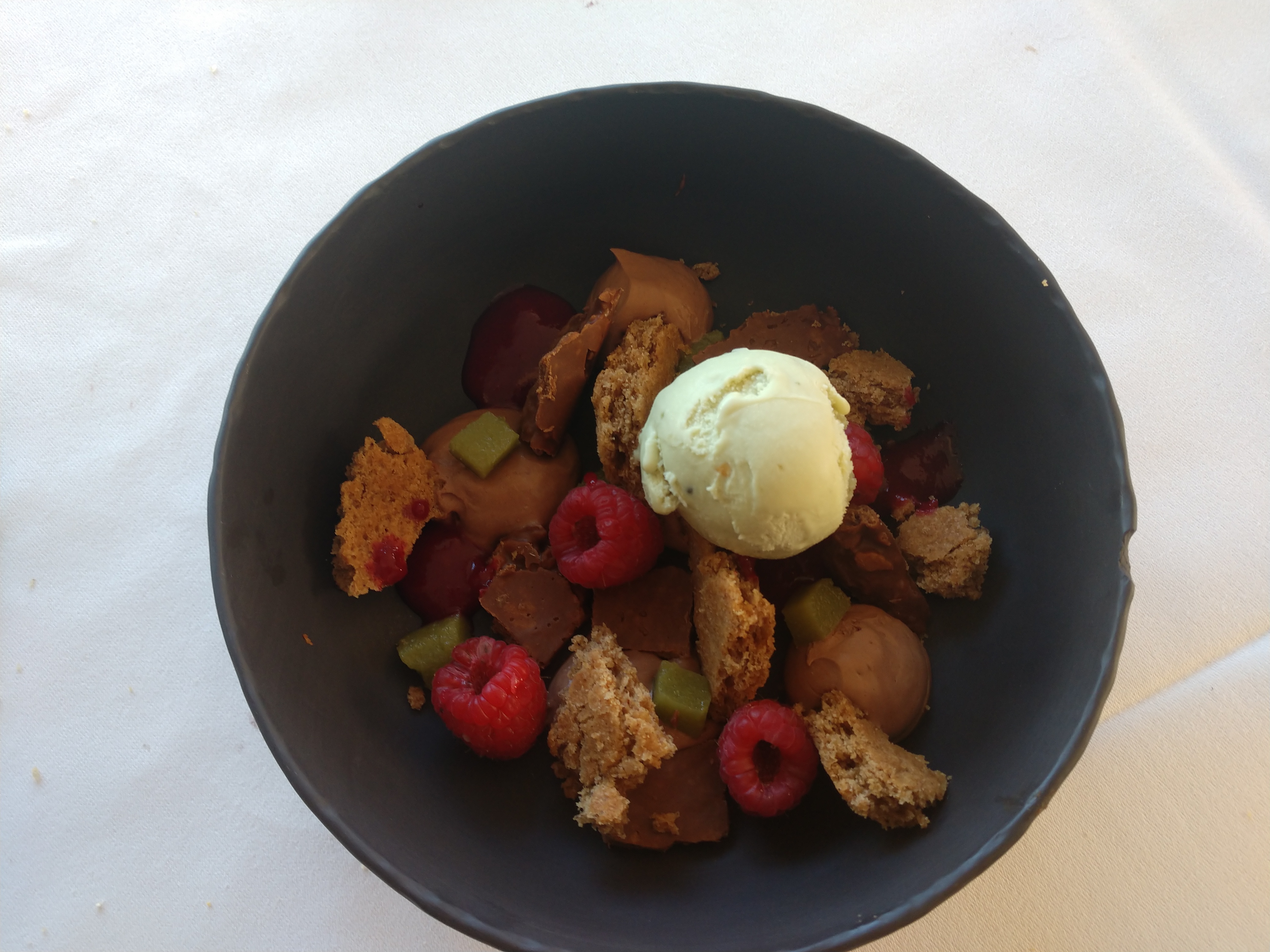 Vraiment un excellent service avec une vue magnifique, que vous dîniez à l'intérieur ou à l'extérieur. J'ai eu le gibier qui était tendre et savoureux. Ils ont dit que c'était du renne mais je pense que c'était du gibier. Le désert était un superbe mélange de fruits et de biscuits émiettés avec de la glace à la pistache. Un excellent dessert, bon goût et pas trop copieux.