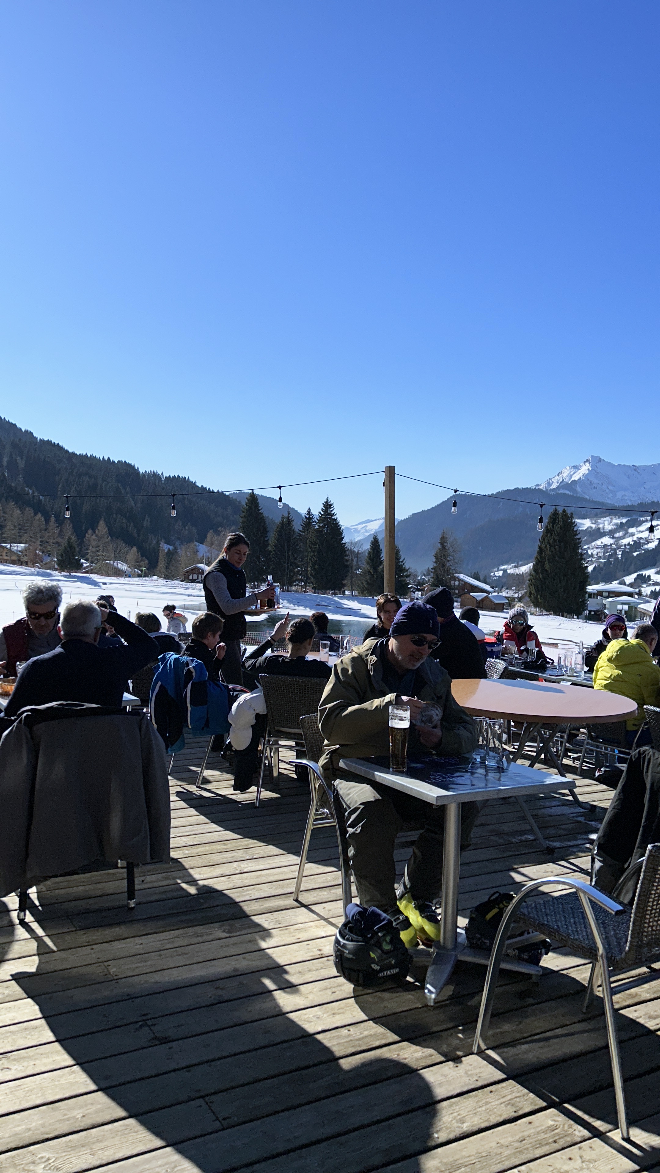 Bel endroit pour prendre un verre en rentrant au village en fin d'après-midi. Cependant, cette année, faute de neige, la Rouge a été fermée et on ne peut pas traverser la Bleue. Nous avons dû monter le bus et redescendre à pied.